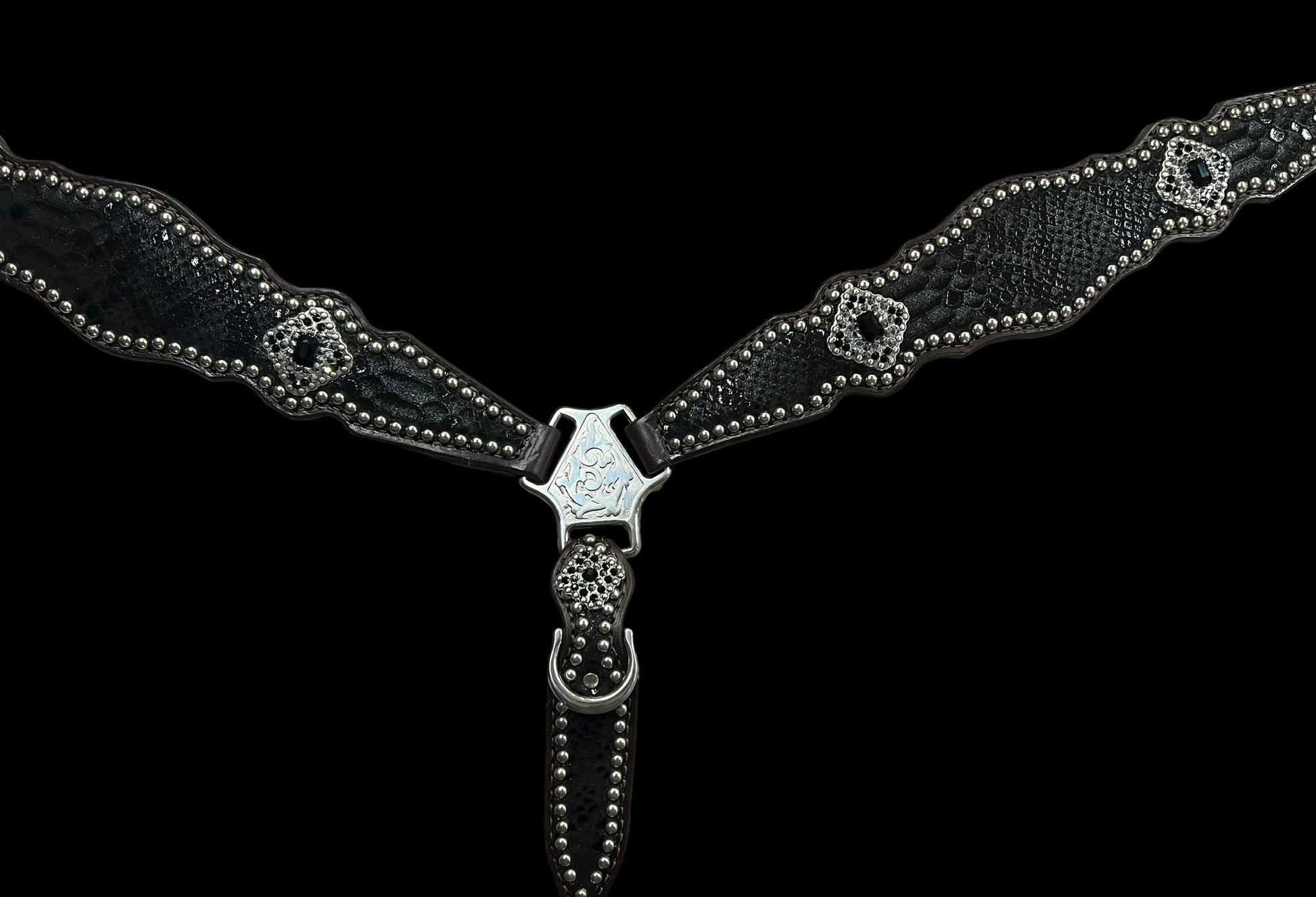 This ensemble features dark chocolate English bridle leather with black mystic leather overlay, stainless spots, and conchos with genuine rhinestones.