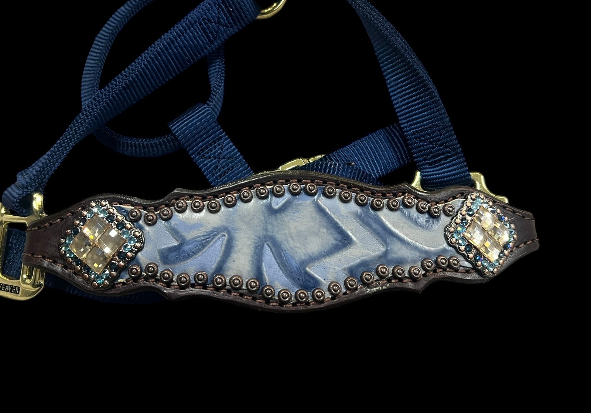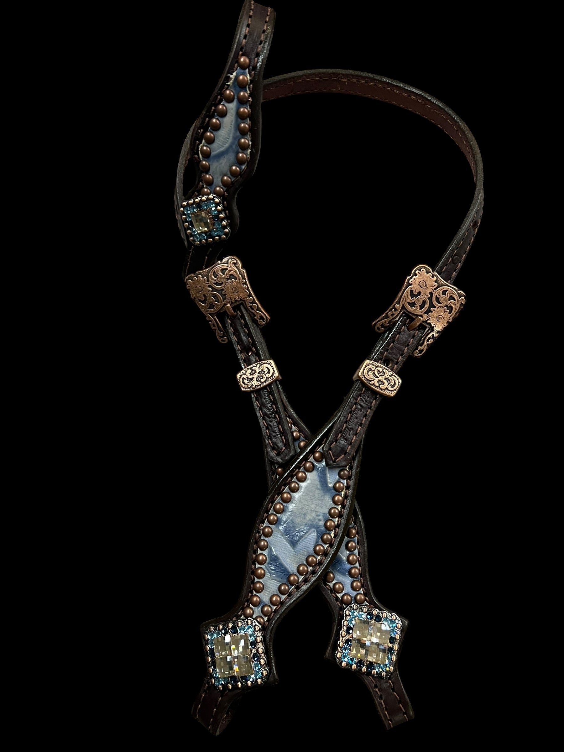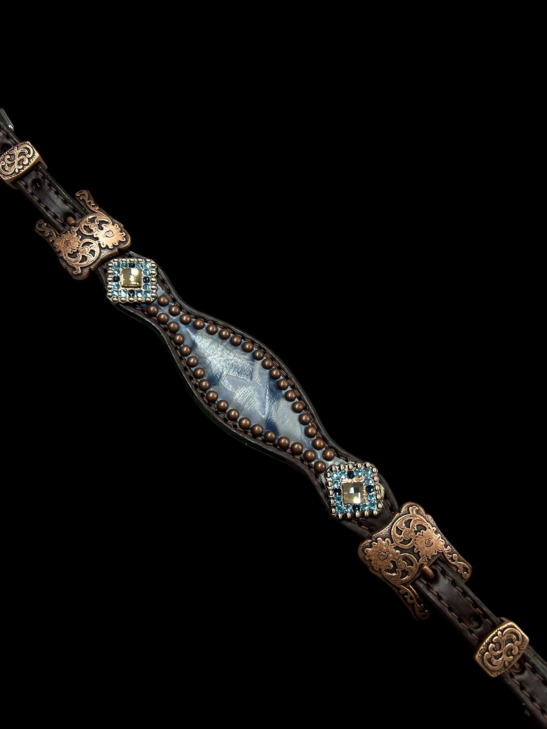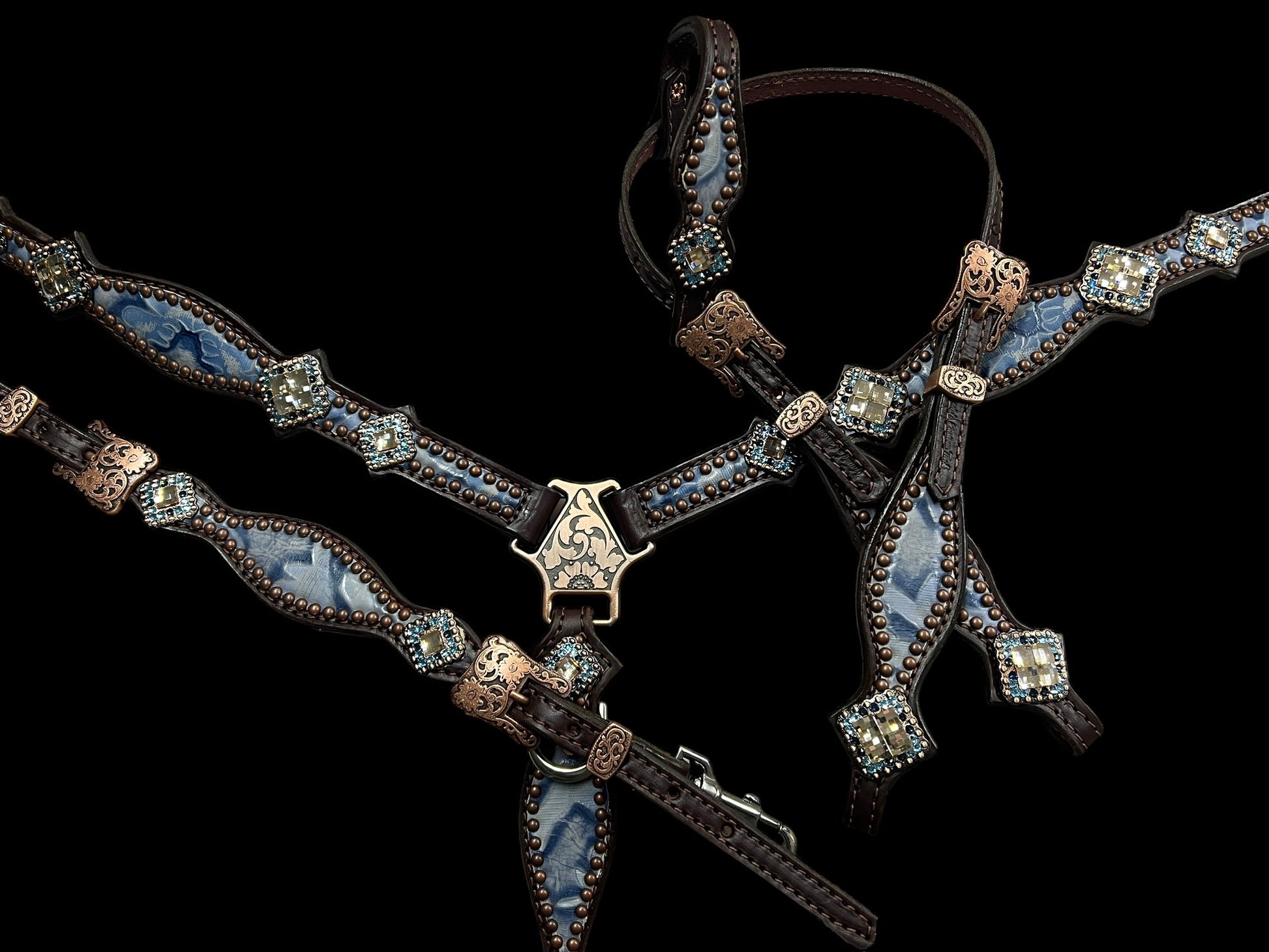 This ensemble features chocolate english bridle leather with blue laredo embossed leather overlay, copper spots, and conchos with genuine rhinestones.