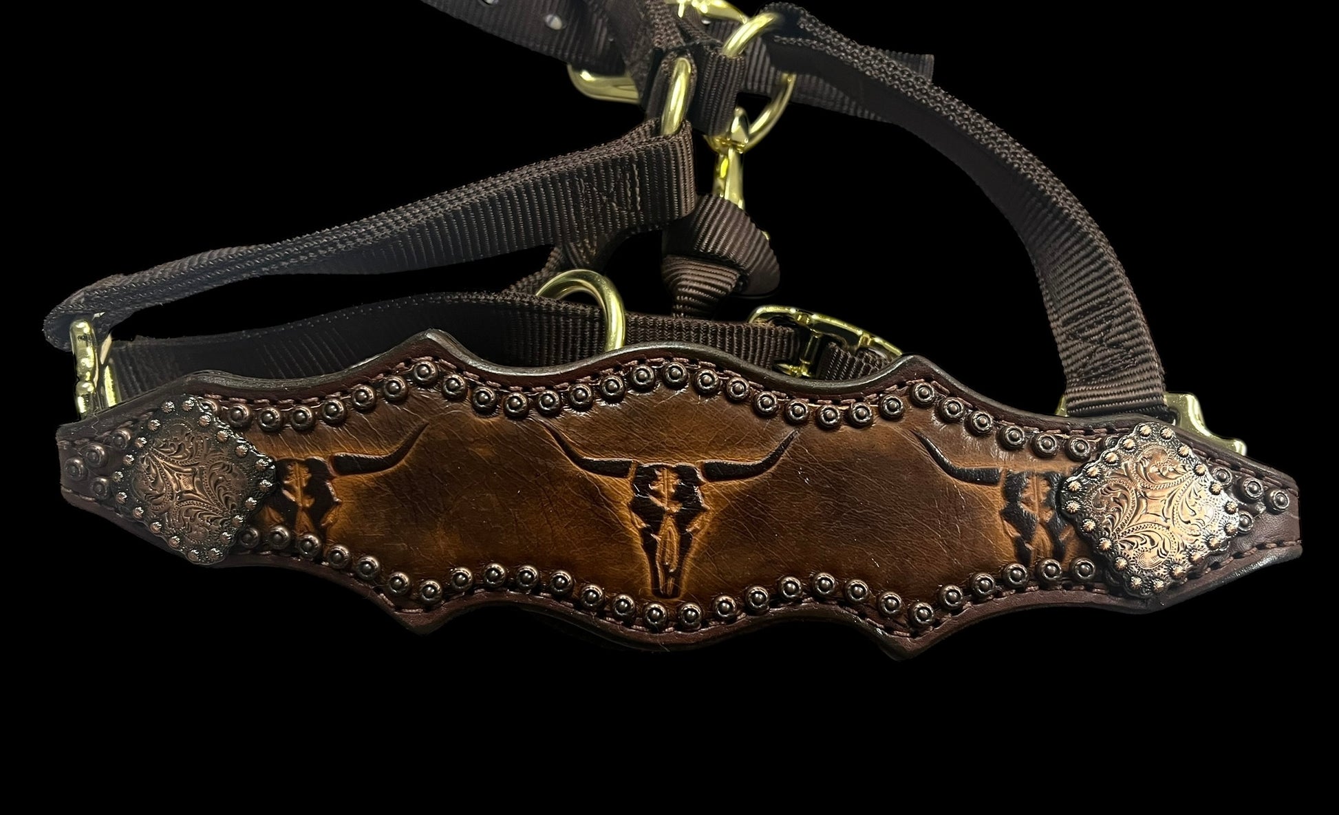 This set features Walnut english bridel leather leather, chocolate longhorns embossed leather hide, copper spots, and copper conchos and buckles.