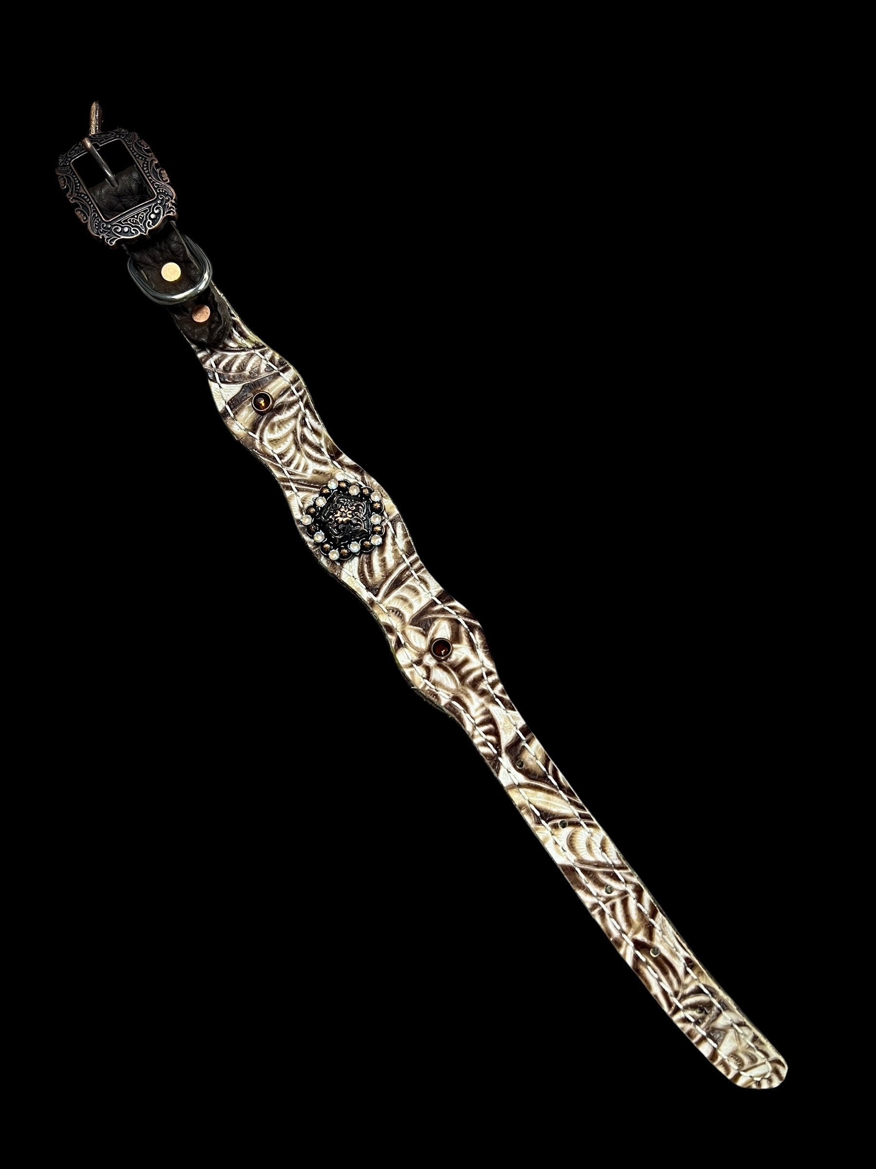 This ensemble features chocolate english bridle leather with brown and cream floral embossed leather overlay, copper spots, and conchos with genuine rhinestones.