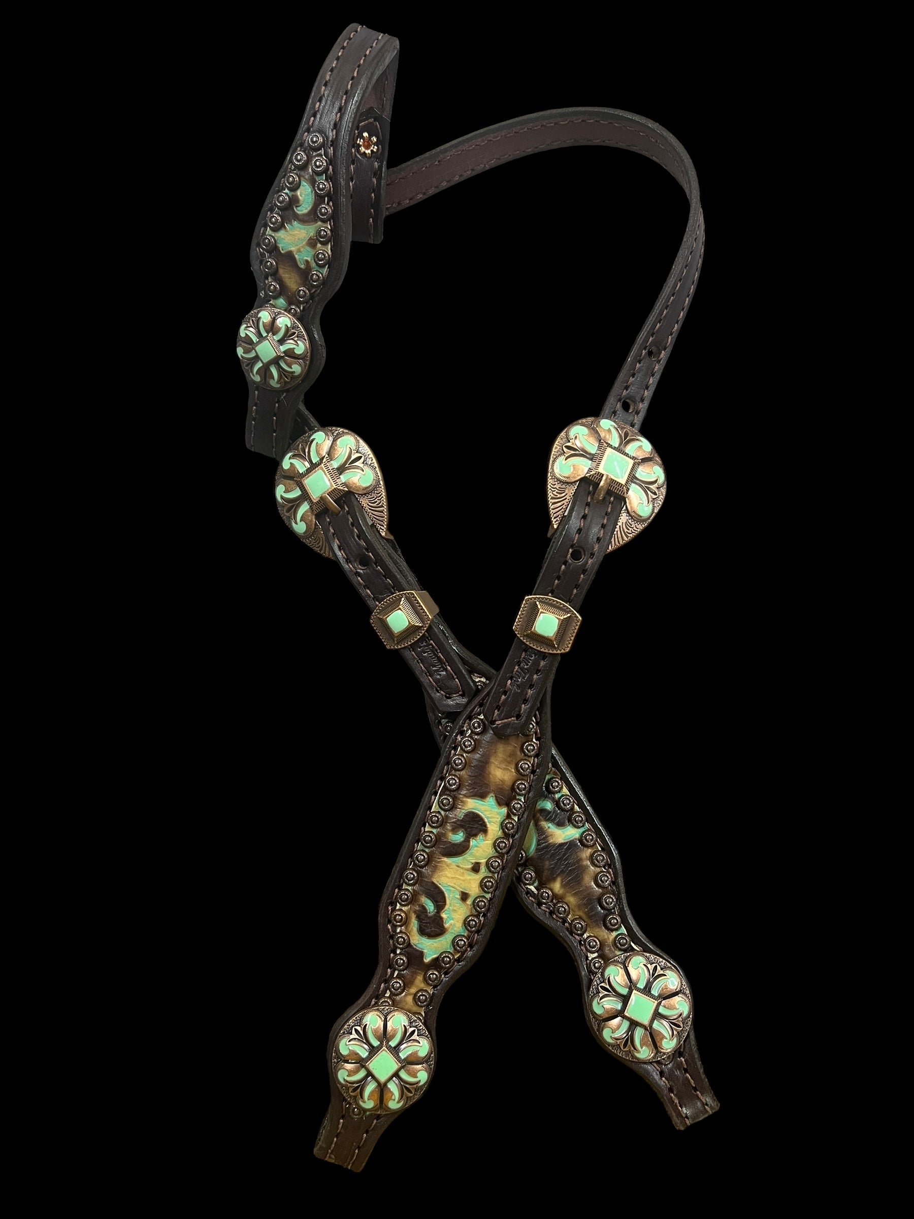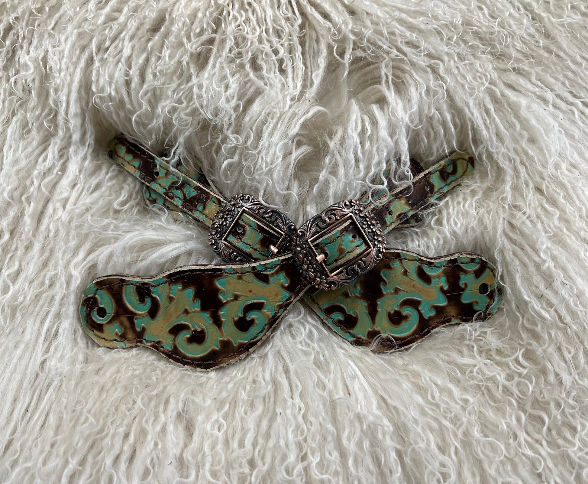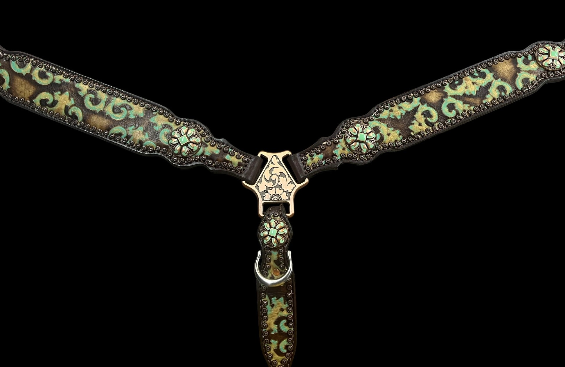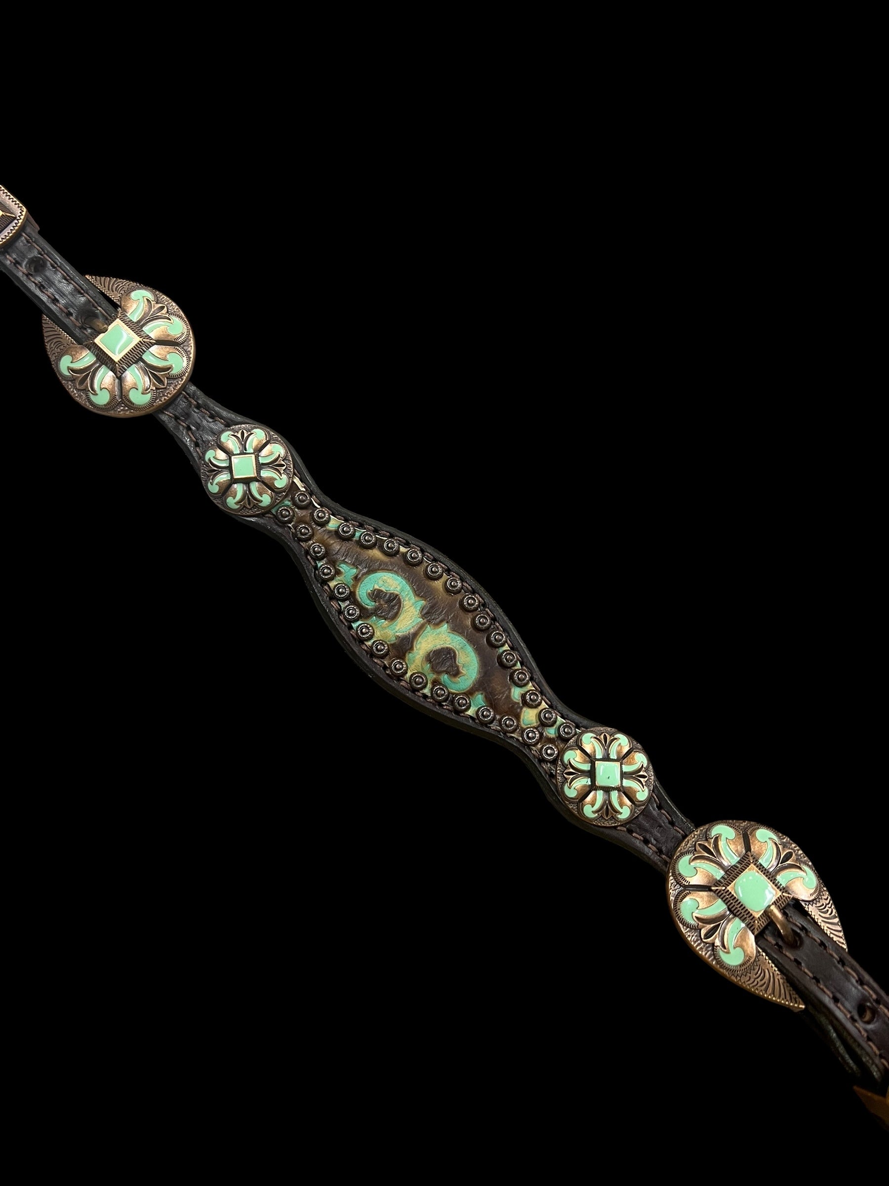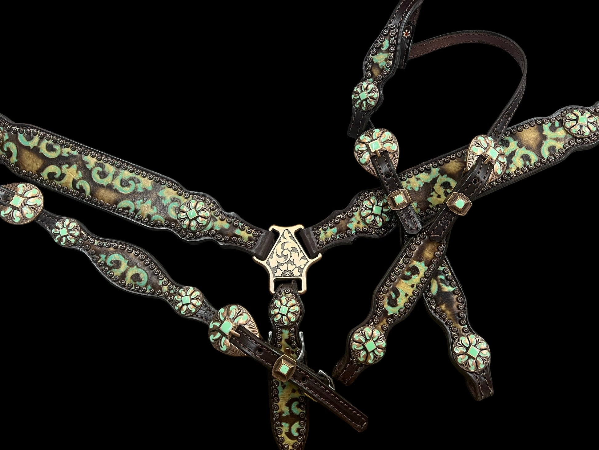 This ensemble features dark chocolate  english bridle leather with brown and turquoise Corona embossed leather overlay, copper spots, and copper conchos.