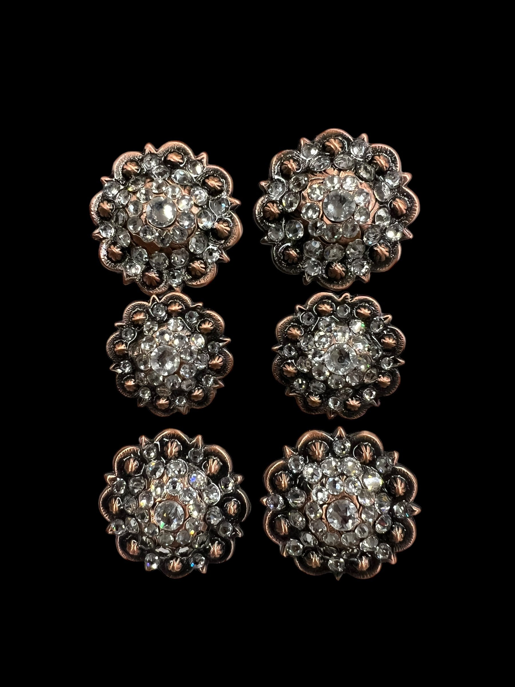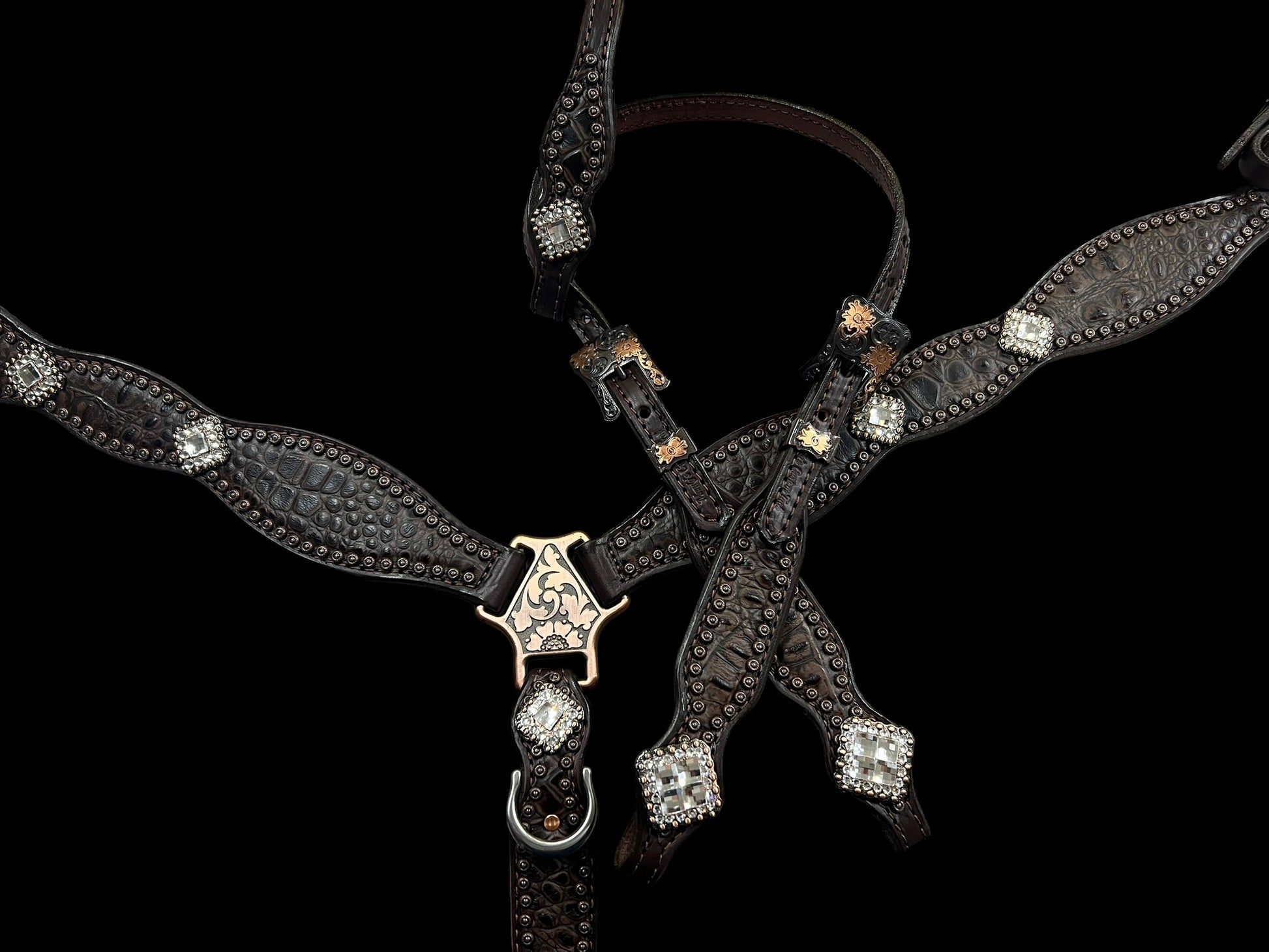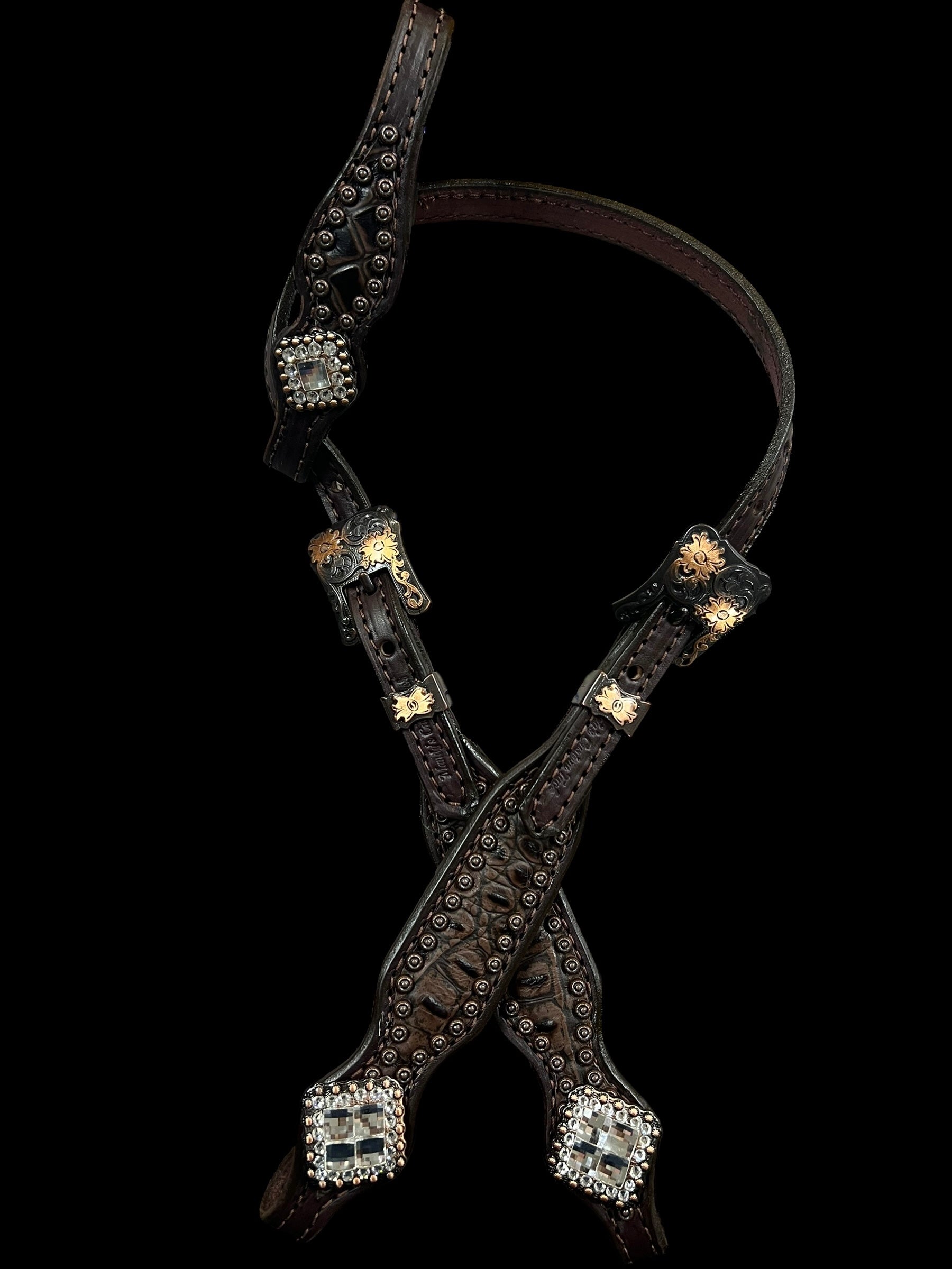 This one ear headstall and breast collar feature dark brown bridle leather, Cocoa gator embossed leather overlay, Copper spots and conchos with genuine rhinestones.