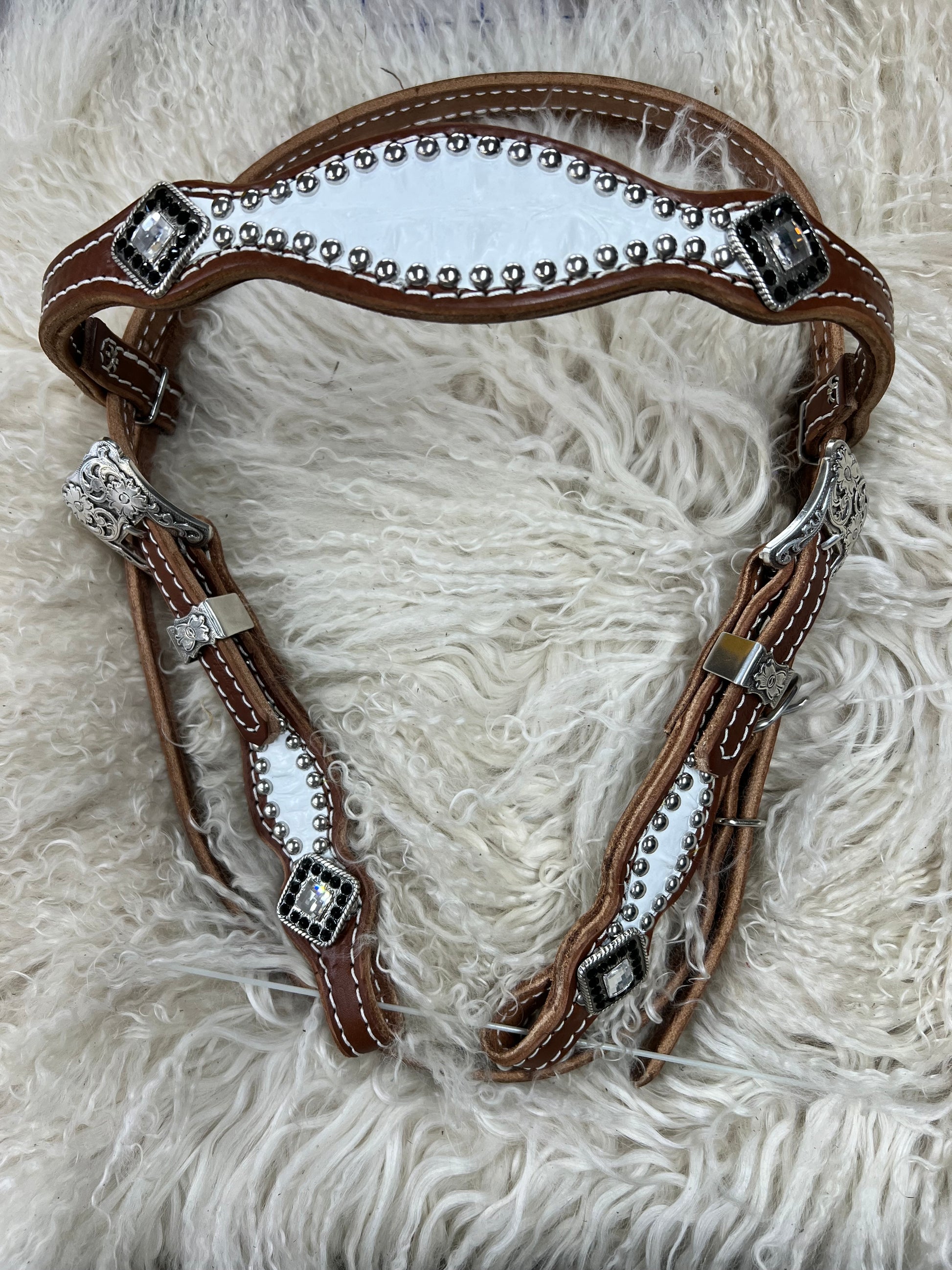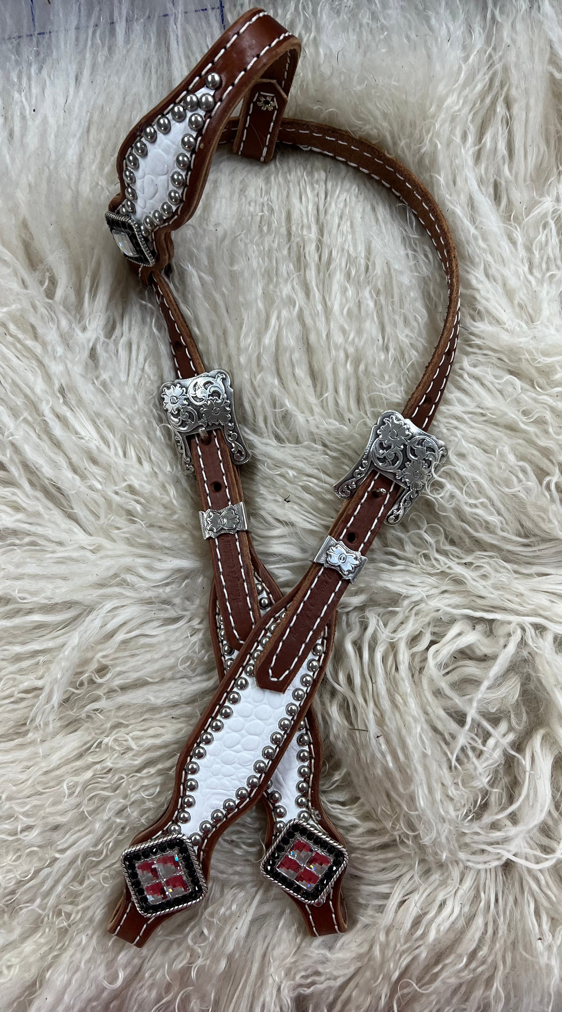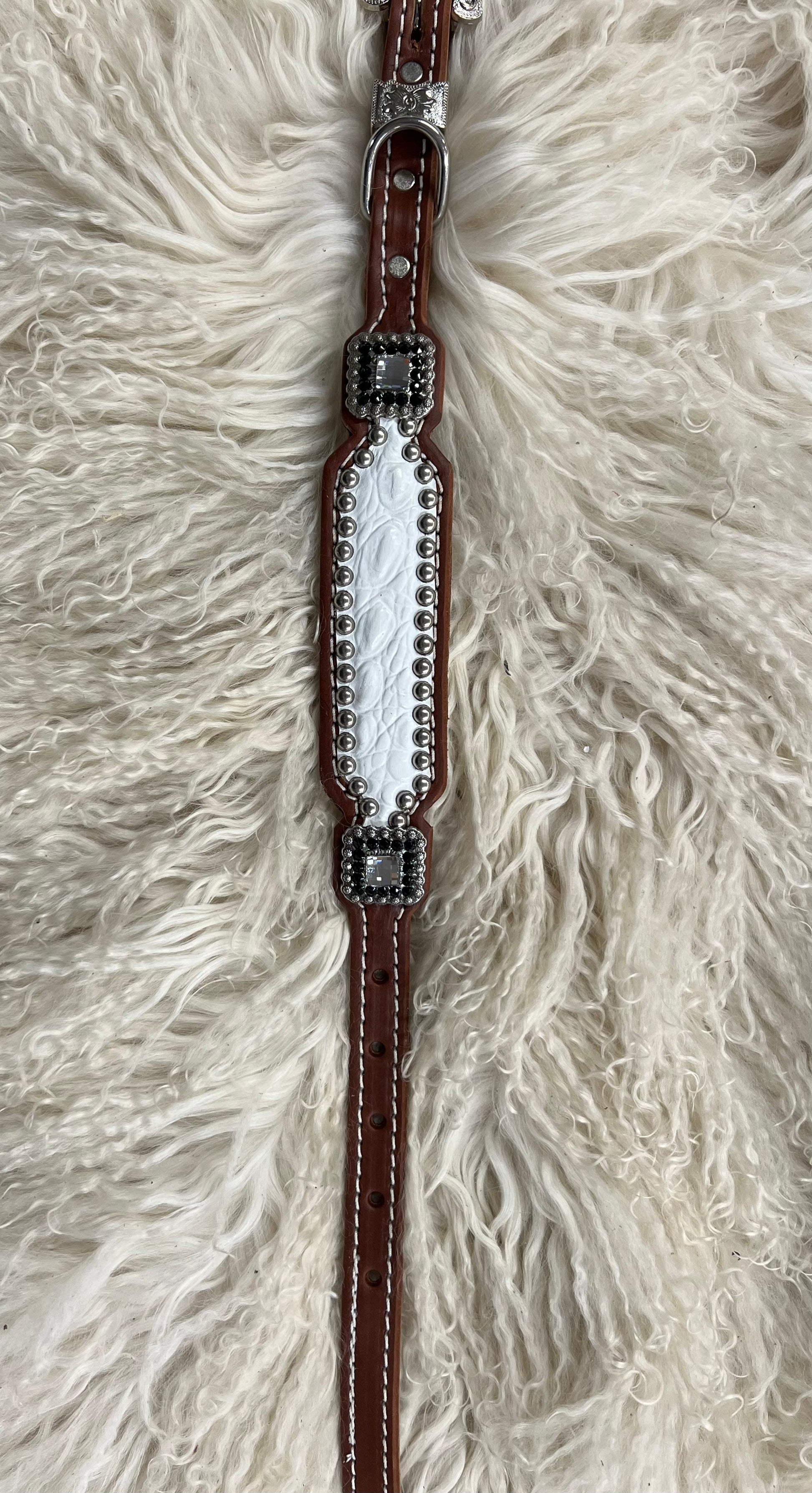 This ensembles features medium brown English bridle leather with white gator embossed leather overlay, stainless spots, and conchos with genuine rhinestones.