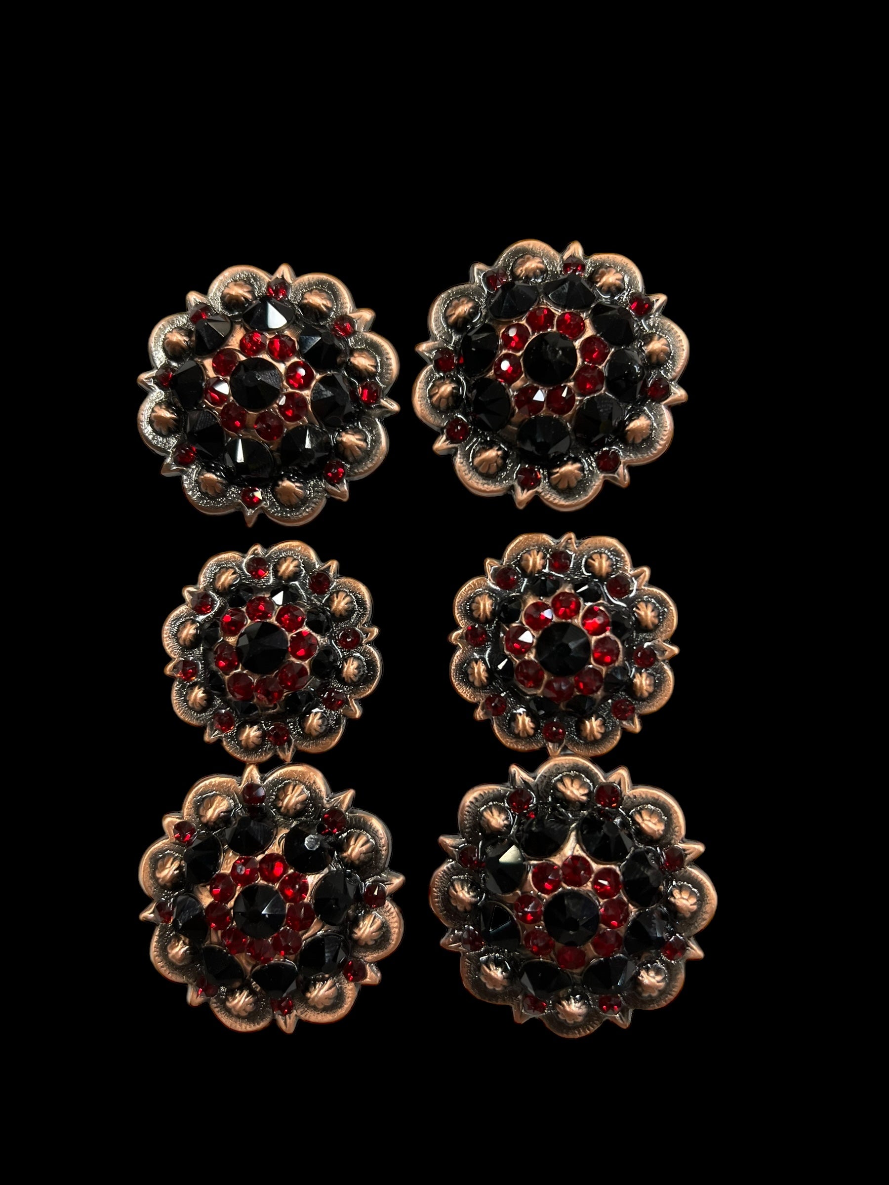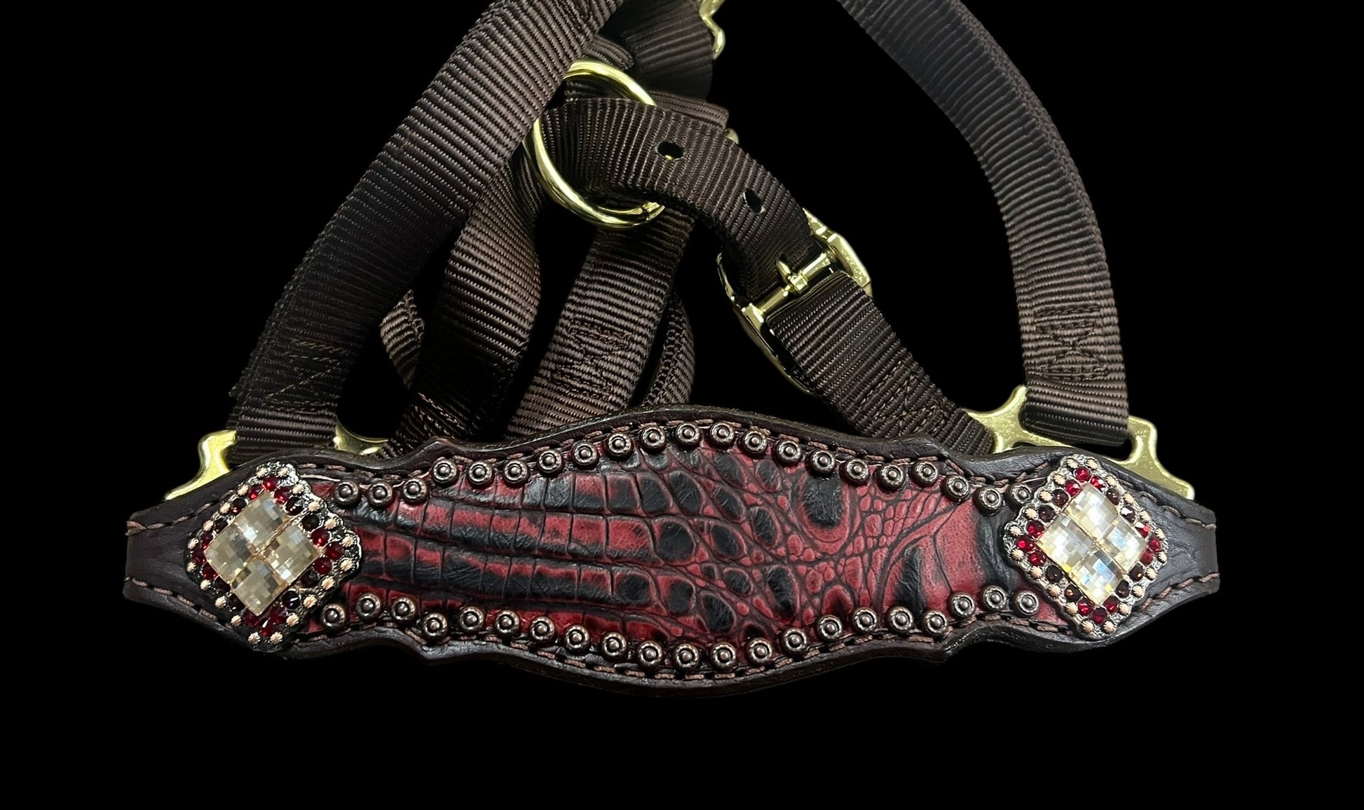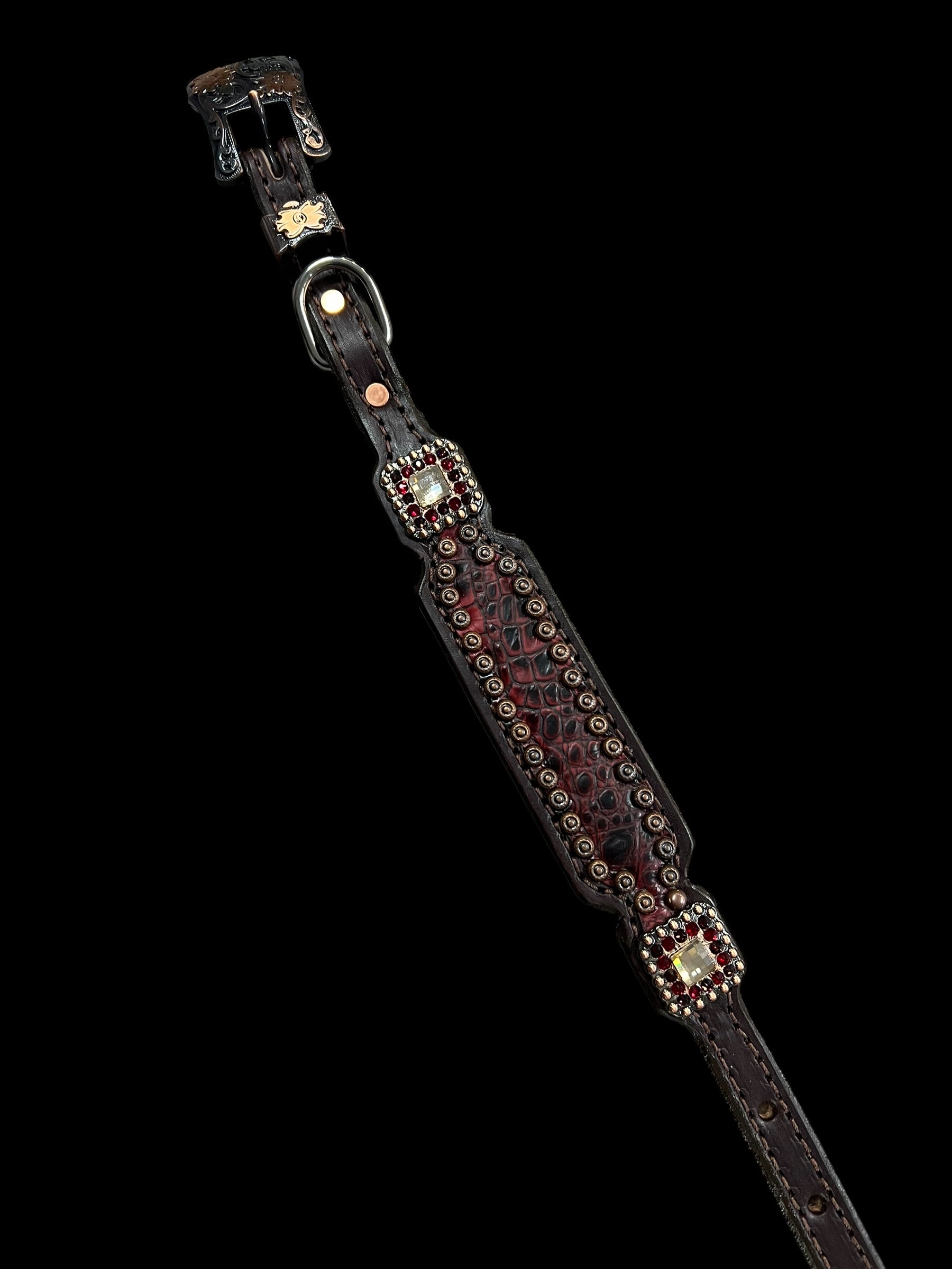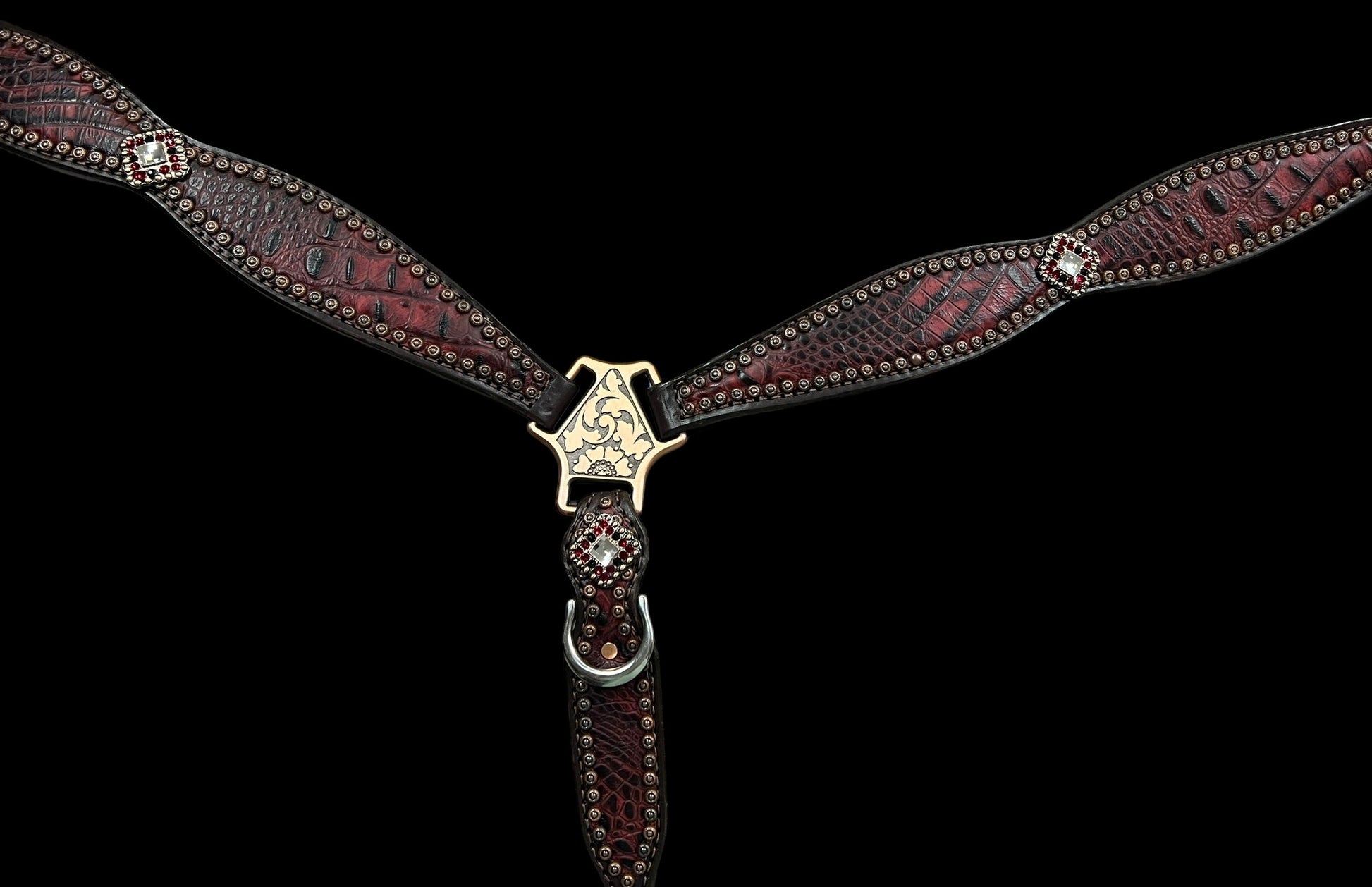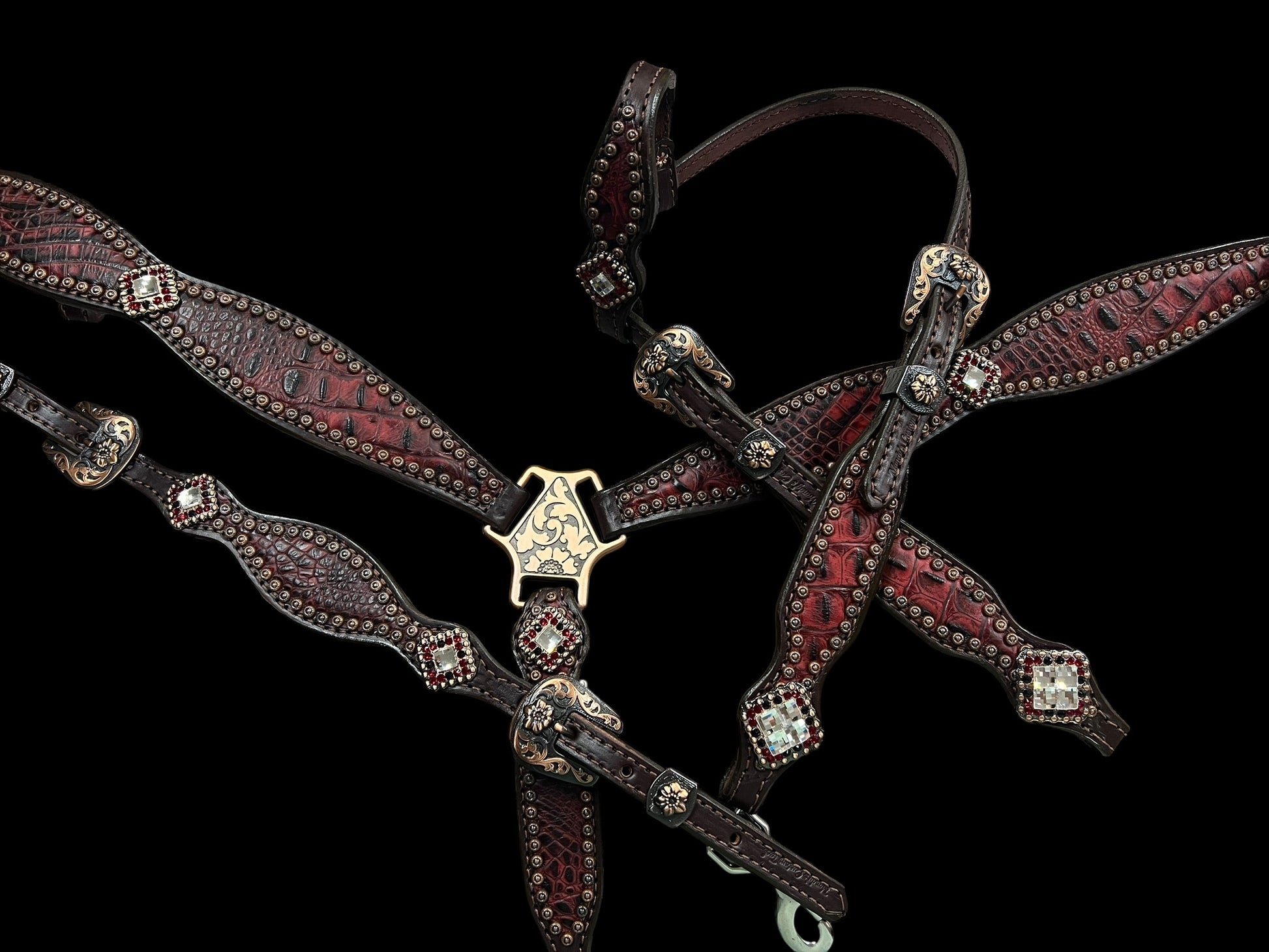 This ensemble features chocolate english bridle leather with dark red gator embossed leather overlay, copper spots, and conchos with genuine rhinestones.