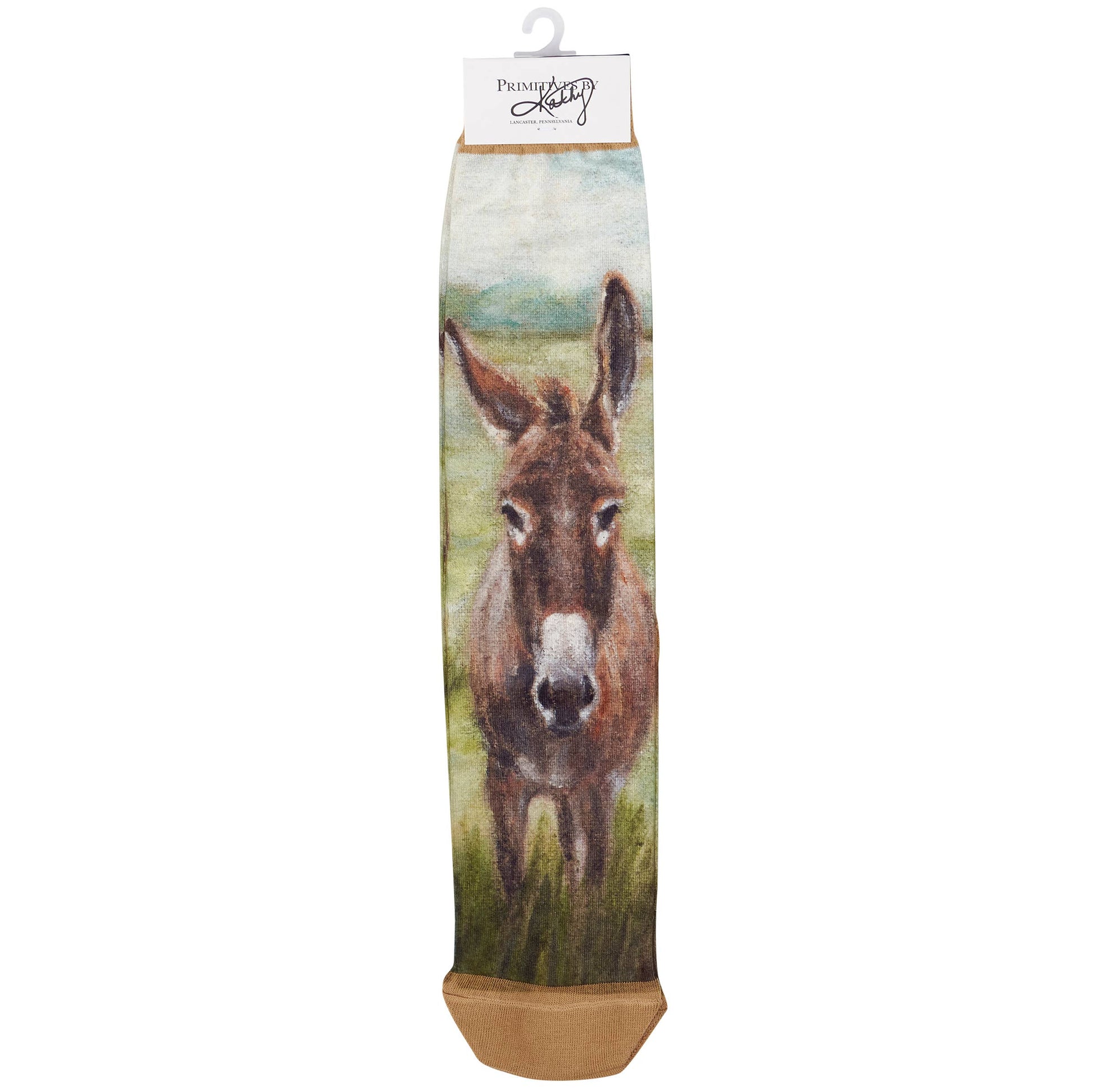 A pair of colorful knee-high socks from our Farmhouse Collection displaying a hand painted design of donkeys in a field on each sock. Donkey design is digitally printed replicating original artwork painted onto burlap canvas, giving the art a unique depth and texture. These giftable socks feature a knee-high length to easily show off the full design made with a spandex blend for a one size fits most design. Our knee-high Donkey socks come with a decorative header card and a clear plastic hanger for easy rack display and gifting. A charming farm-themed gift perfect for everyday self-expression.