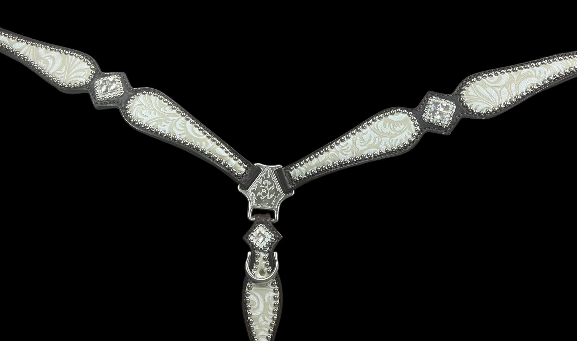 This ensemble features dark chocolate english bridle leather with eggshell floral embossed leather overlay, stainless spots, and conchos with geniune rhinestones.