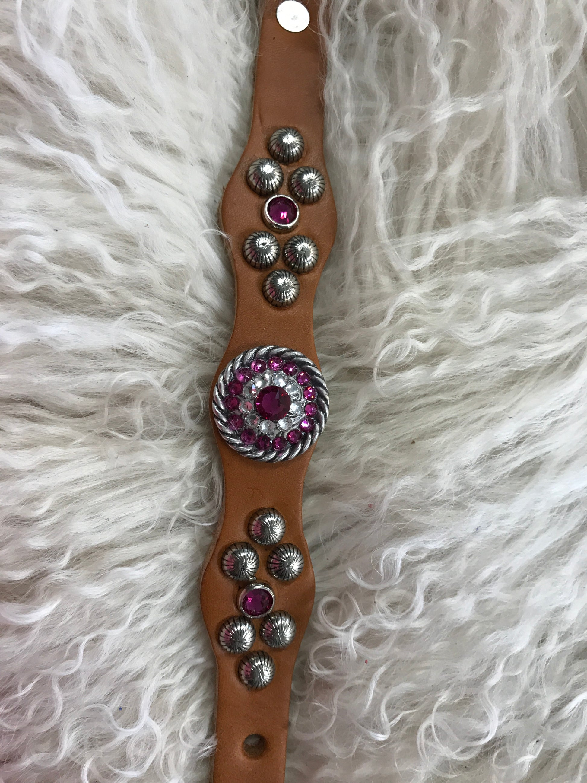This collar is made from quality English bridle Leather, stainless hardware, premium overlay leather, and Swarovski rhinestones. It is adjustable from approximately 9-11 inches