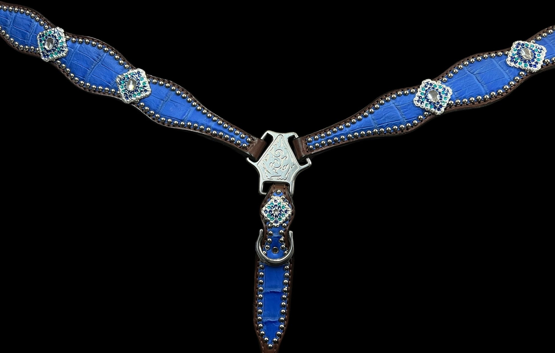 This ensemble features Walnut english bridle leather with genuine American alligator leather overlay, stainless spots, and conchos with genuine rhinestones.