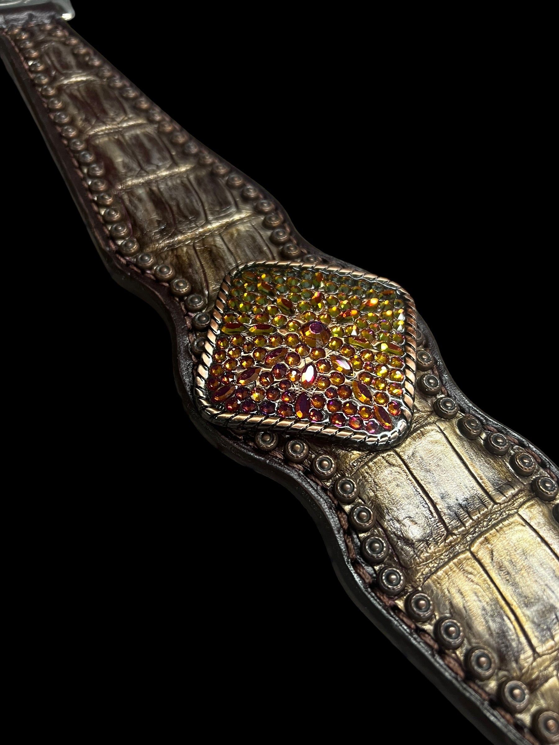This ensemble features Walnut english bridle leather with genuine American alligator leather overlay, copper spots, and conchos with volcano Swarovski rhinestones.