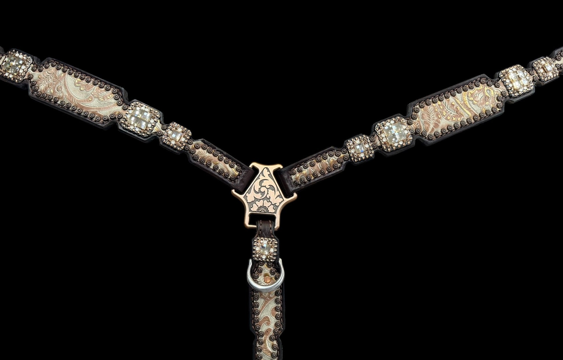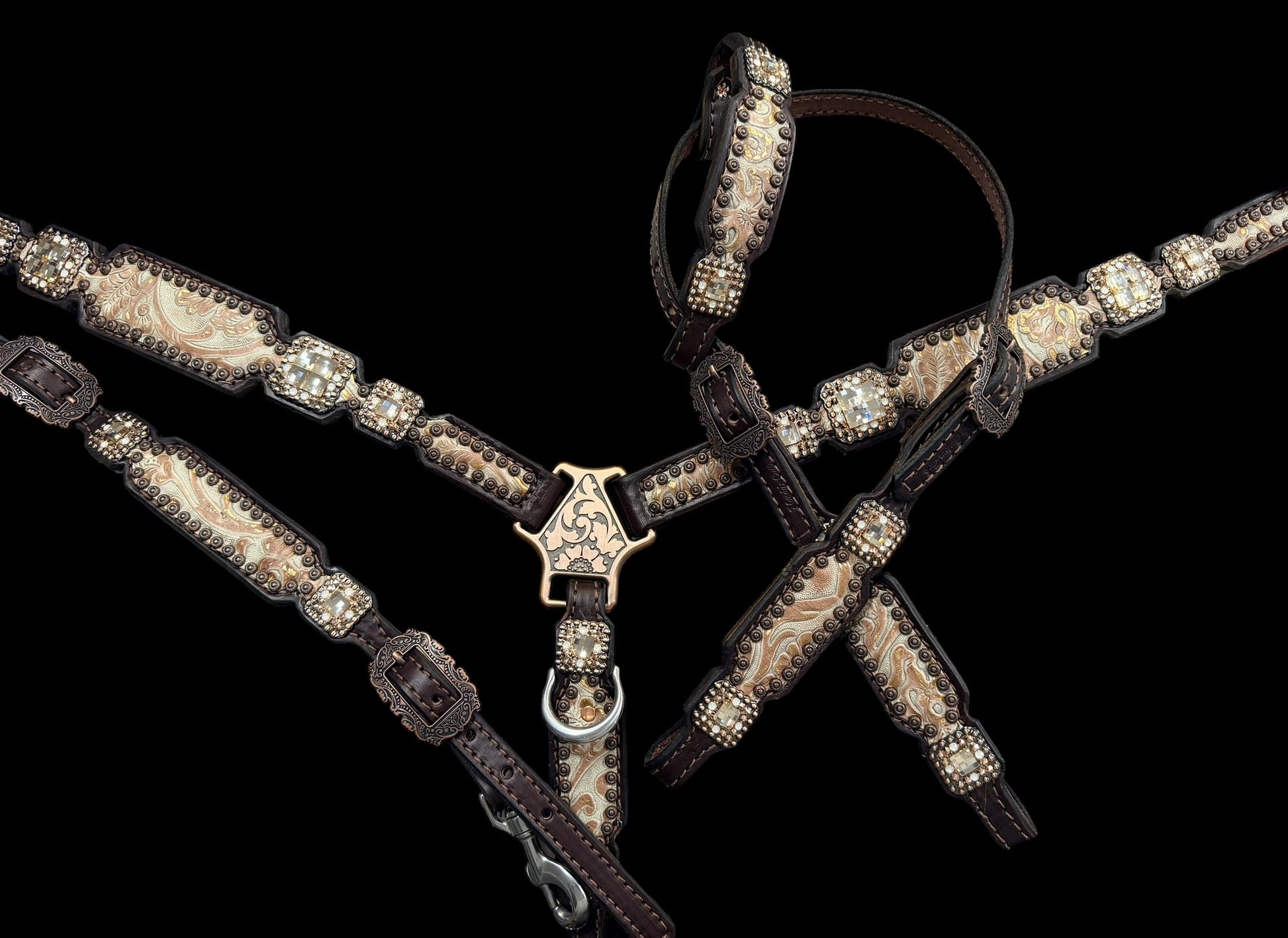 This ensemble features chocolate english bridle leather with ginger floral embossed leather overlay, copper spots, and conchos with genuine rhinestones.