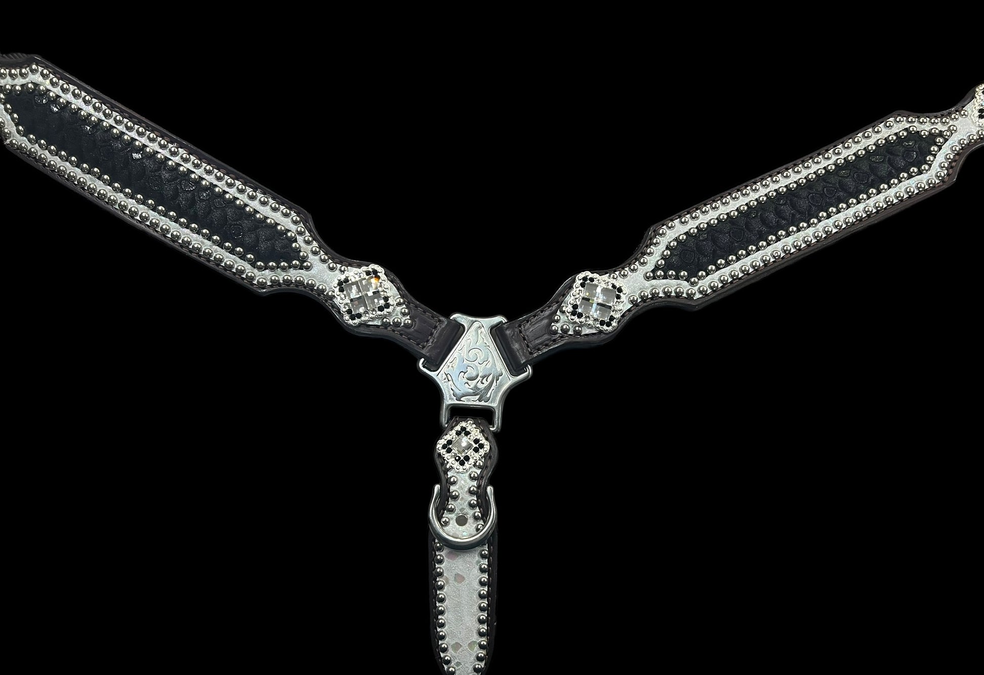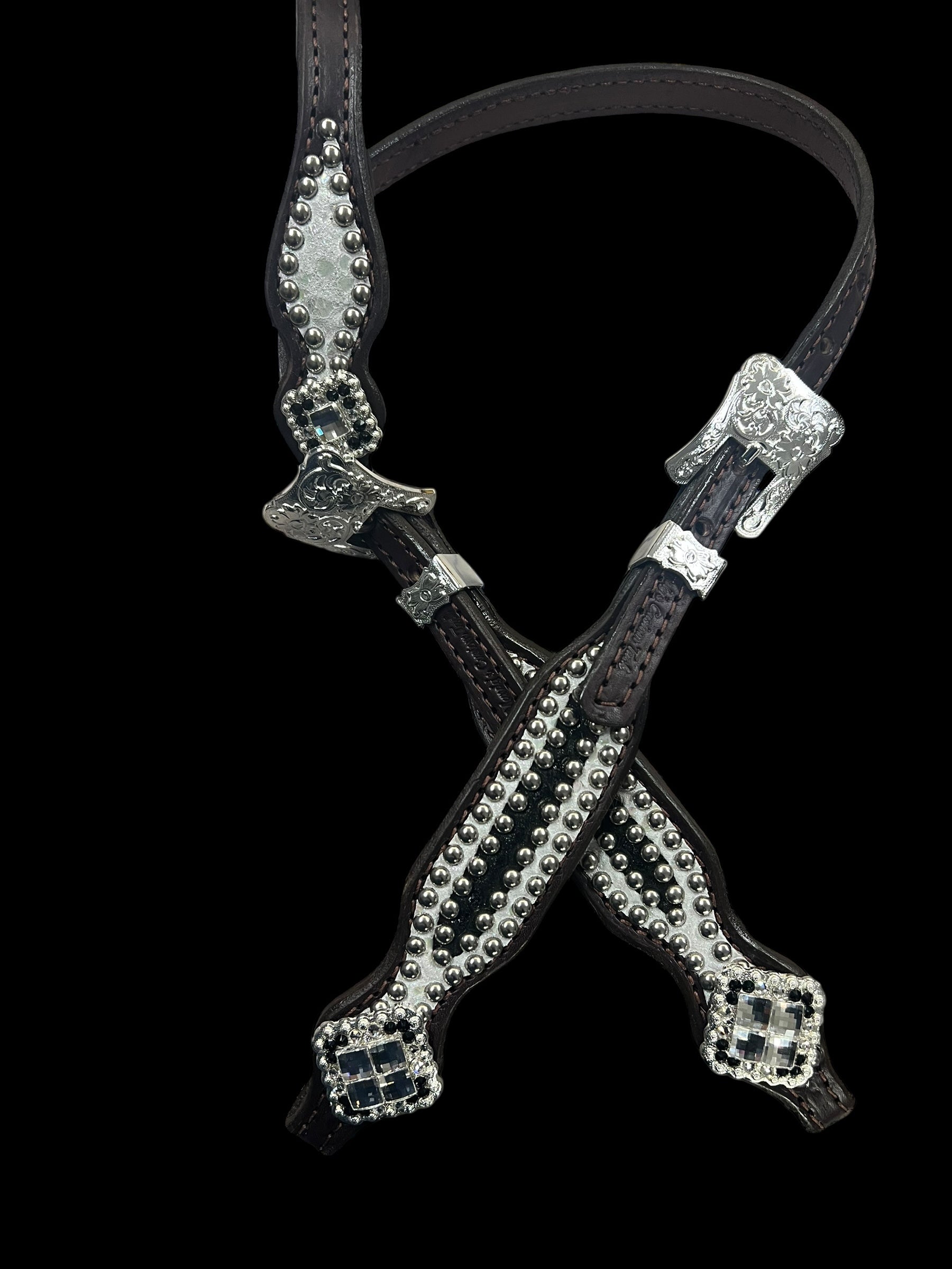 This ensemble features dark english bridle leather with white mystic and Black mystic leather overlays, stainless spots, and conchos with genuine rhinestones.