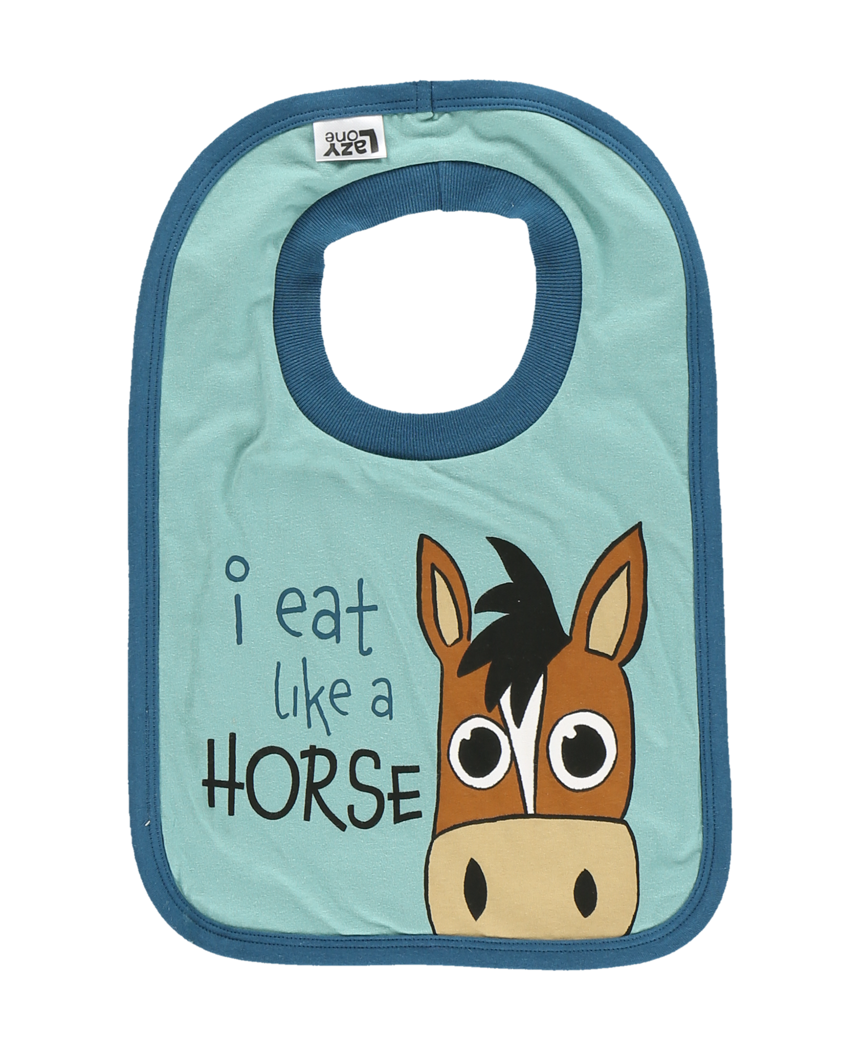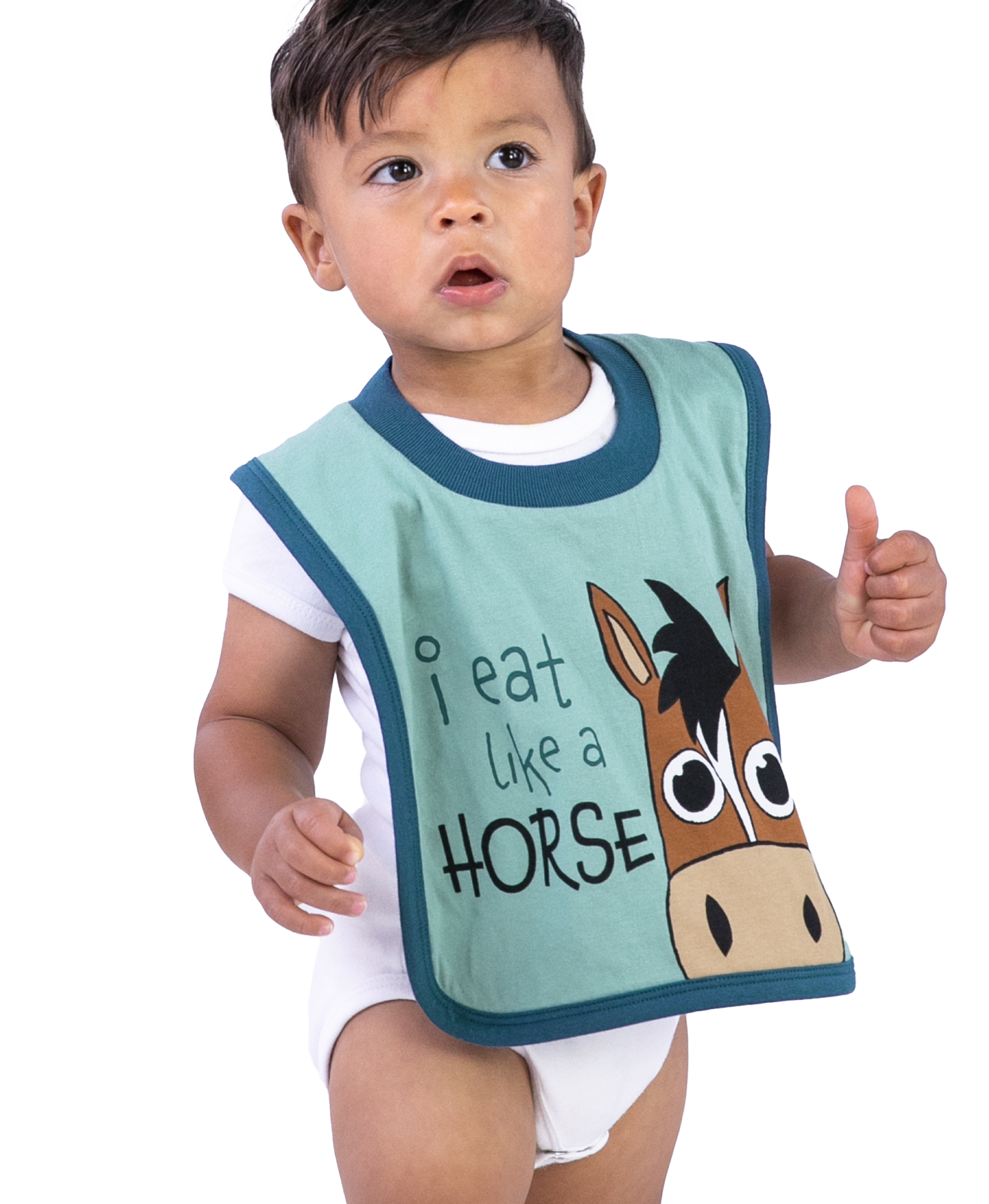 • 100% Combed Cotton Knit • Contrasting Trim • Fun Print on Front, Solid color fabric on back • Enclosed Elastic Neck for easy on & off • Large size 11”x15” – to catch all spills • Preshrunk •