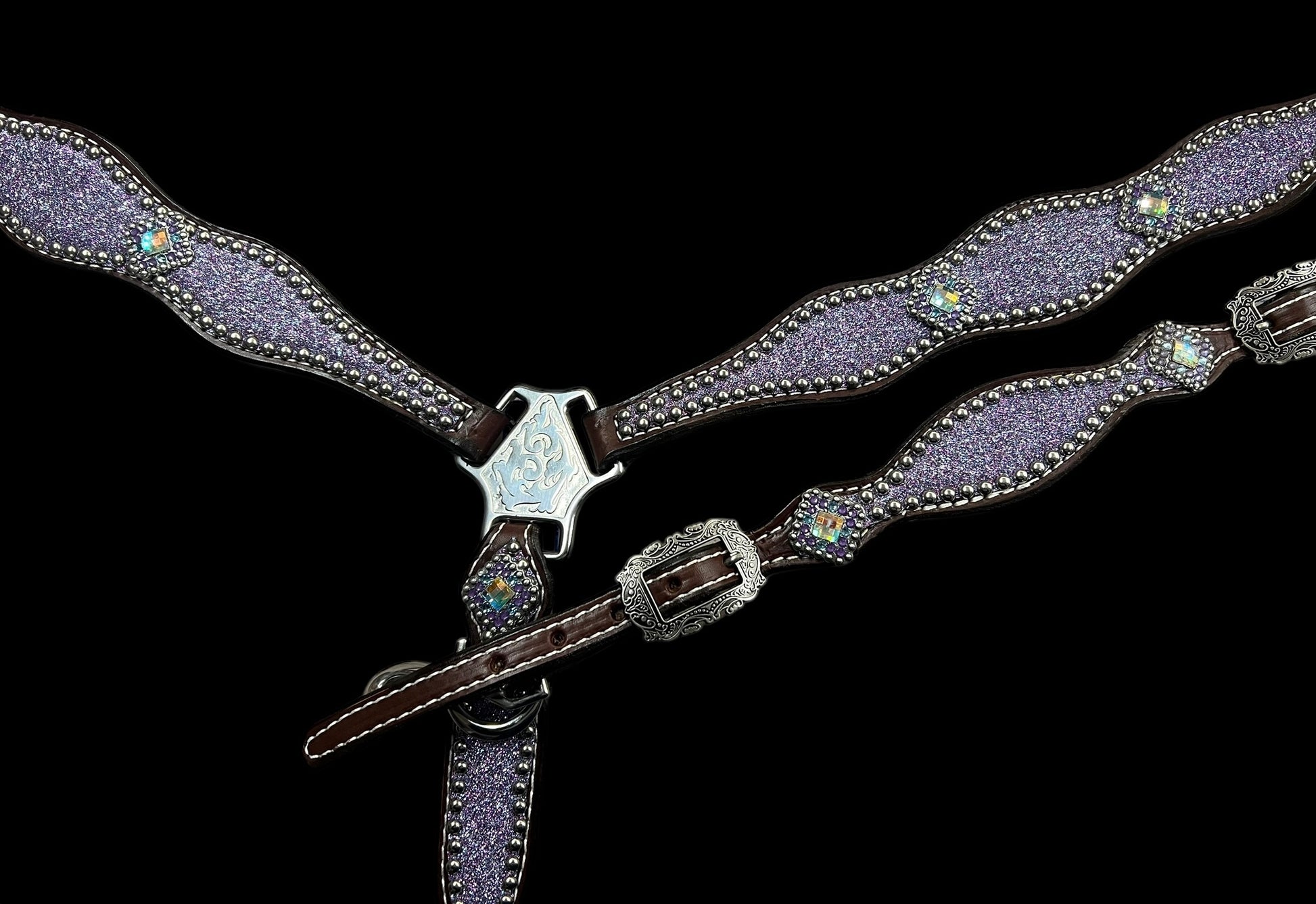 This ensemble features walnut brown english bridle leather with lilac glitter leather overlay, stainless spots, and genuine rhinestones. This one is going to get you noticed!!