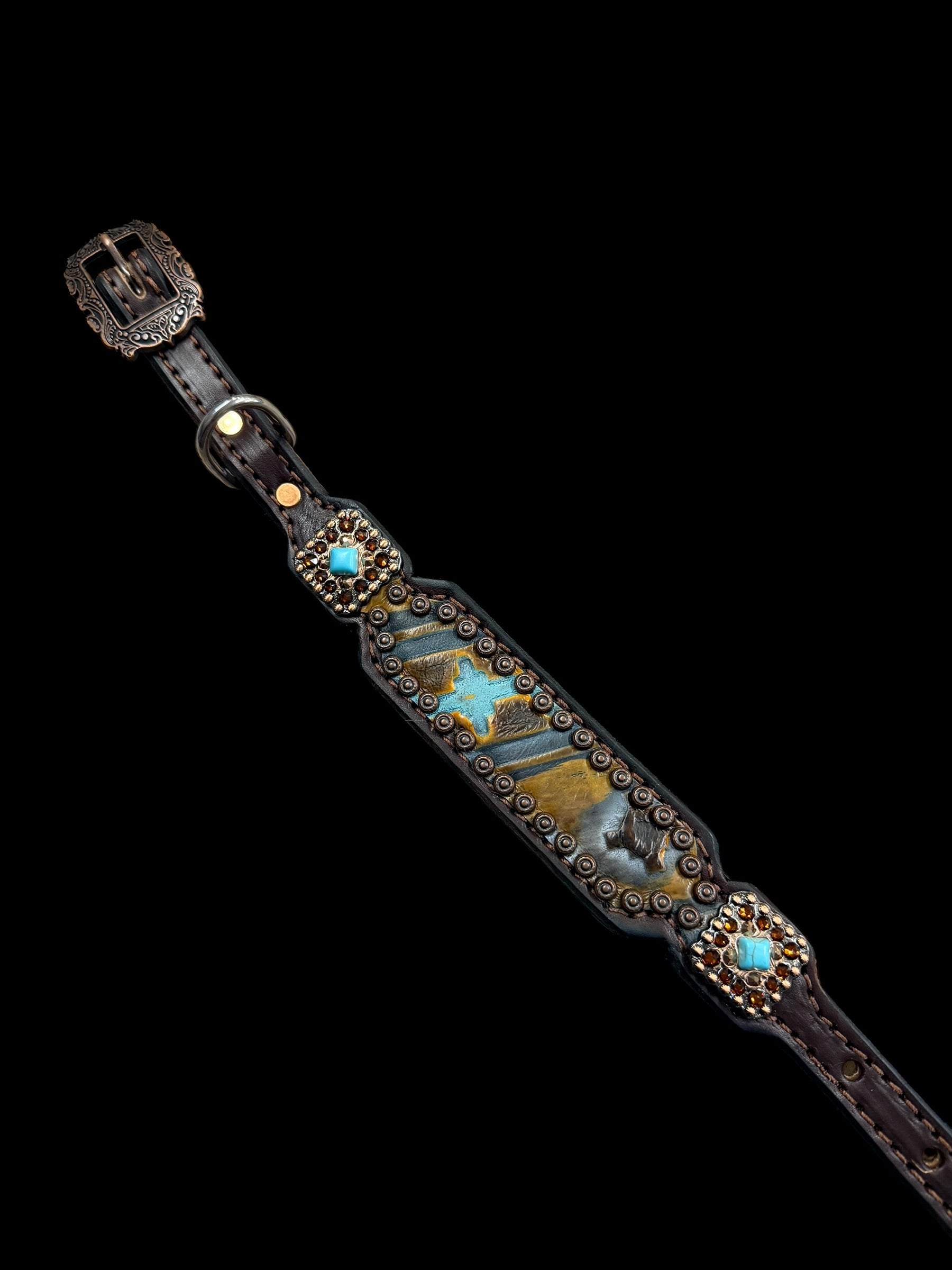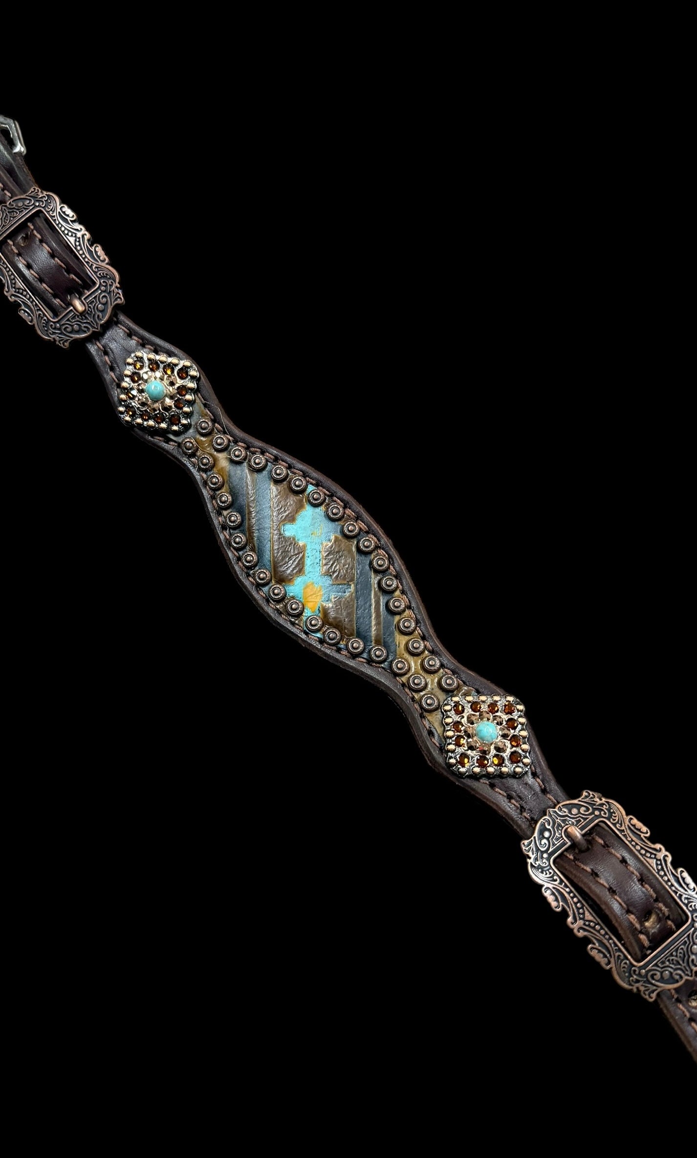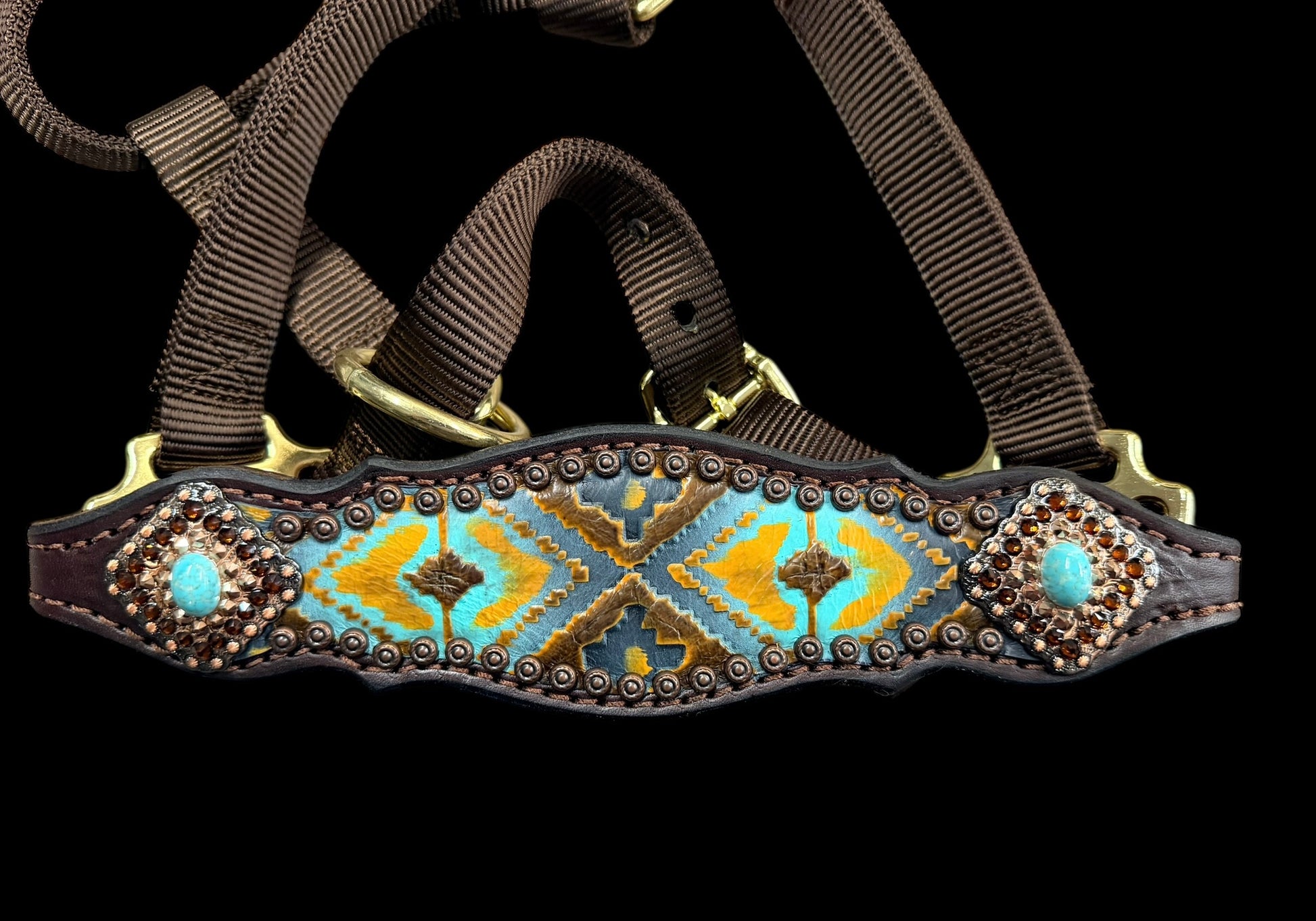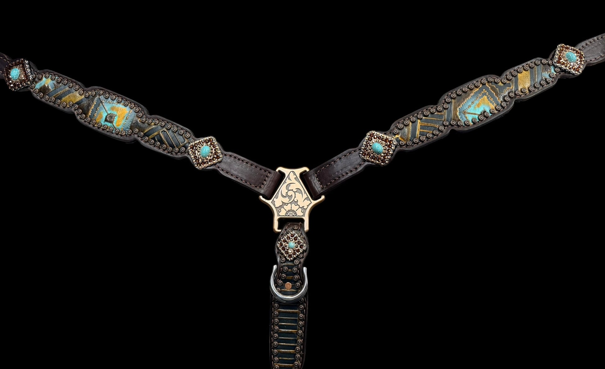 This ensemble features medium english bridle leather with aztec embossed overlay, stainless spots, and conchos with genuine rhinestones.