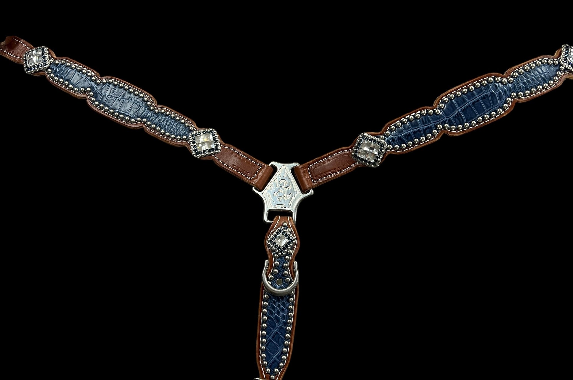 This ensemble features medium english bridle leather with navy gator embossed leather overlay, stainless spots, and conchos with genuine rhinestones.