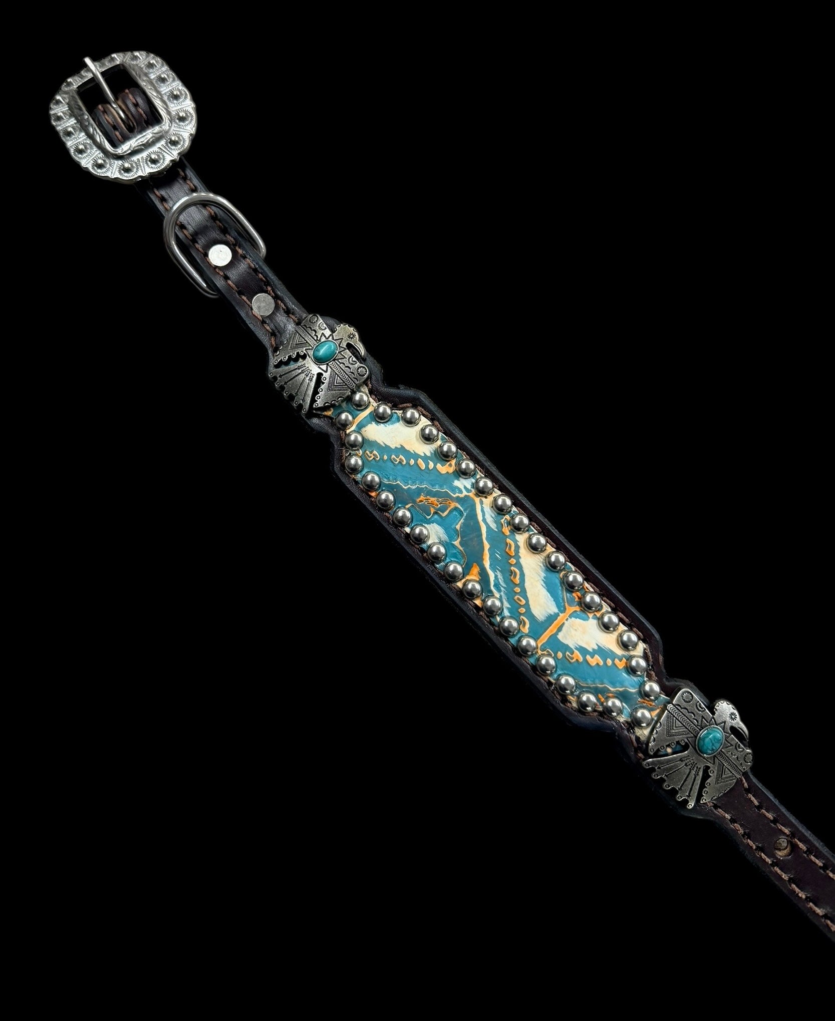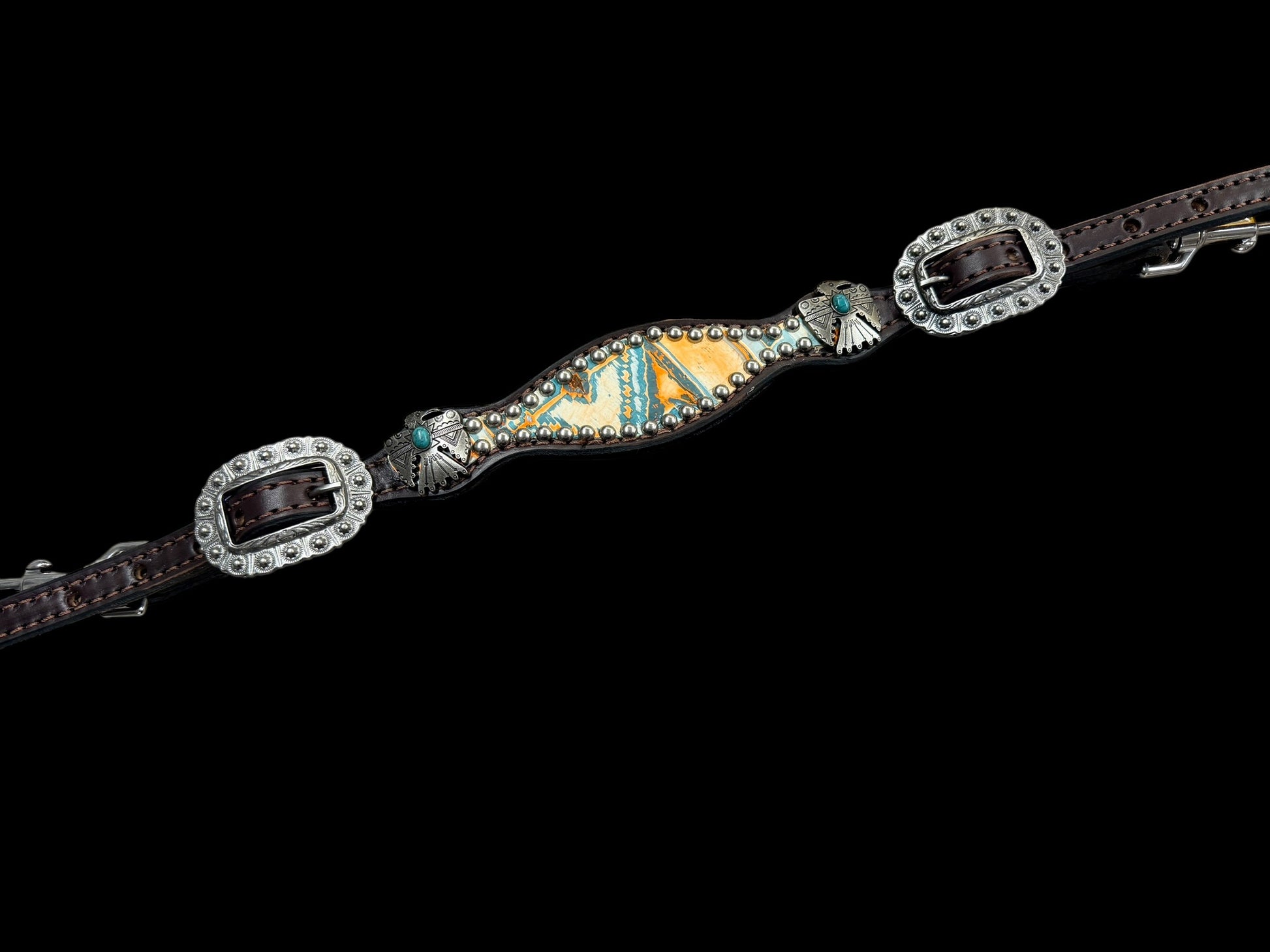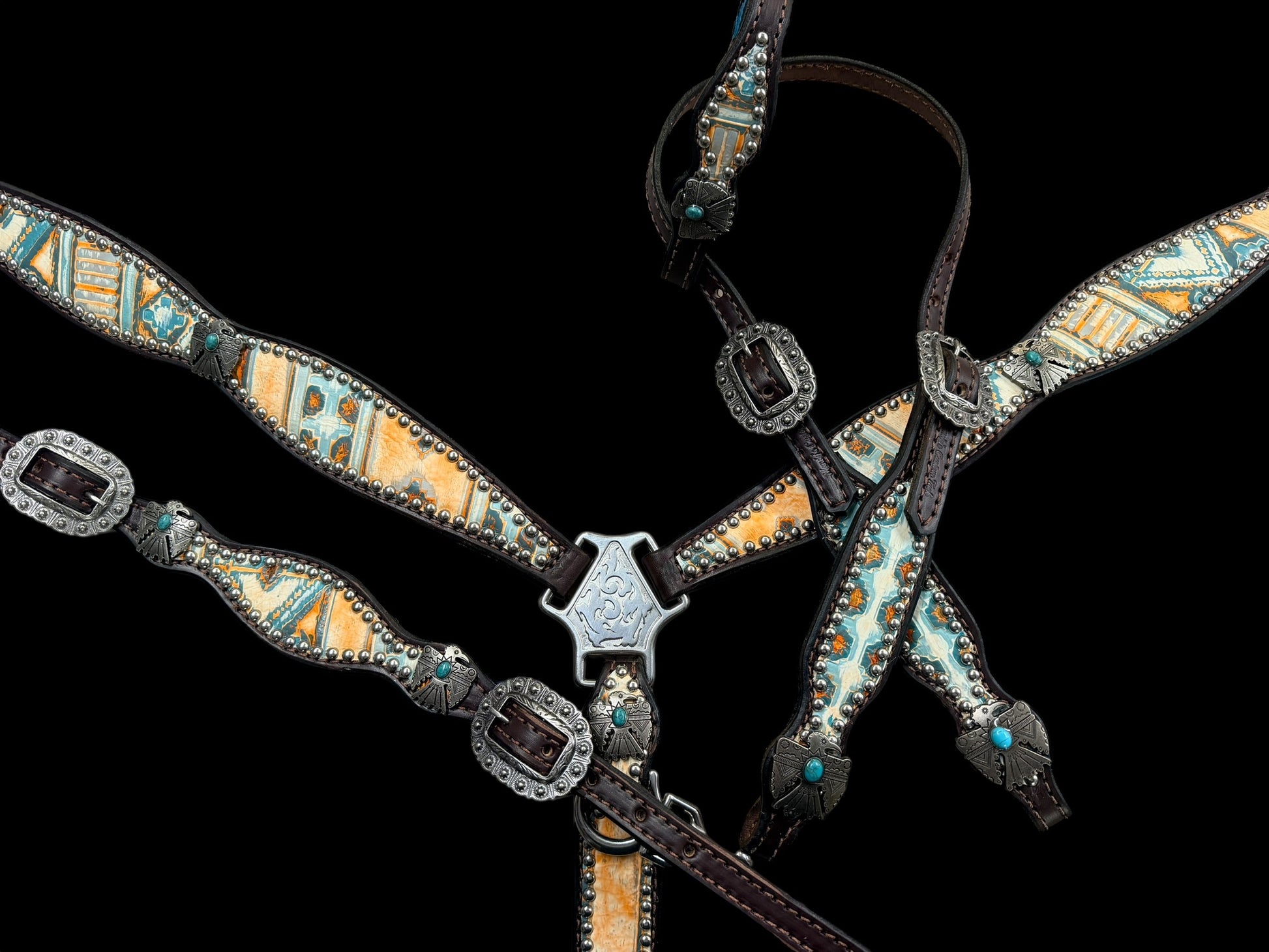This ensemble features chocolate english bridle leather with Orange and turquoise Navajo embossed leather overlay, stainless spots, and thunderbird conchos