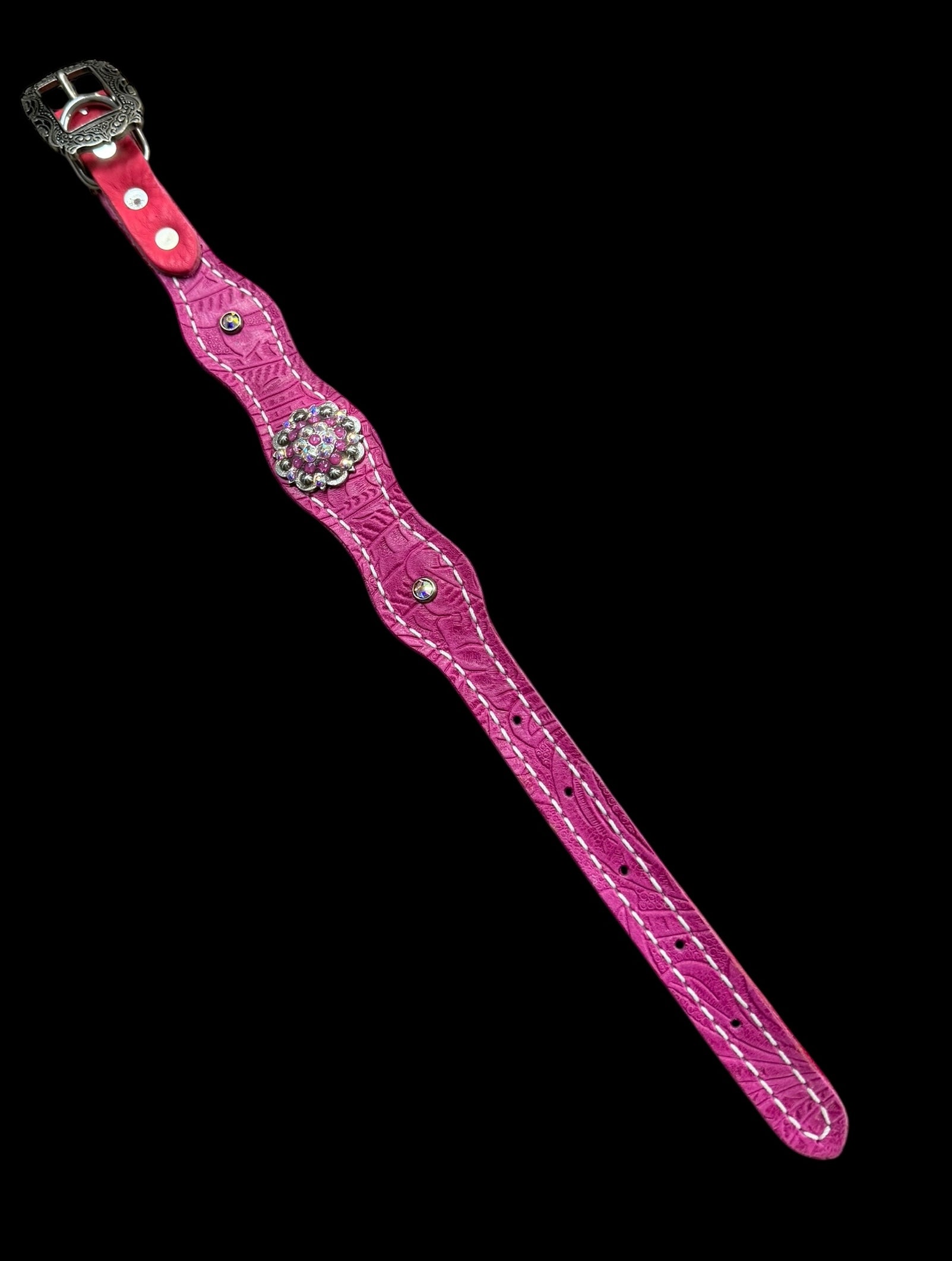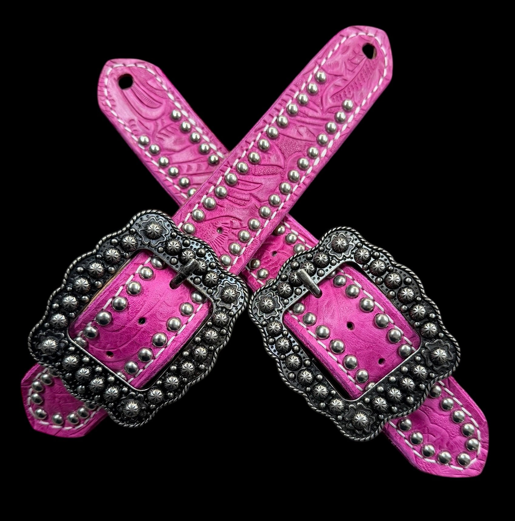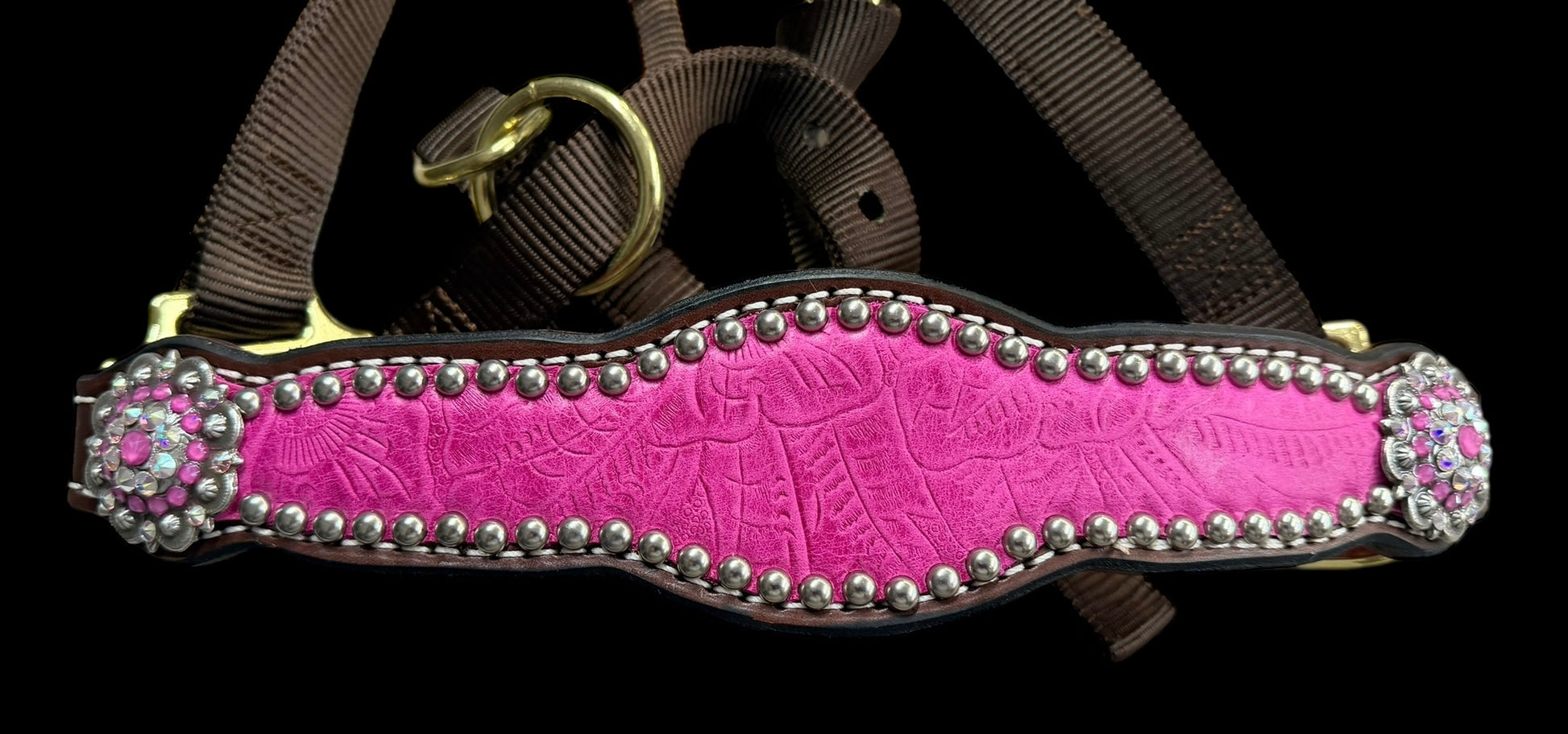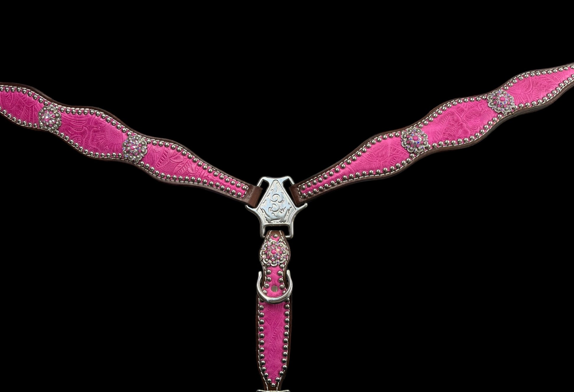 This ensemble features walnut english bridle leather with pink dallas floral embossed leather overlay, stainless spots, and conchos with genuine rhinestones.