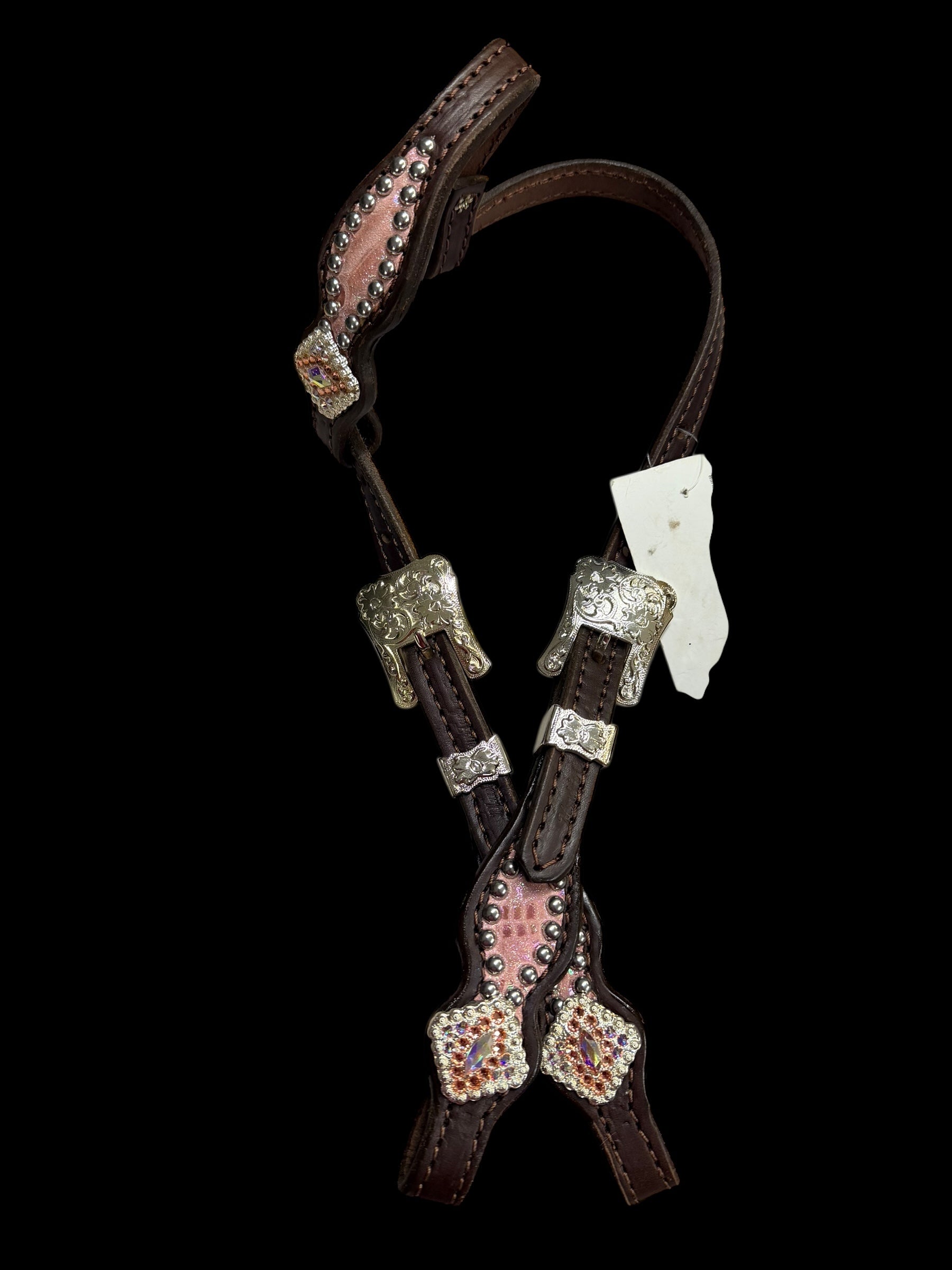 This breast collar features dark brown english bridle leather with pink mystic leather overlay, stainless spots, and conchos with genuine rhinestones .