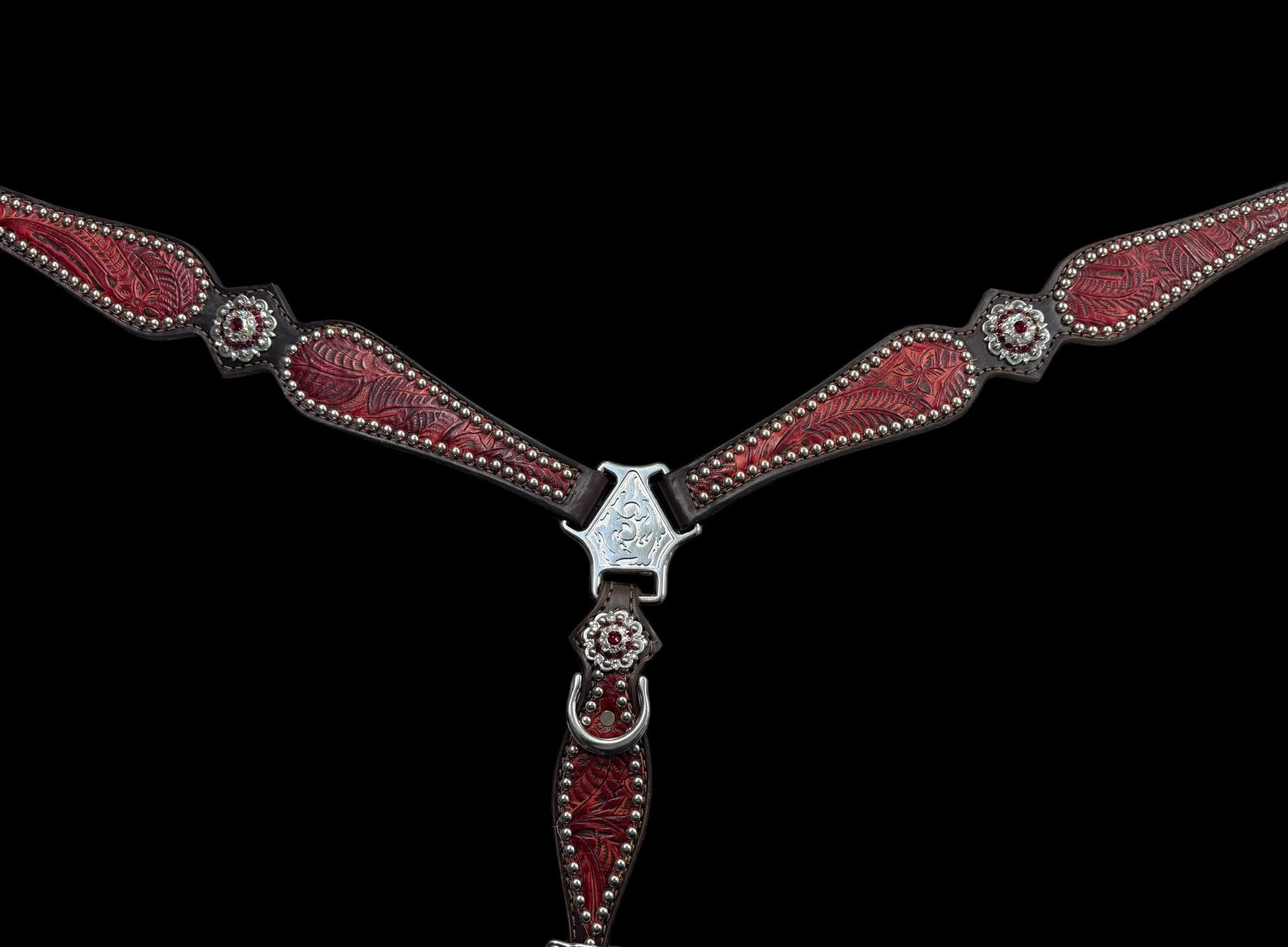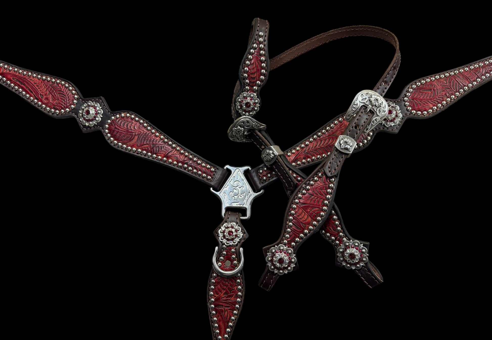 This ensemble features chocolate english bridle leather with pomegranate floral embossed leather overlay, stainless spots, and conchos with genuine rhinestones.