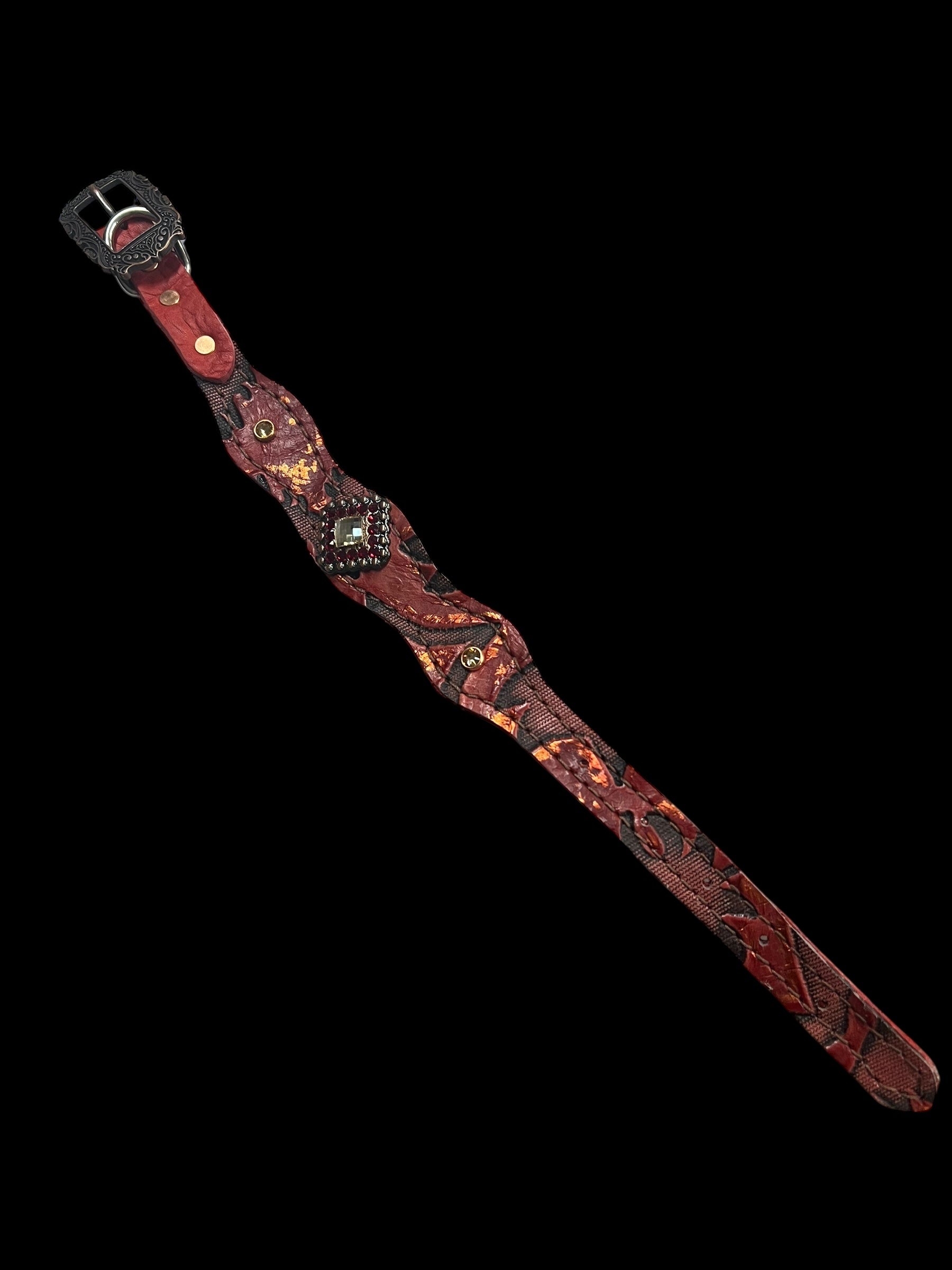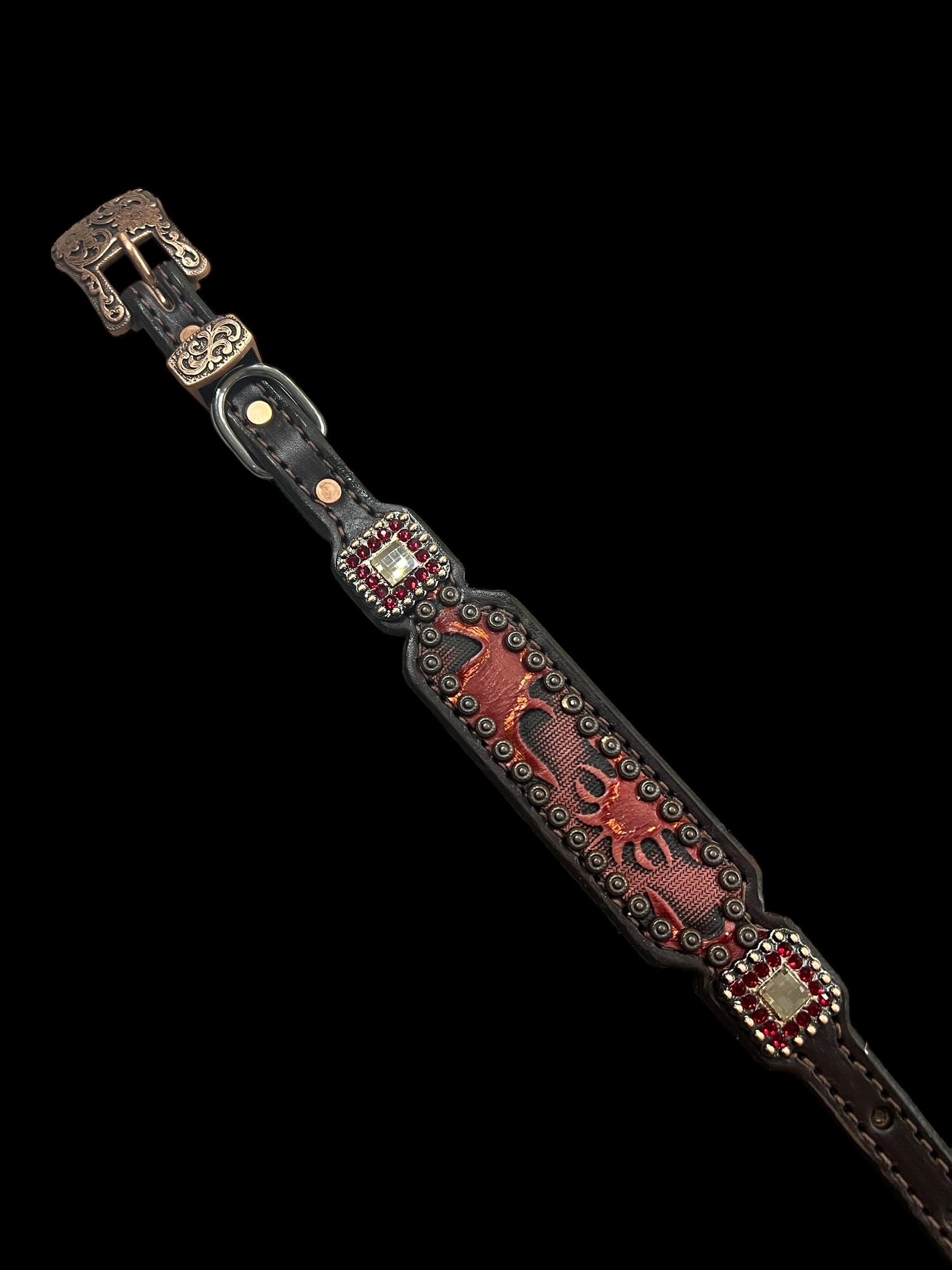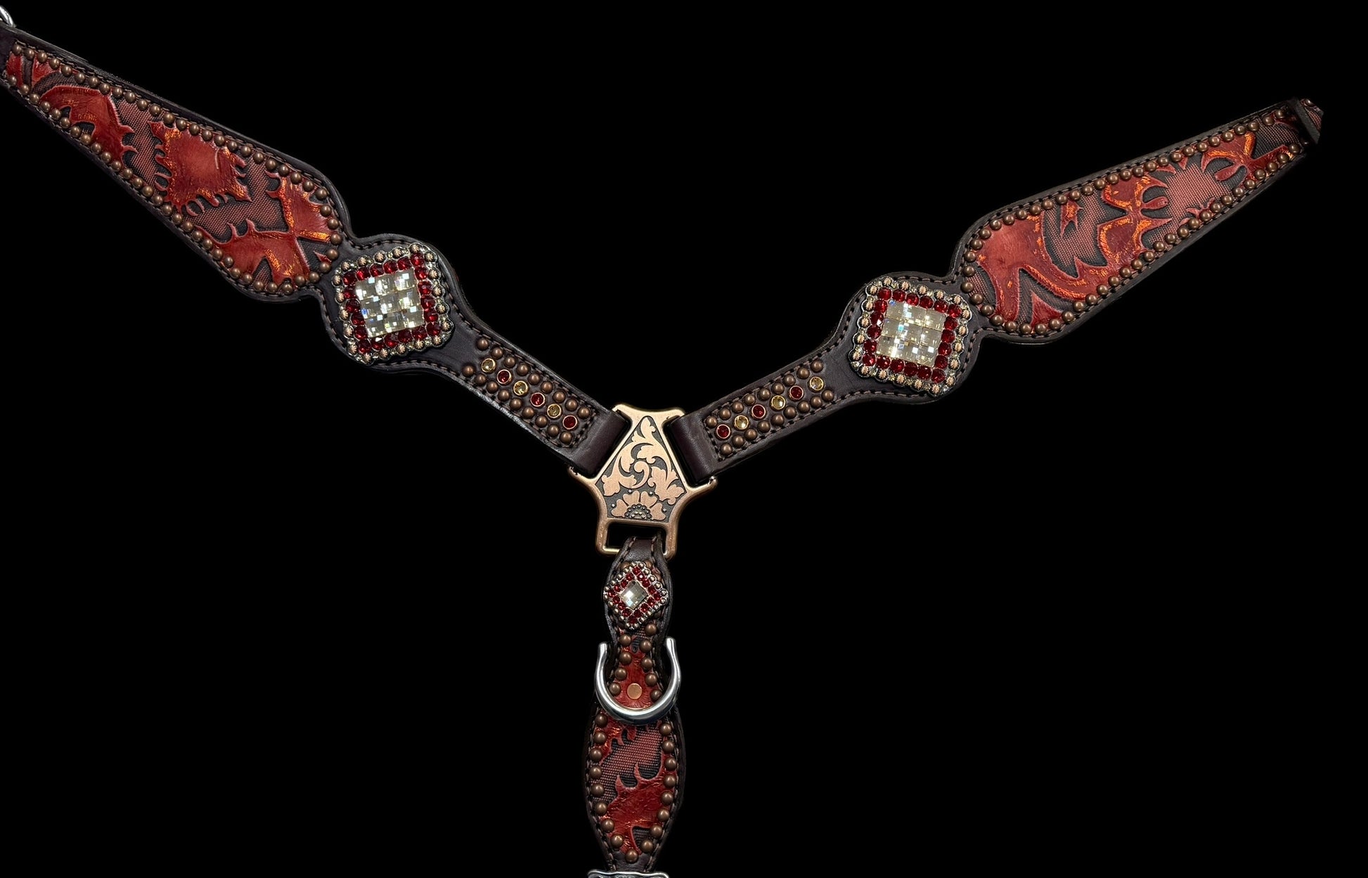 This ensemble features chocolate english bridle leather with red and copper Laredo embossed leather overlay, copper spots, and conchos with genuine rhinestones