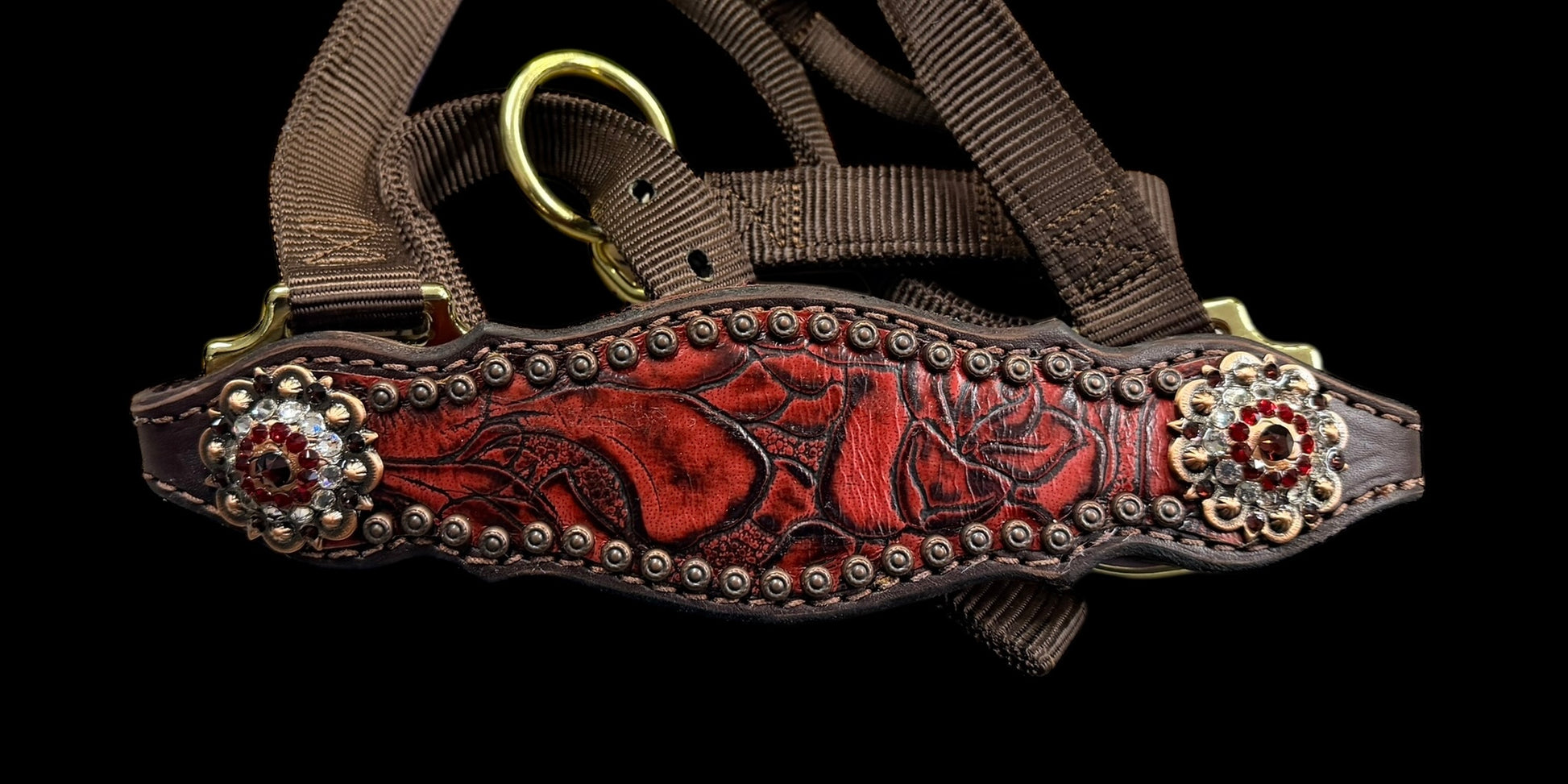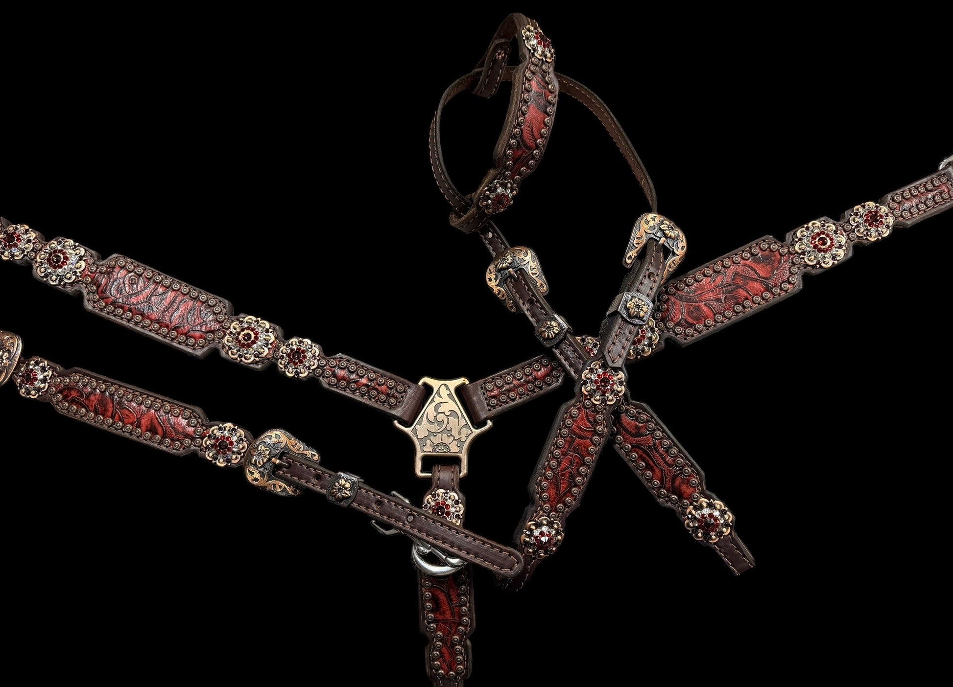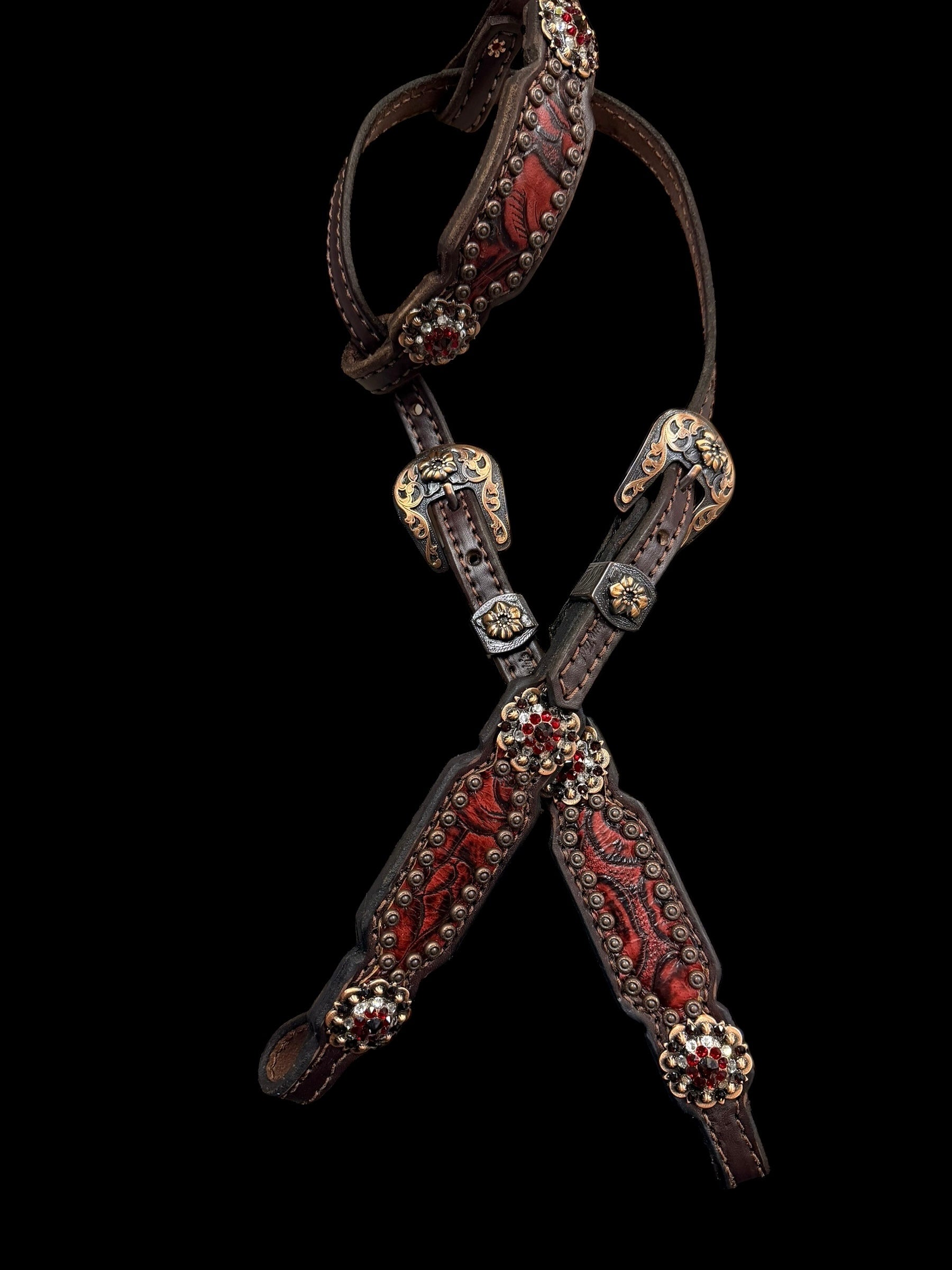 This ensemble features chocolate english bridle leather with red roses floral embossed leather overlay, copper spots, and conchos with Swarovski rhinestones.