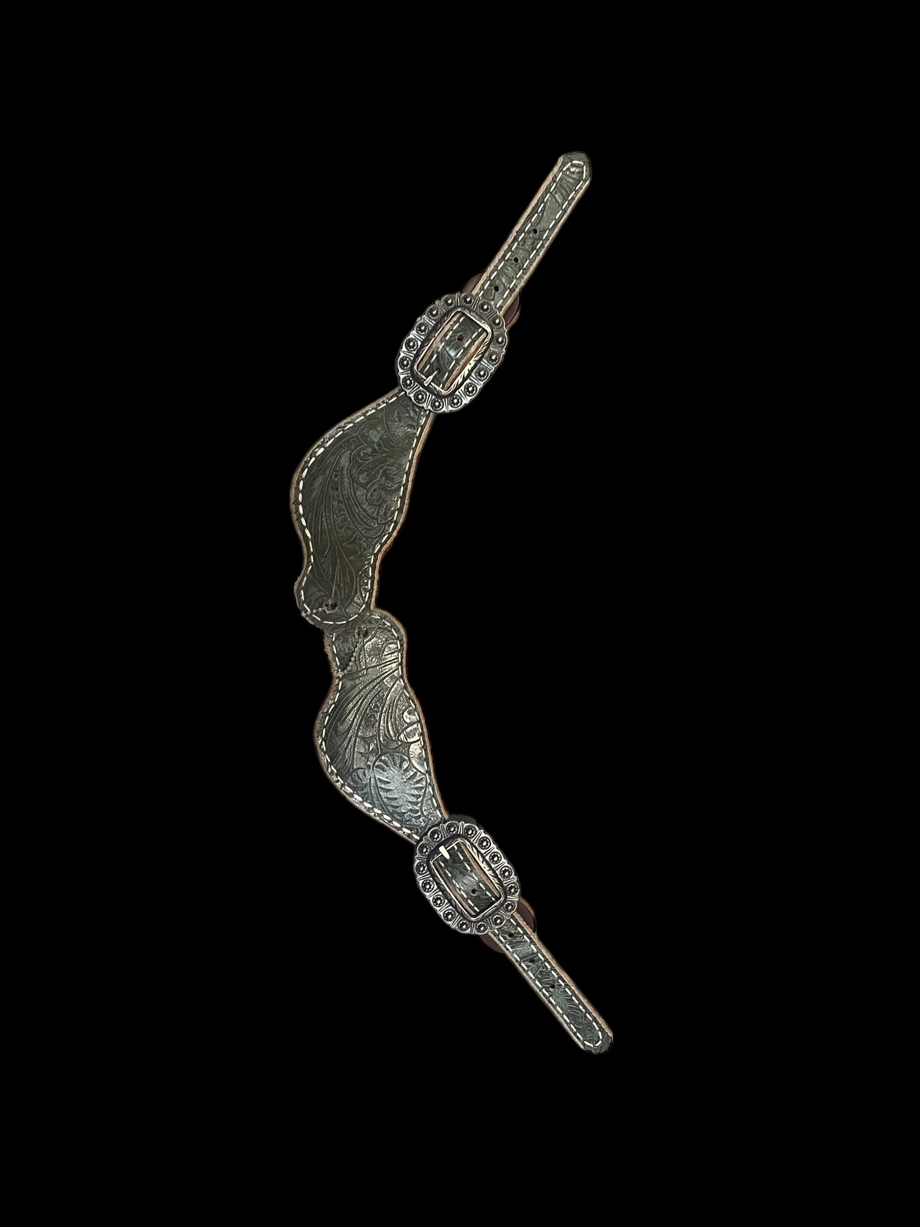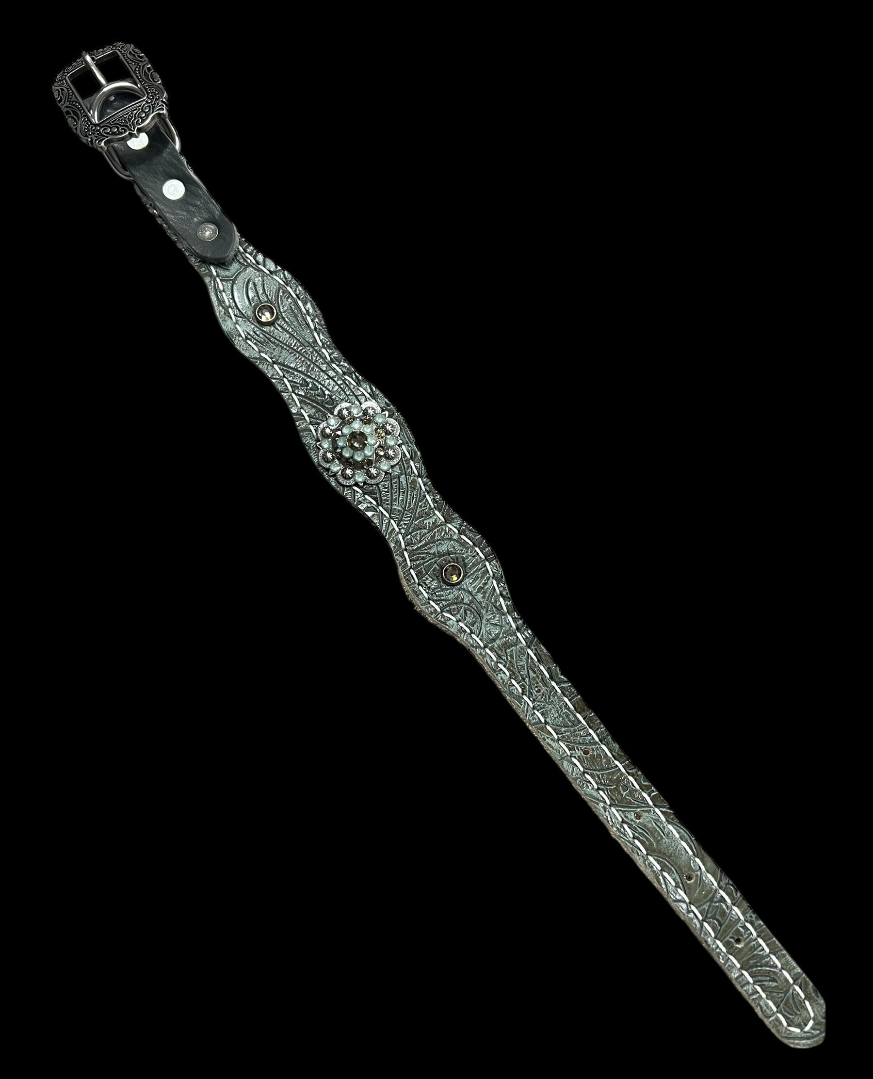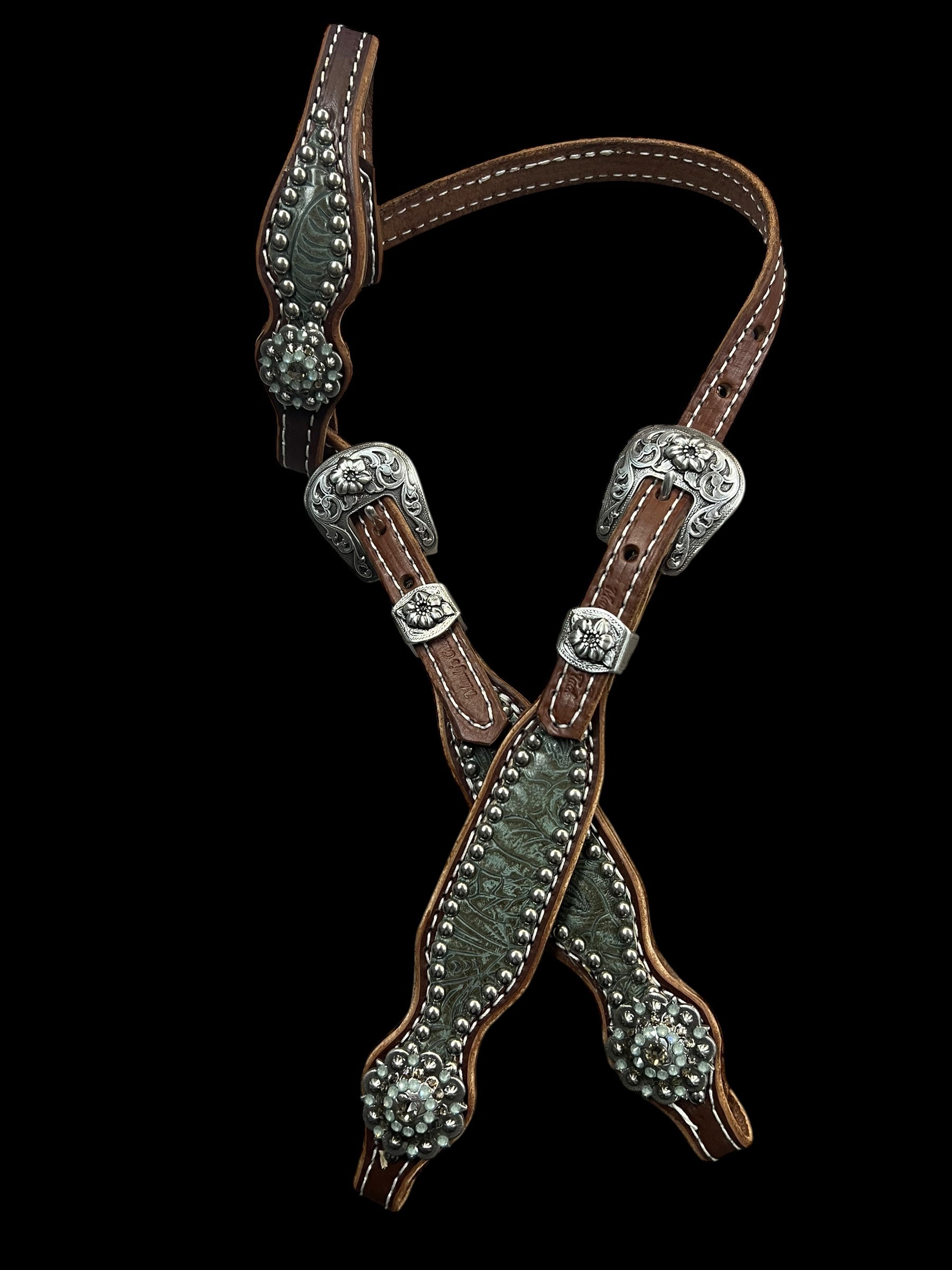 This ensemble features walnut english bridle leather with sage/grey dallas floral embossed leather overlay, stainless spots, and conchos with genuine rhinestones.