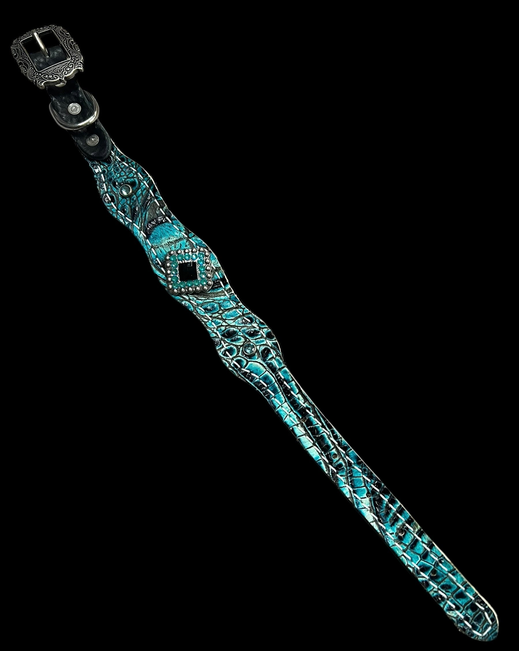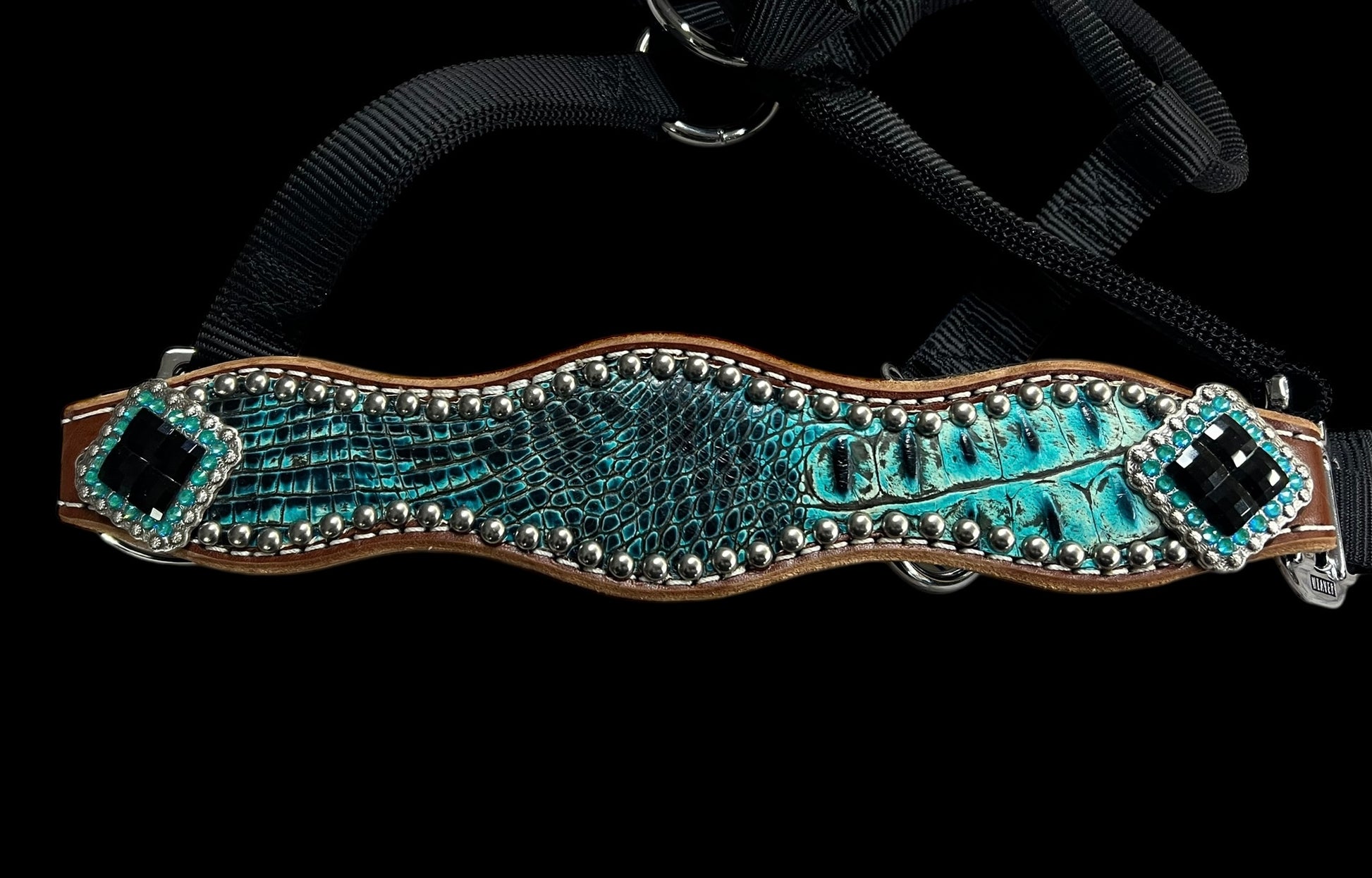 This ensemble features chocolate english bridle leather with turquoise and black gator embossed overlay, stainless spots, and conchos with genuine rhinestones.