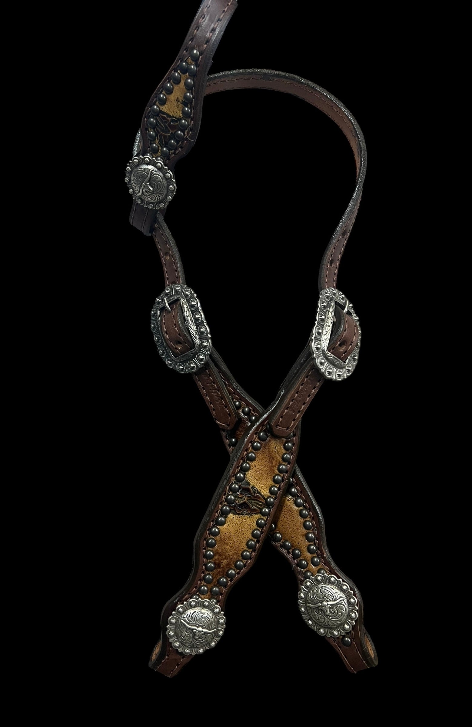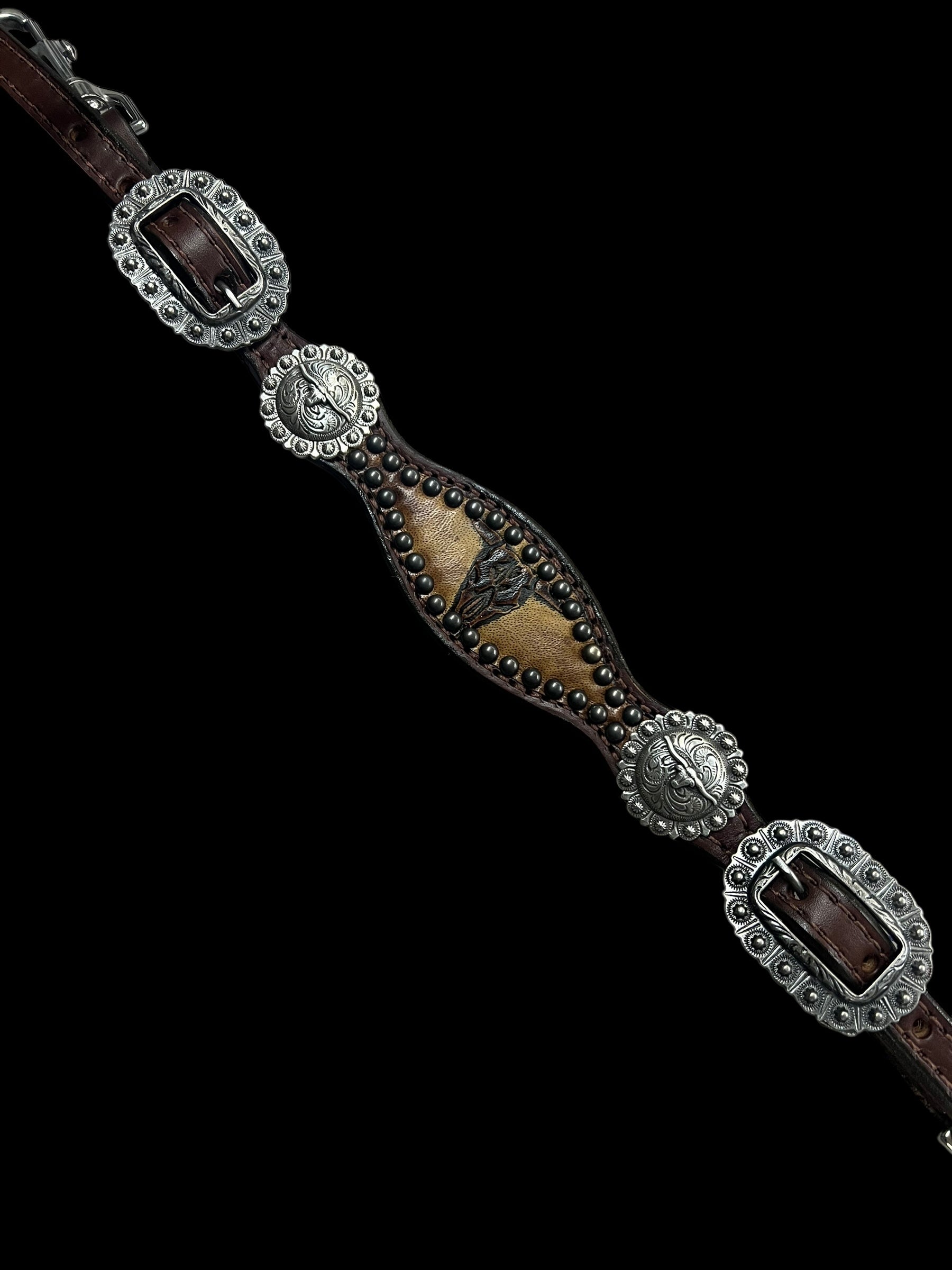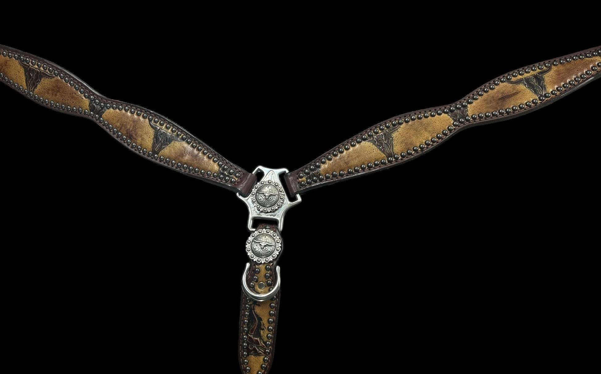 This ensemble features walnut English bridle leather with Sepia longhorn embossed leather overlay, antique spots, and longhorn conchos