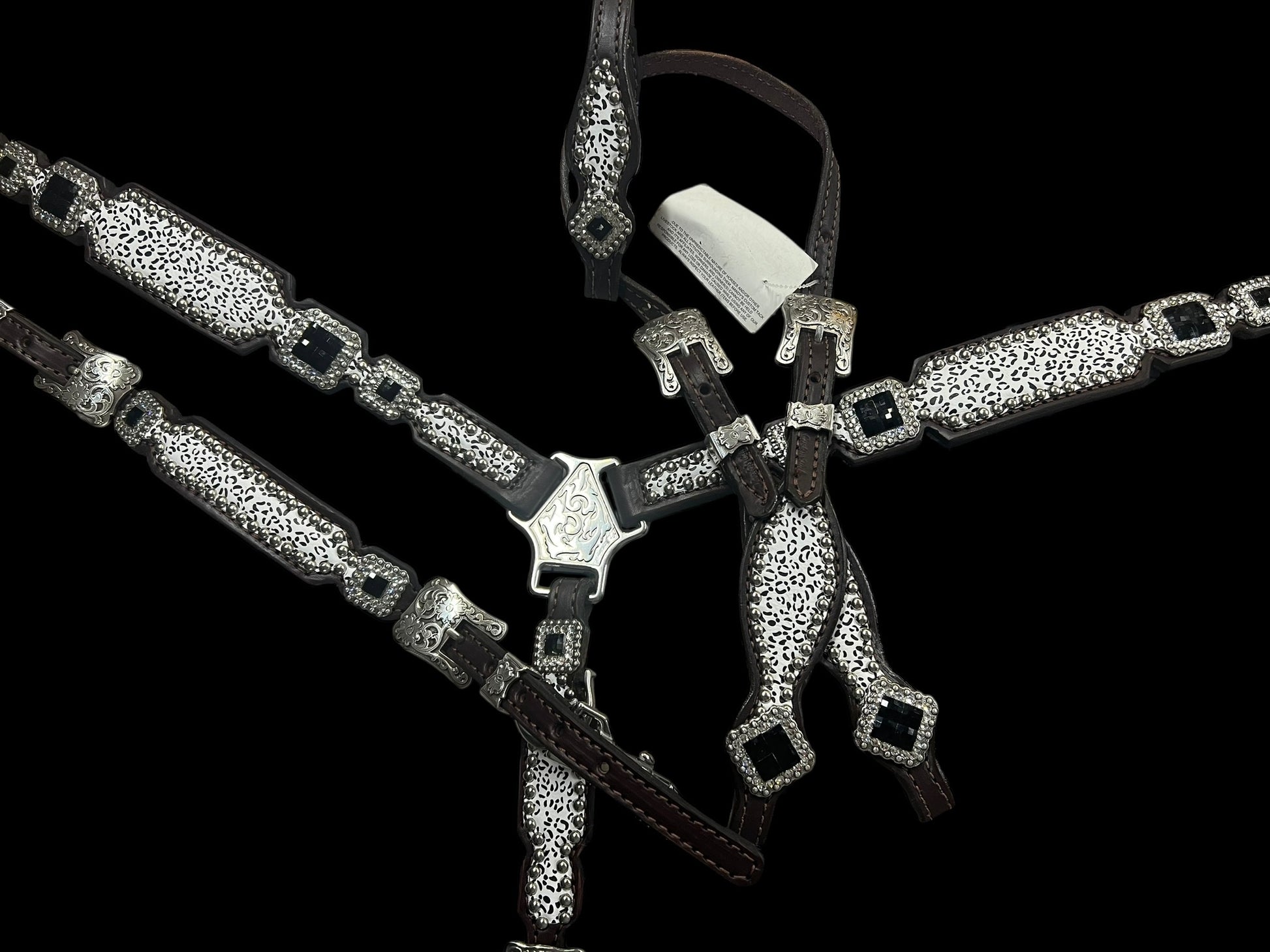 This ensemble features dark brown english bridle leather with snow leopard print leather overlay, stainless spots, and conchos with genuine rhinestones.