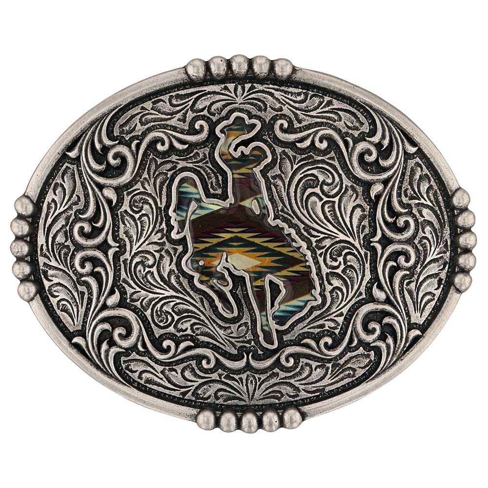 There is nothing like a Western sunrise and this Sunrise Bronc Attitude Buckle captures a fraction of its beauty. The antiqued silver tone buckle contains both etched and raised filigree creating a dynamic backdrop for the silhouette of a rider upon a bucking bronco. A Southwestern pattern filled with tones of red, yellow, orange and green fills the silhouette figure. This buckle is perfect for any occasion with a pop of subtle color. Standard 1.5 inch swivel.