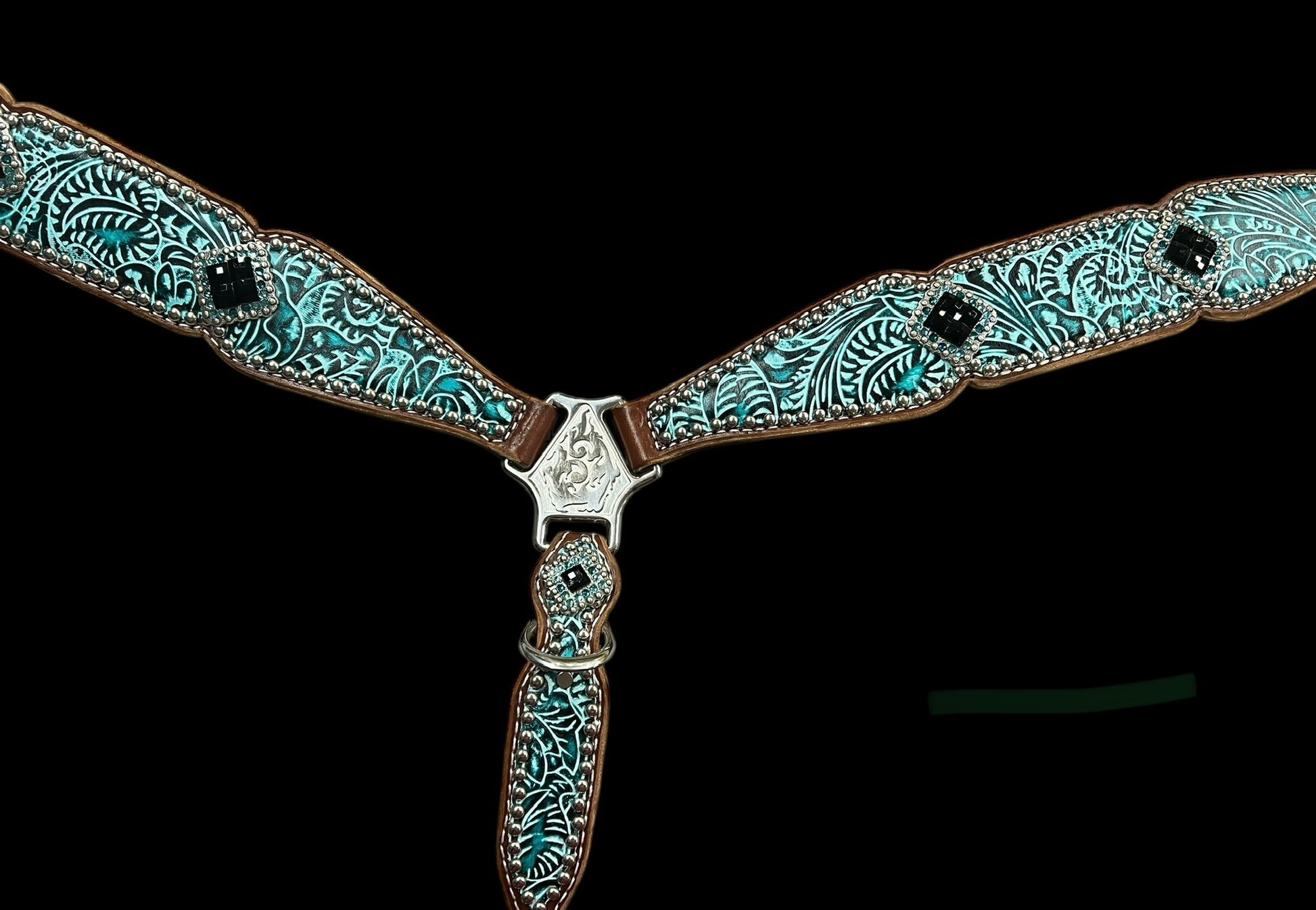 This ensemble features medium english bridle leather with teal and black floral embossed leather overlay, stainless spots, and conchos with genuine rhinestones