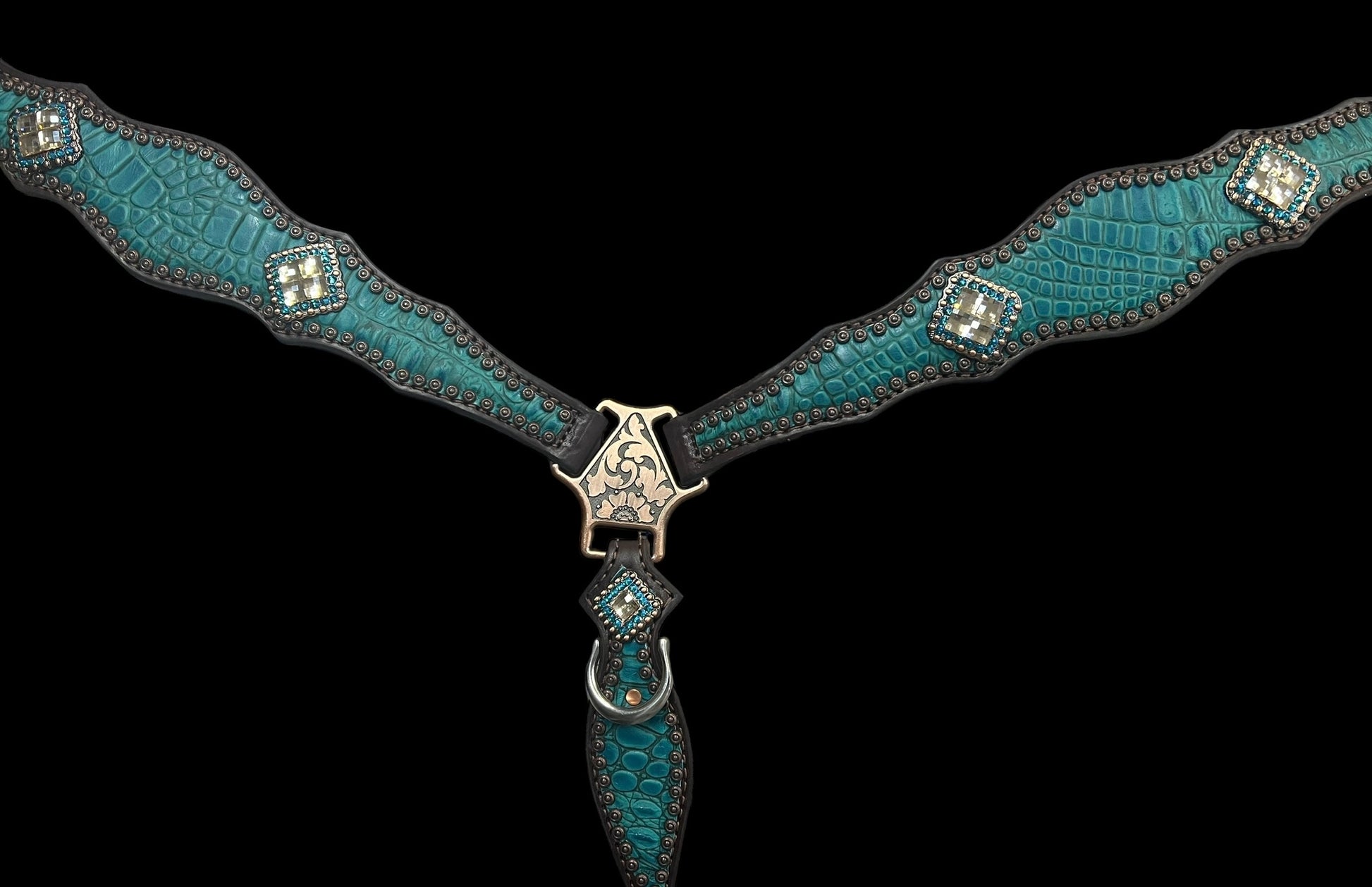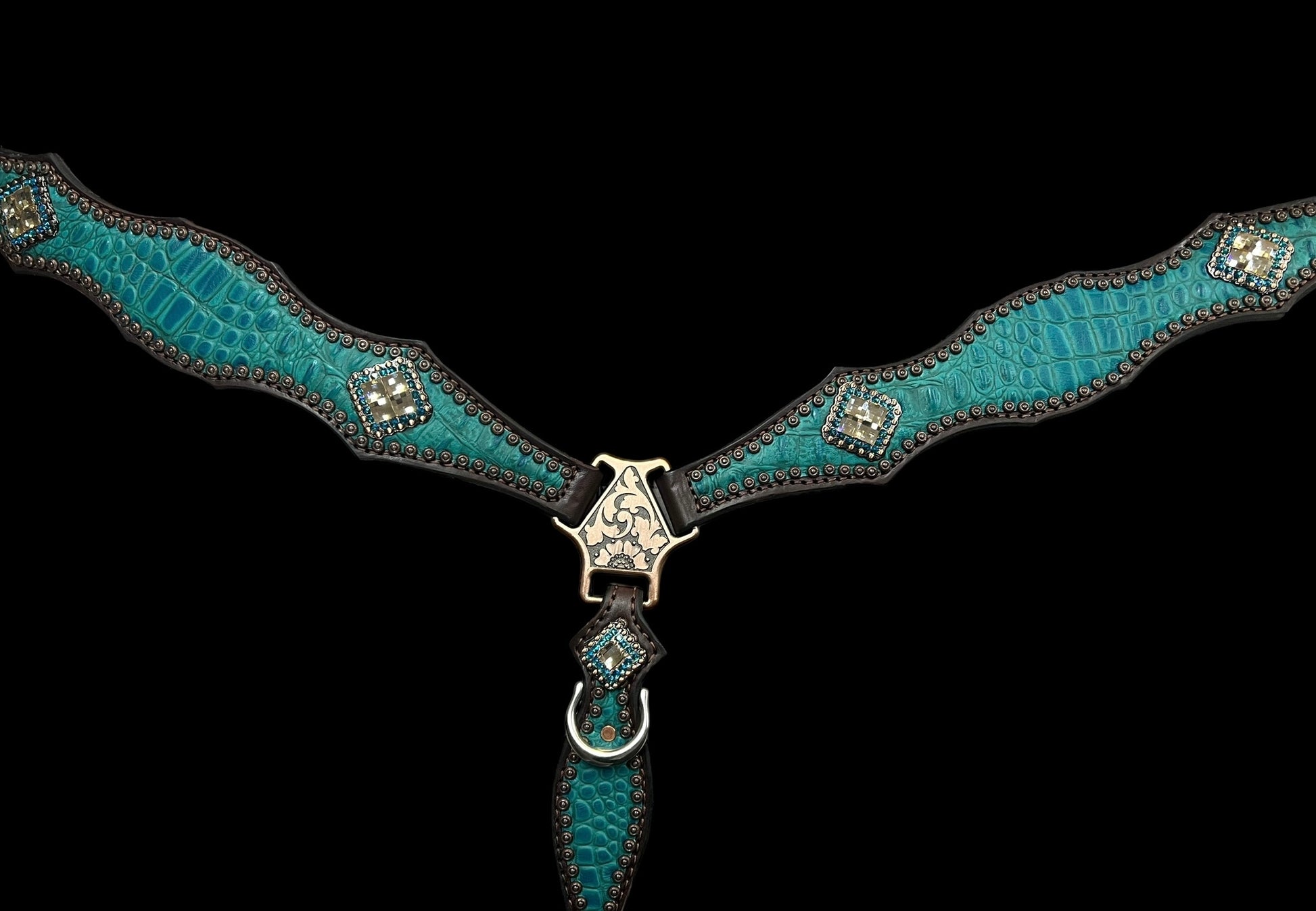 This ensembles features chocolate brown English bridle leather with teal gator embossed leather overlay, copper spots, and conchos with Swarovski rhinestones.