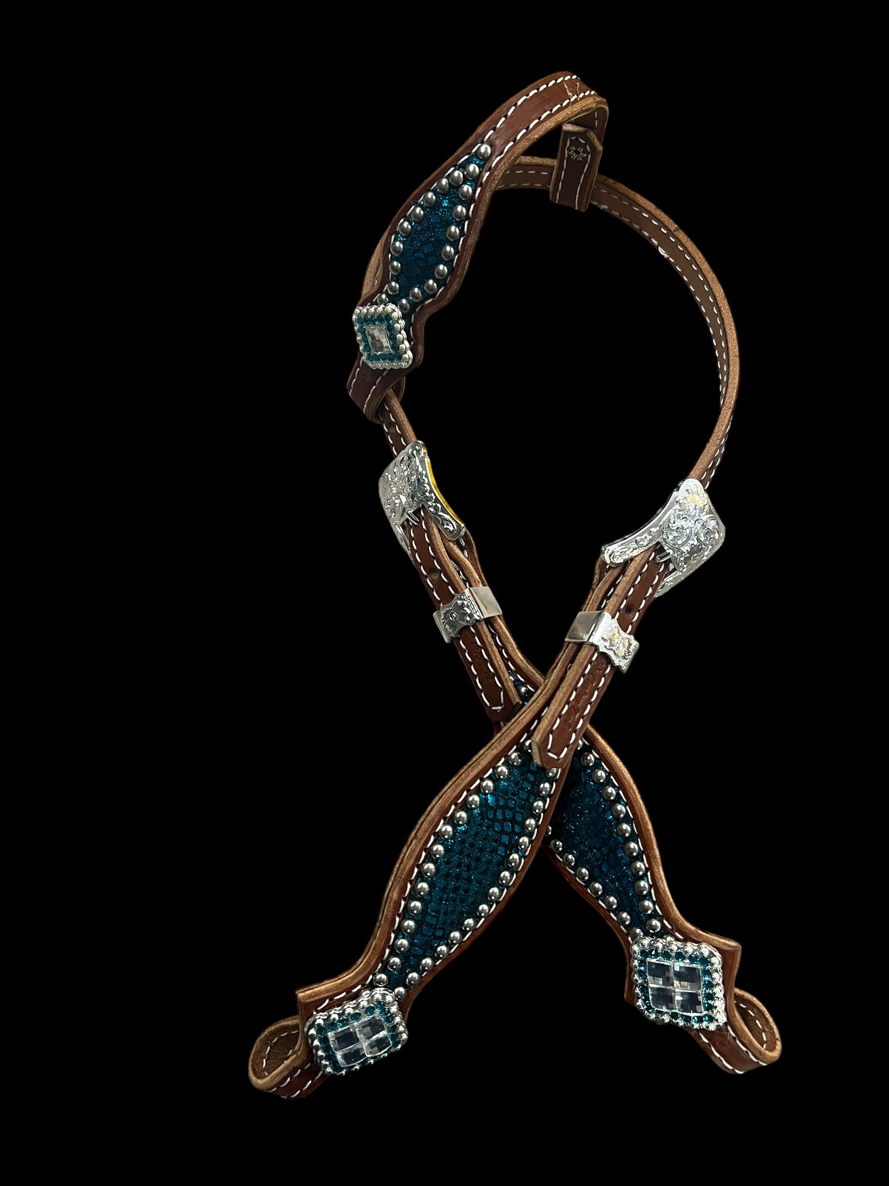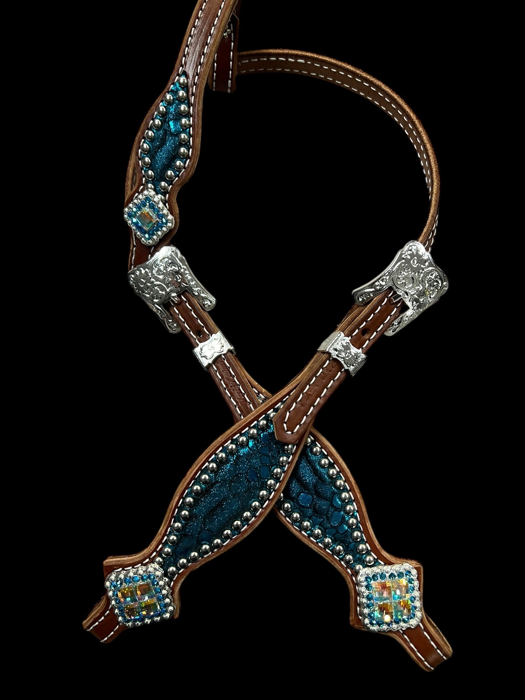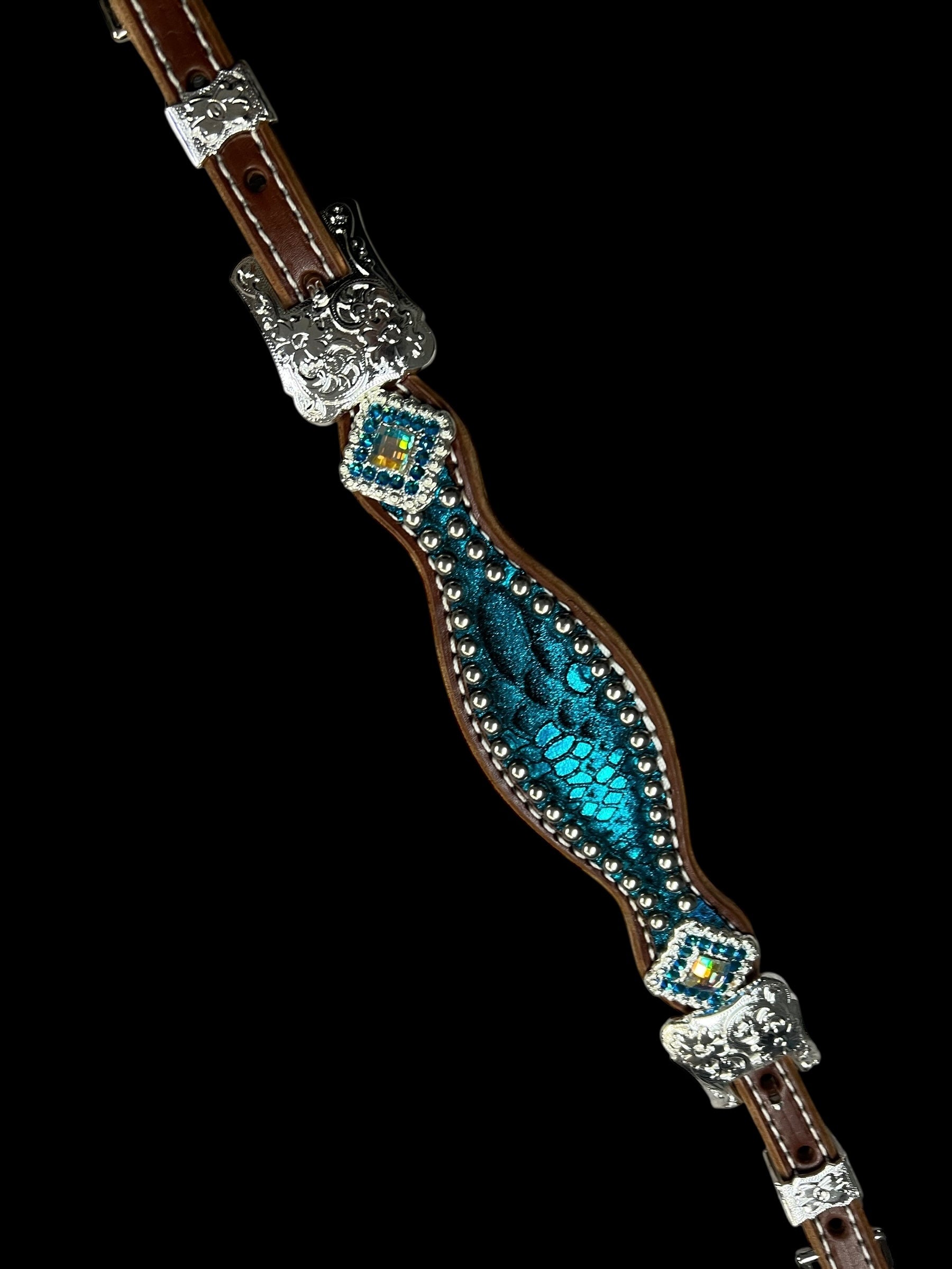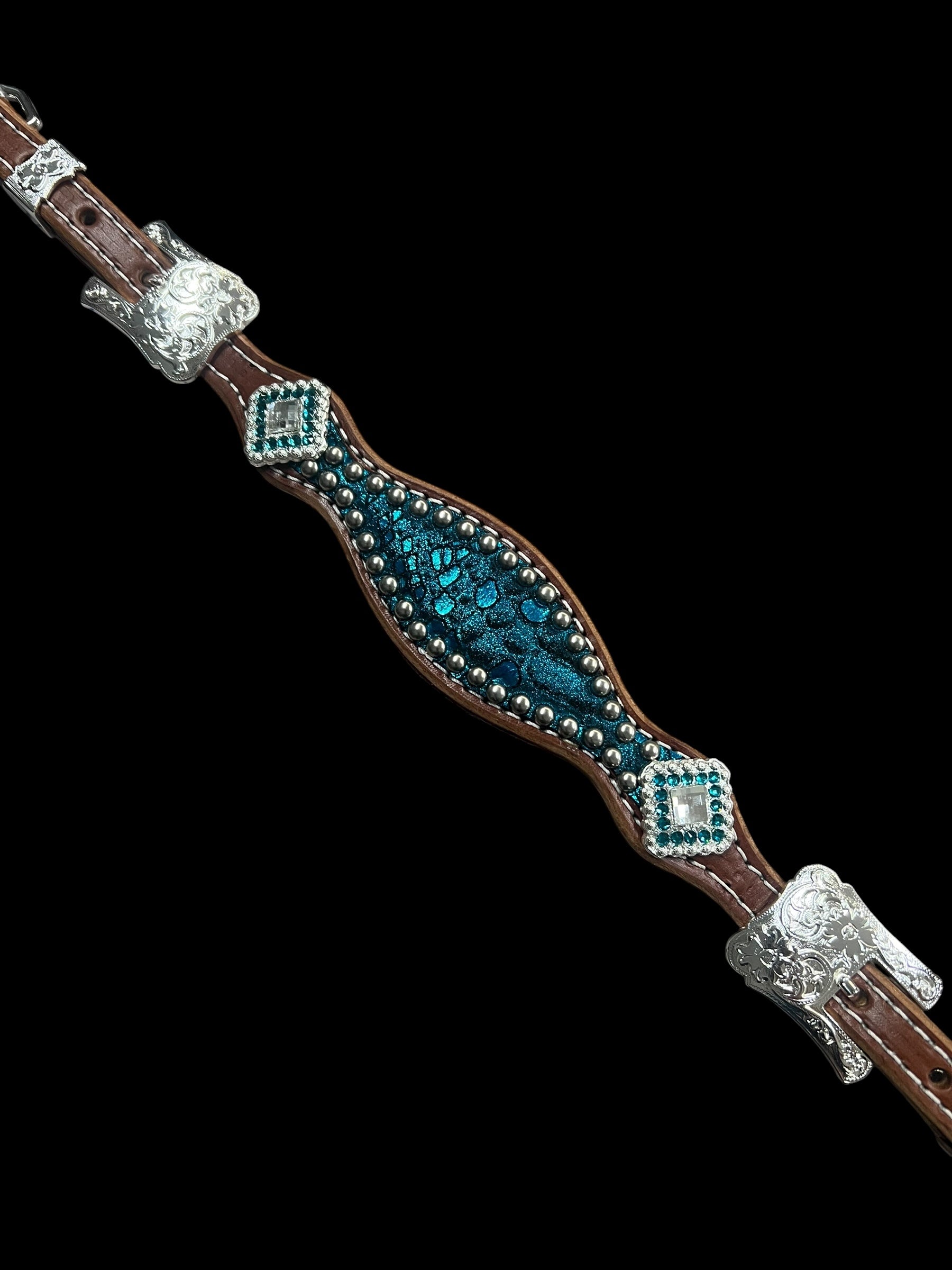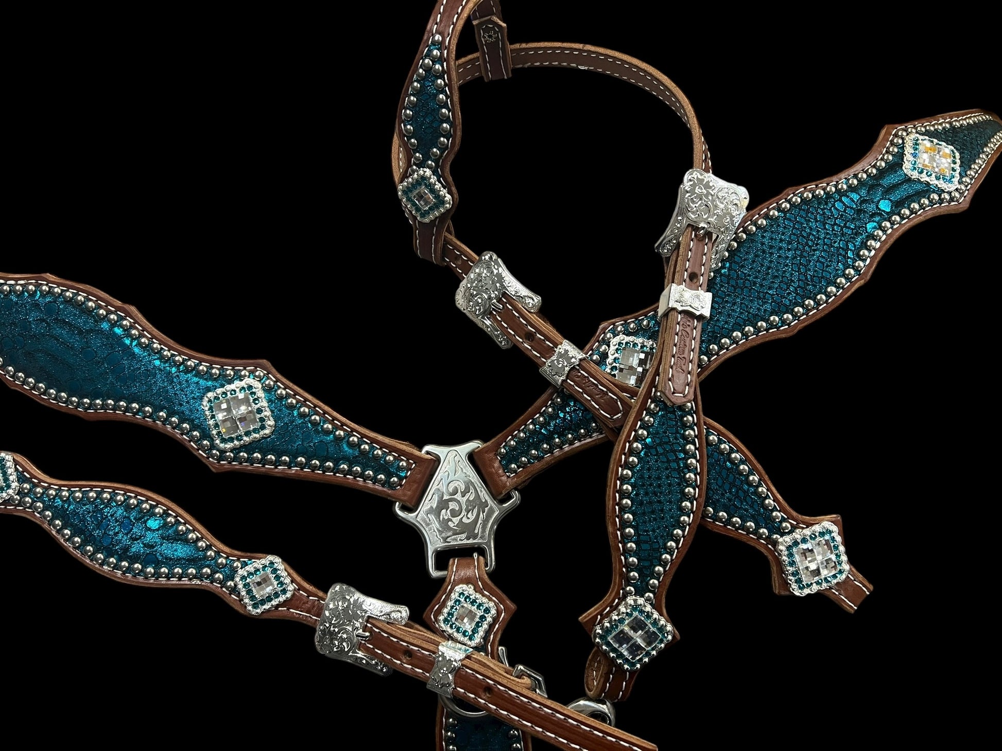 This ensemble features medium english bridle leather with teal mystic suede leather overlay, stainless spots, and conchos with genuine rhinestones.