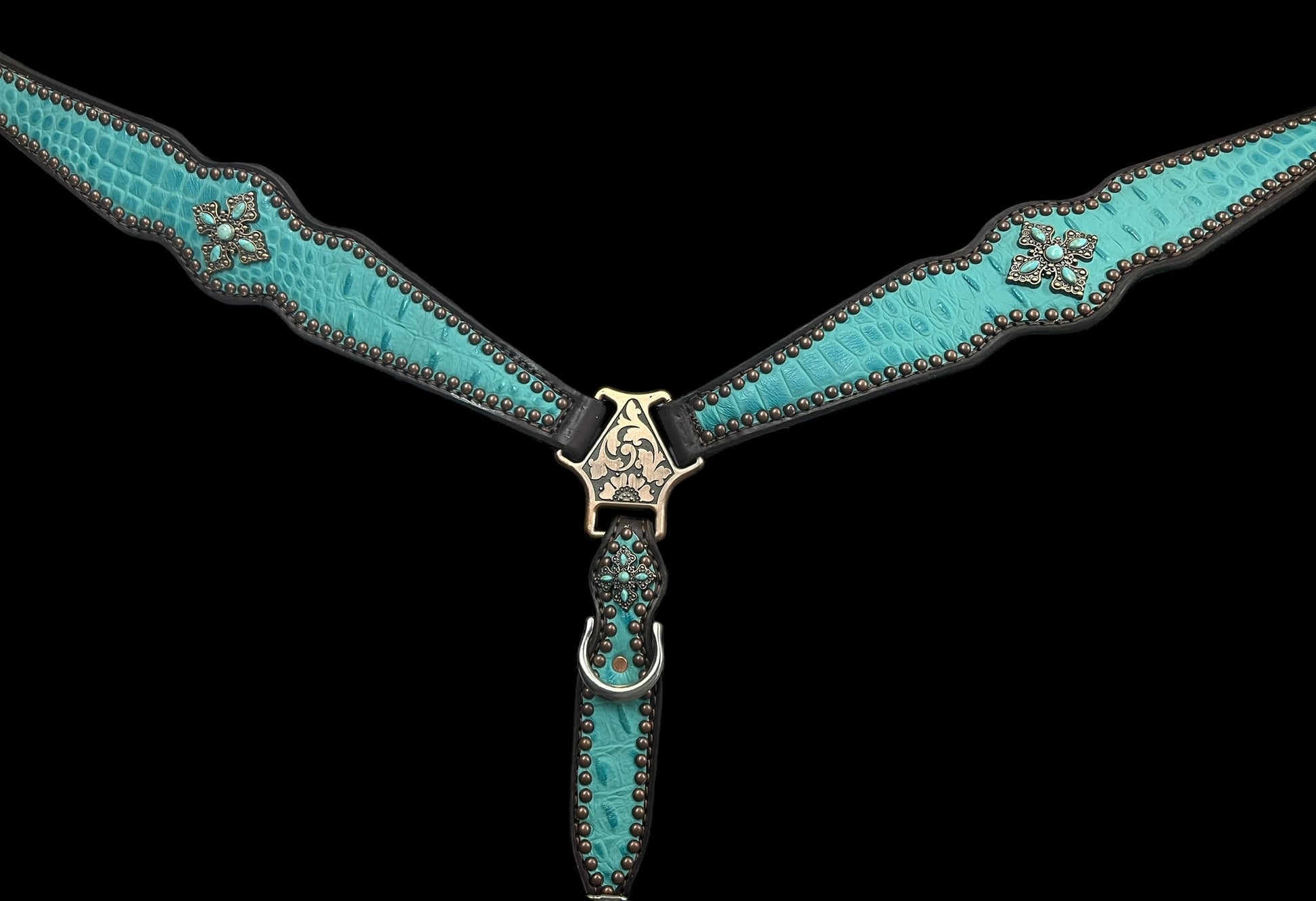 This ensemble features chocolate english bridle leather with turquoise gator embossed leather overlay, copper spots, and conchos with turquoise stones.