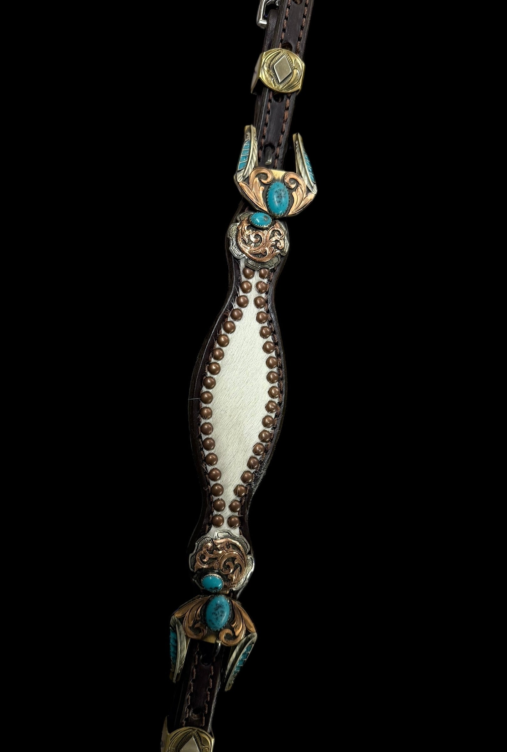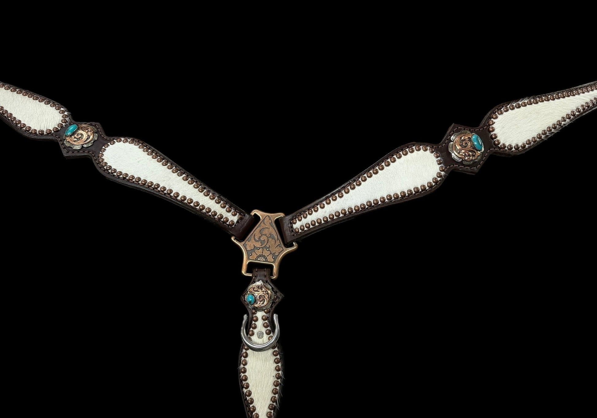 This ensemble features dark english bridle leather with white and grey brindle hair on hide leather overlay, copper spots, and handmade conchos and buckles