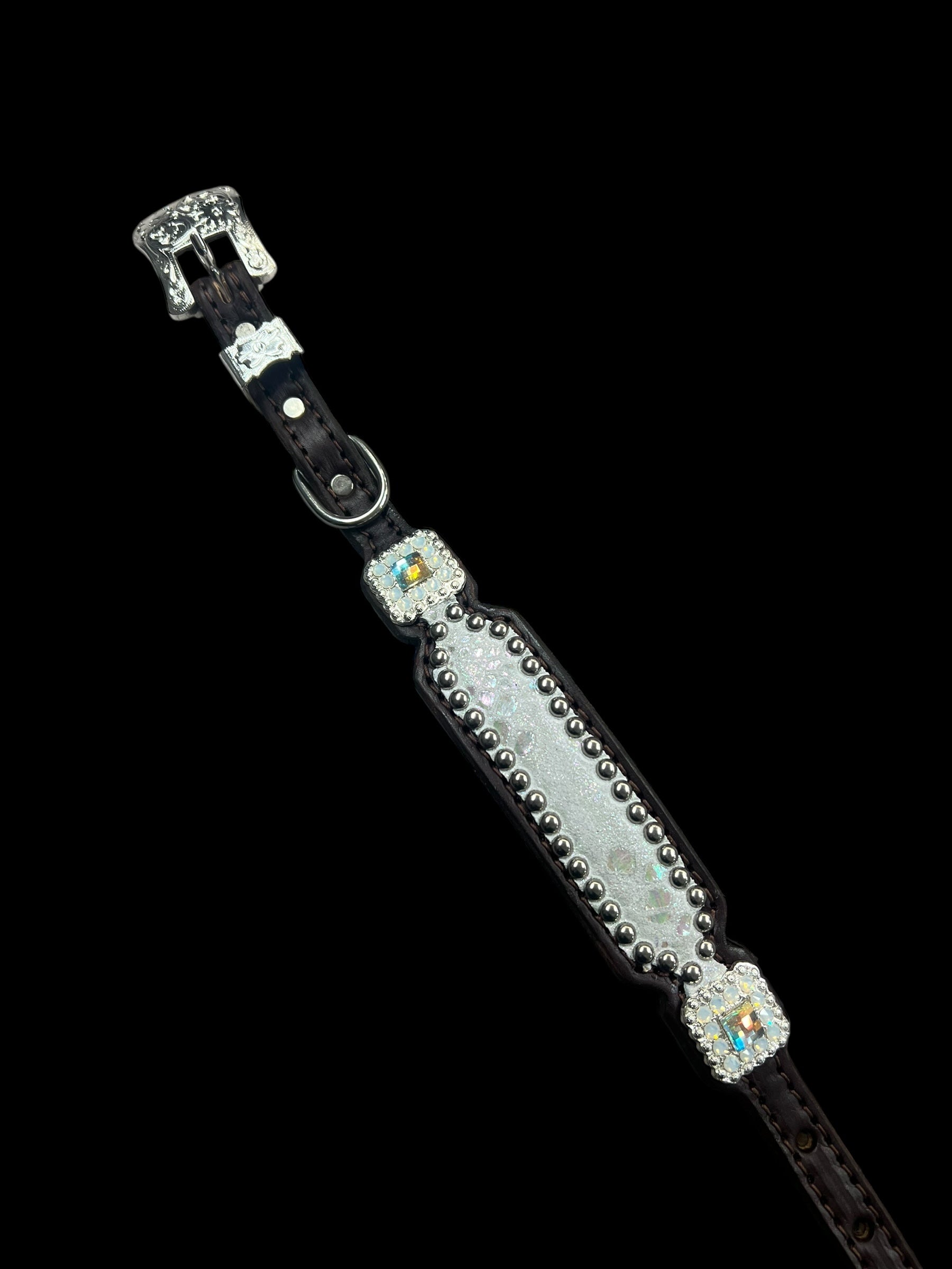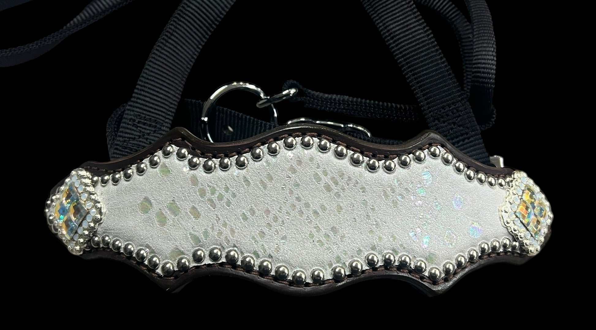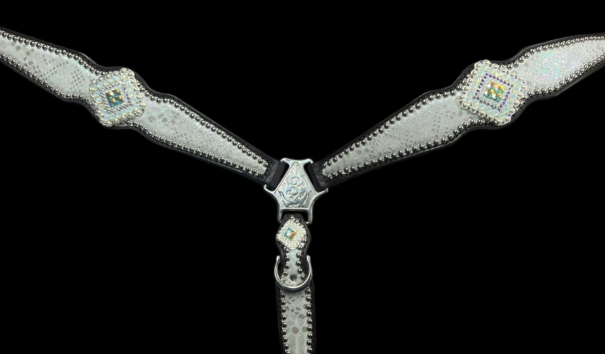 This ensemble features dark chocolate english bridle leather with iridescent mystic python print leather overlay, stainless spots, and conchos with Swarovski rhinestones.