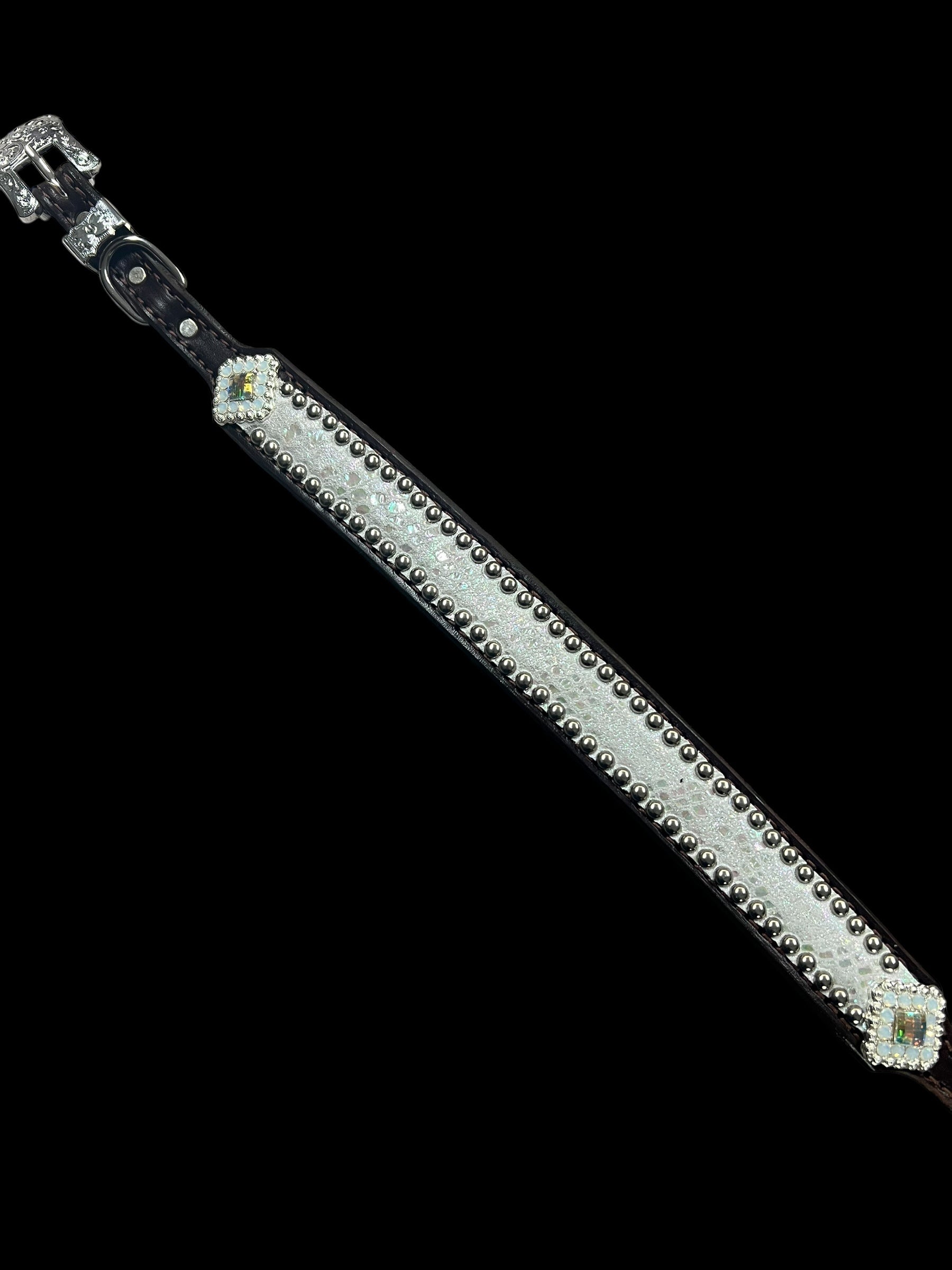 This ensemble features dark chocolate english bridle leather with iridescent mystic python print leather overlay, stainless spots, and conchos with Swarovski rhinestones.