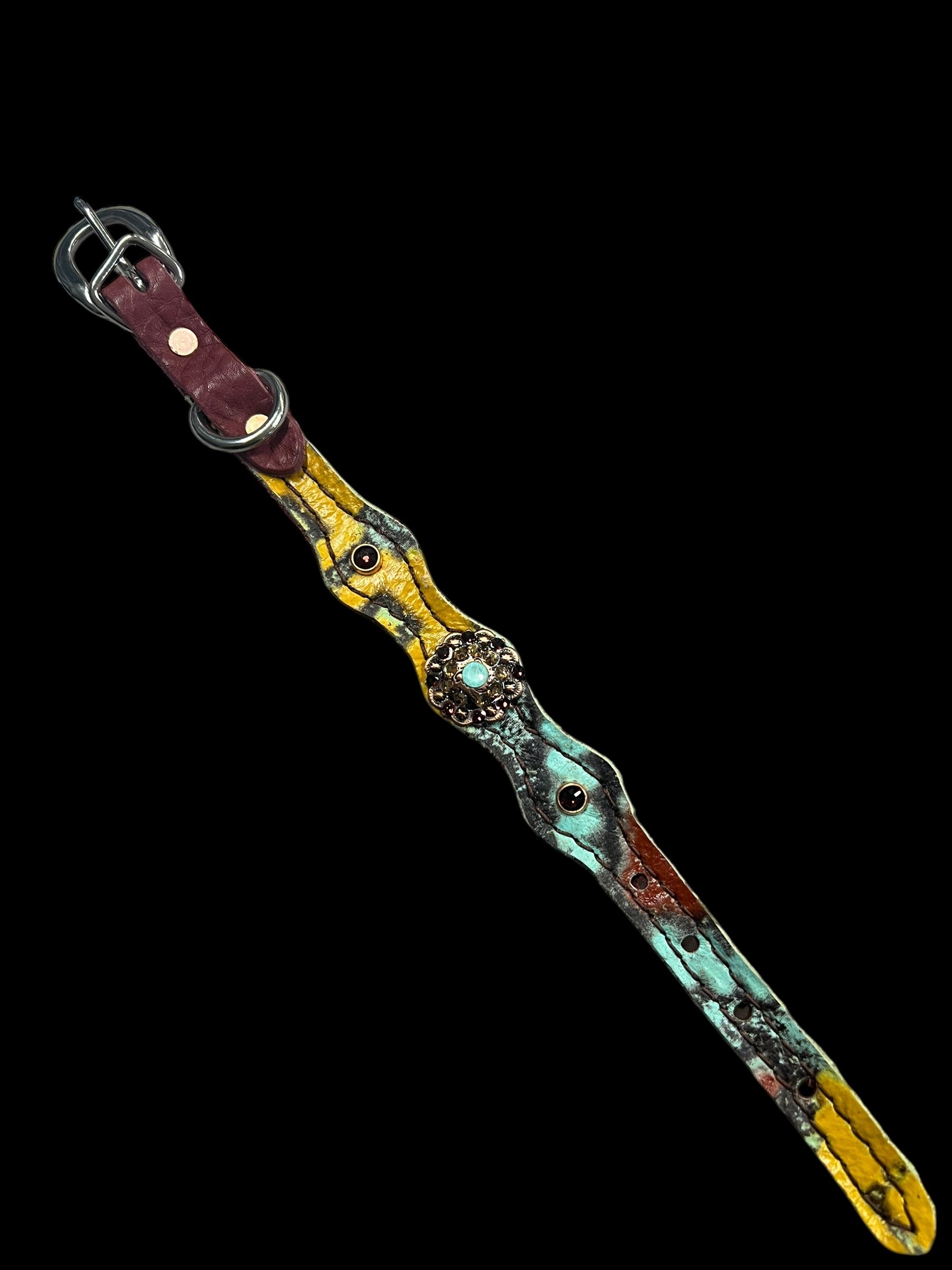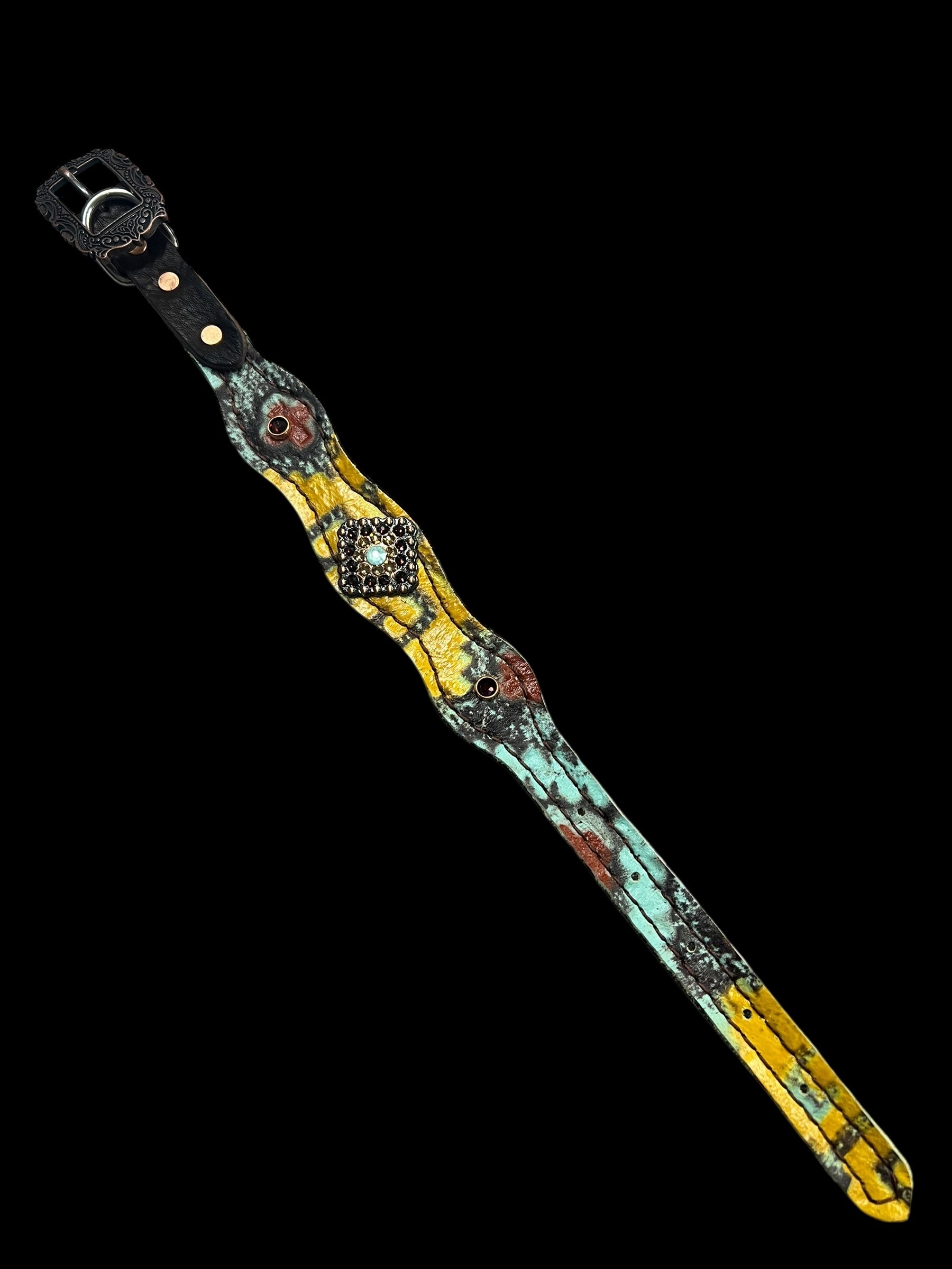 This ensemble features dark chocolate english bridle leather with mint, yellow, and brick red Taos embossed leather overlay, copper spots, and copper conchos with genuine rhinestones.